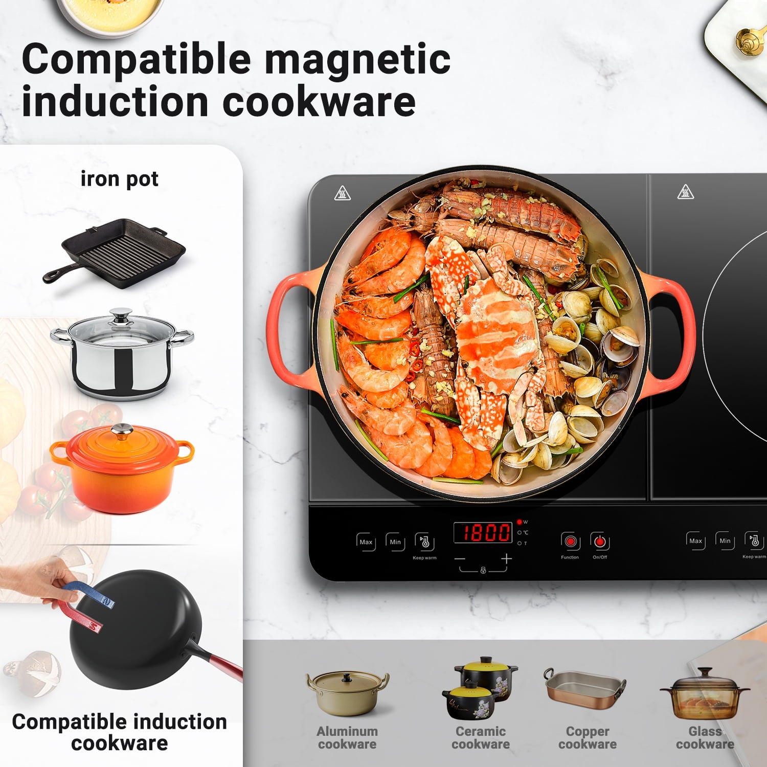 - 🔥【Highly Efficient & Energy Saving】Portable Dual Induction Cooker Heating the pot directly! The 1800W induction hob cooks food by using electromagnetic induction heating, so no heat is lost between the cooking surface. We add a safety system, automatic pot detection, and overheating protection. With no open flames or hot coils, it cooks faster with virtually no wasted heat and is safer than any traditional gas stovetop.