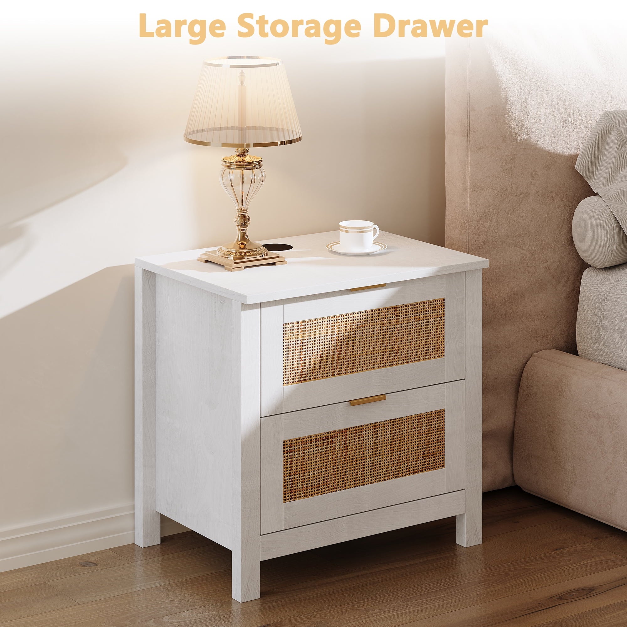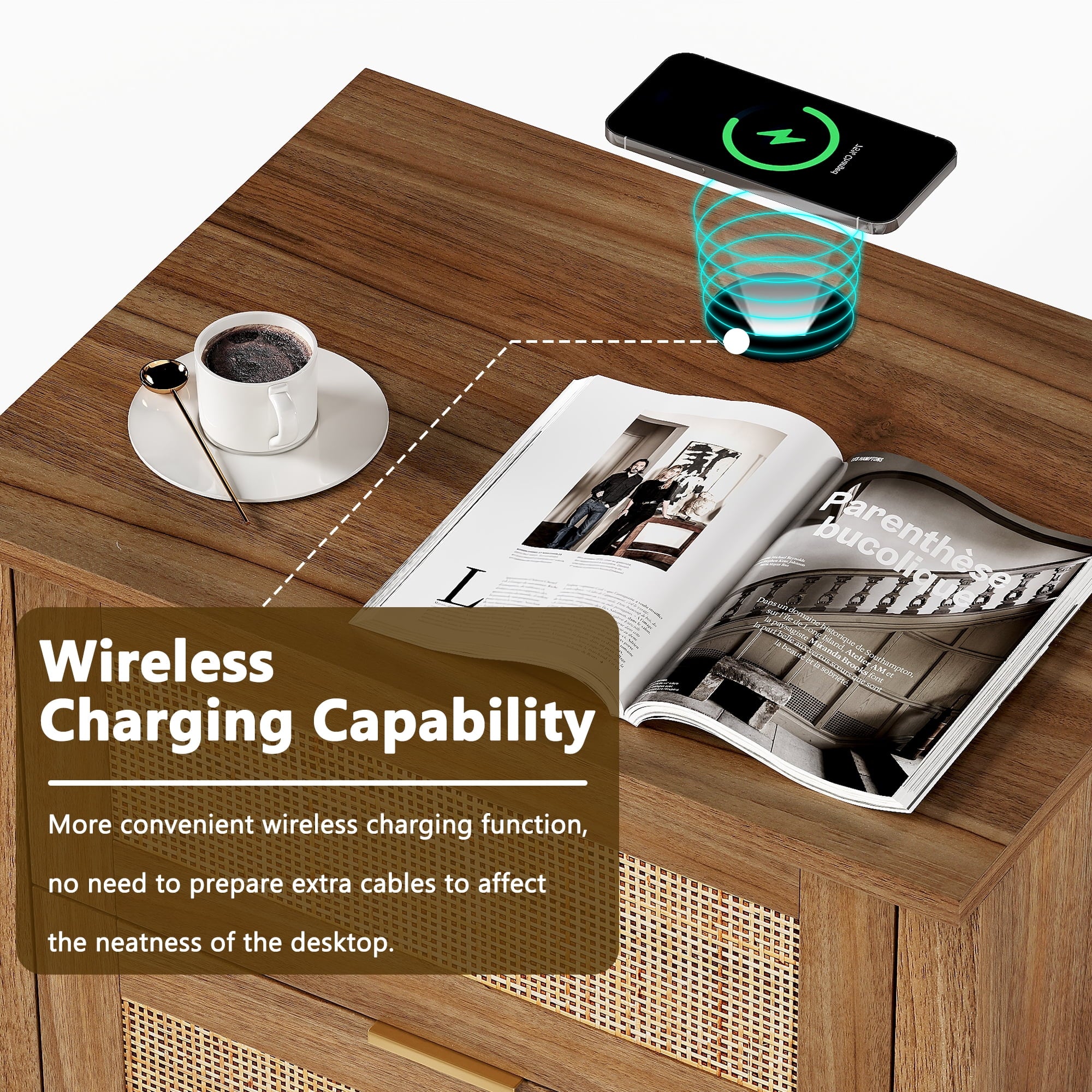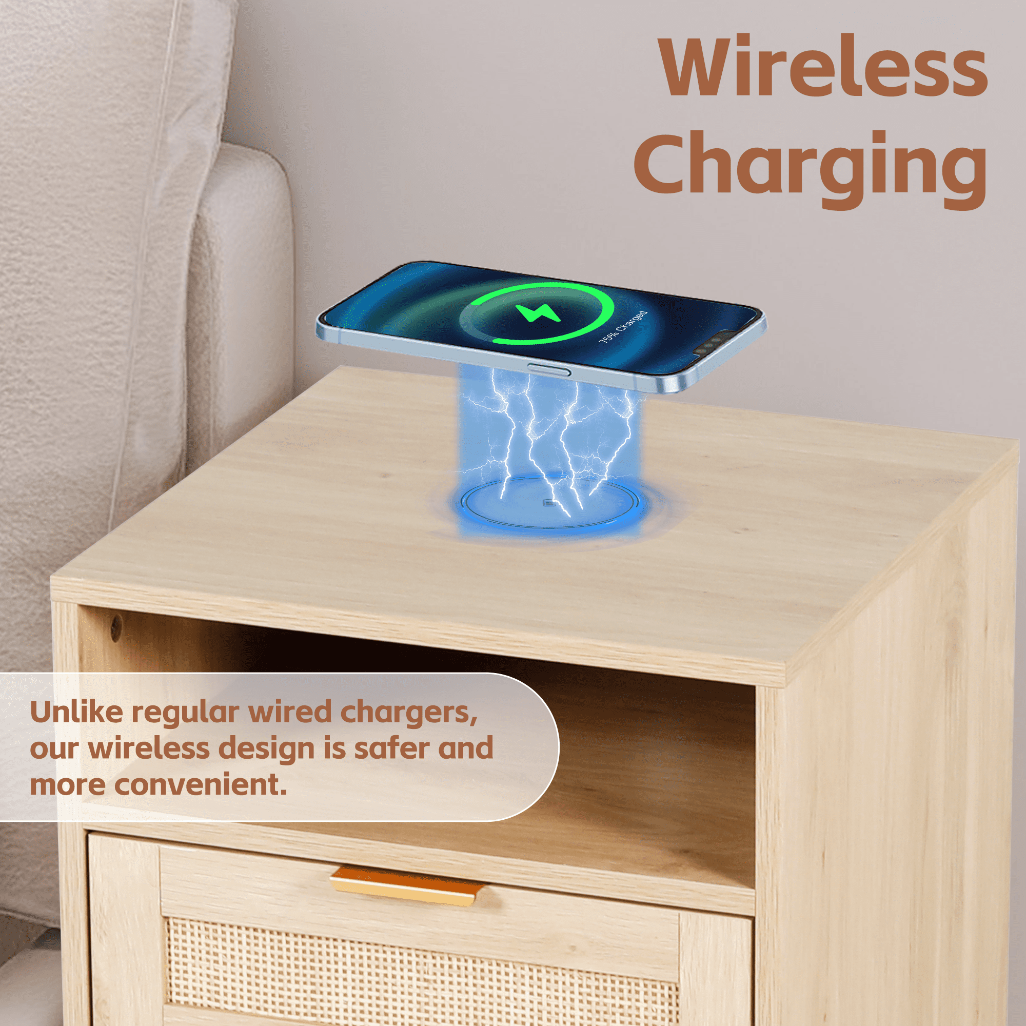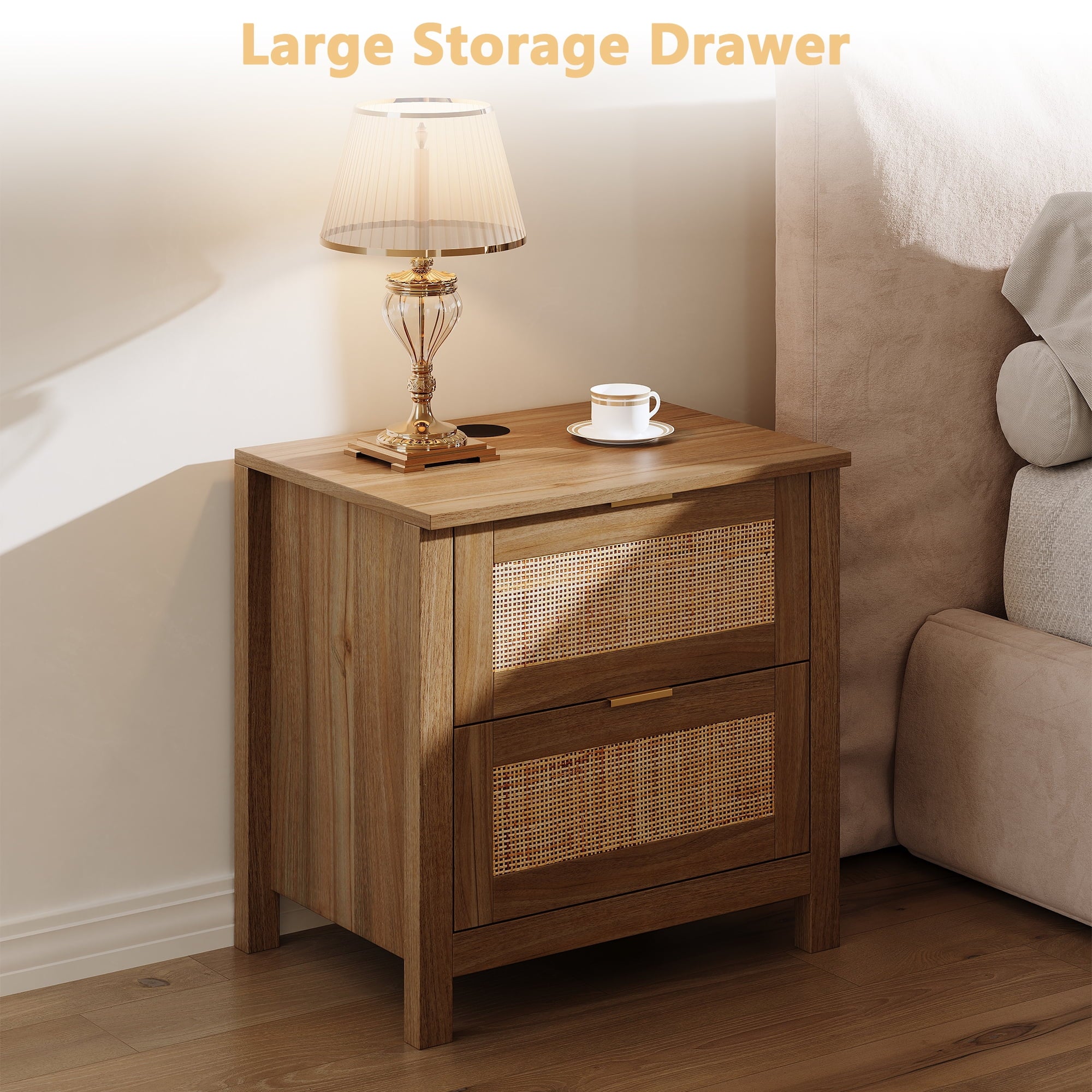- Wooden nightstand 2-piece set with oversized drawers and desktop provides ample storage space for your bedside essentials and ensures that your bedroom is neat and organized. Featuring a wireless charging station, you can conveniently charge your devices, feature only available for cell phones and electronics with wireless charging capability.