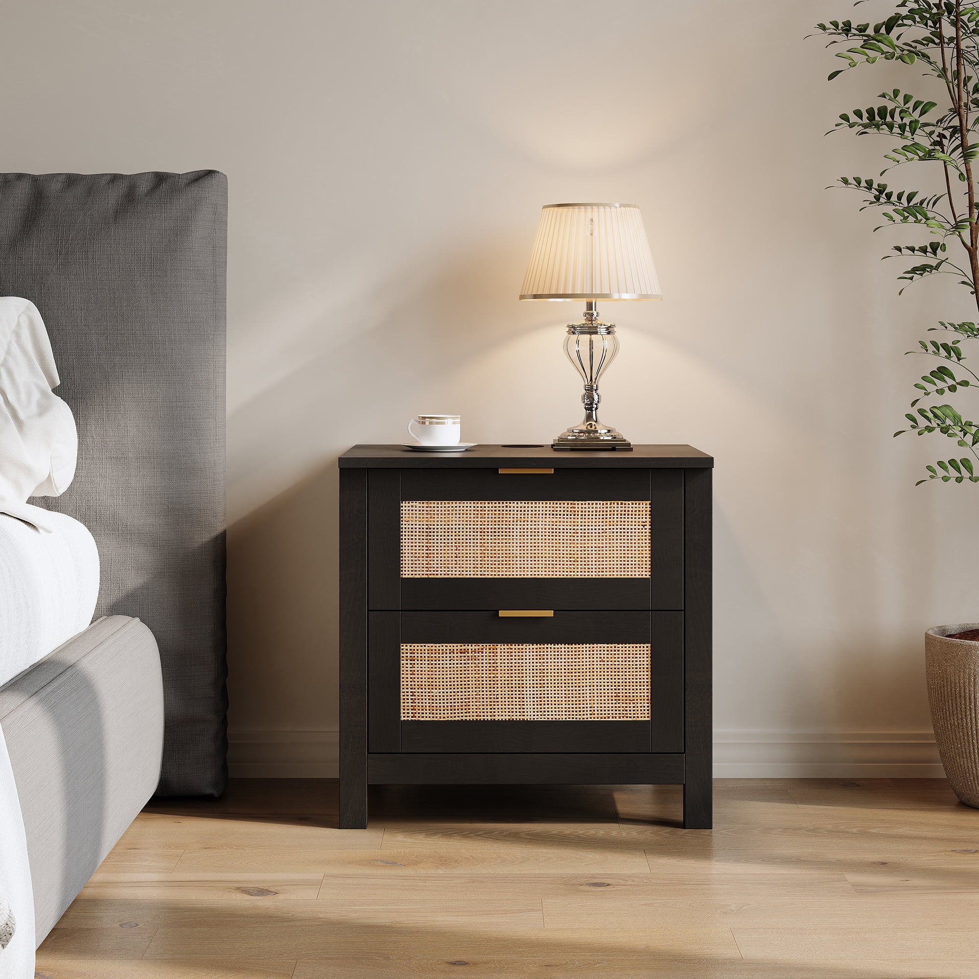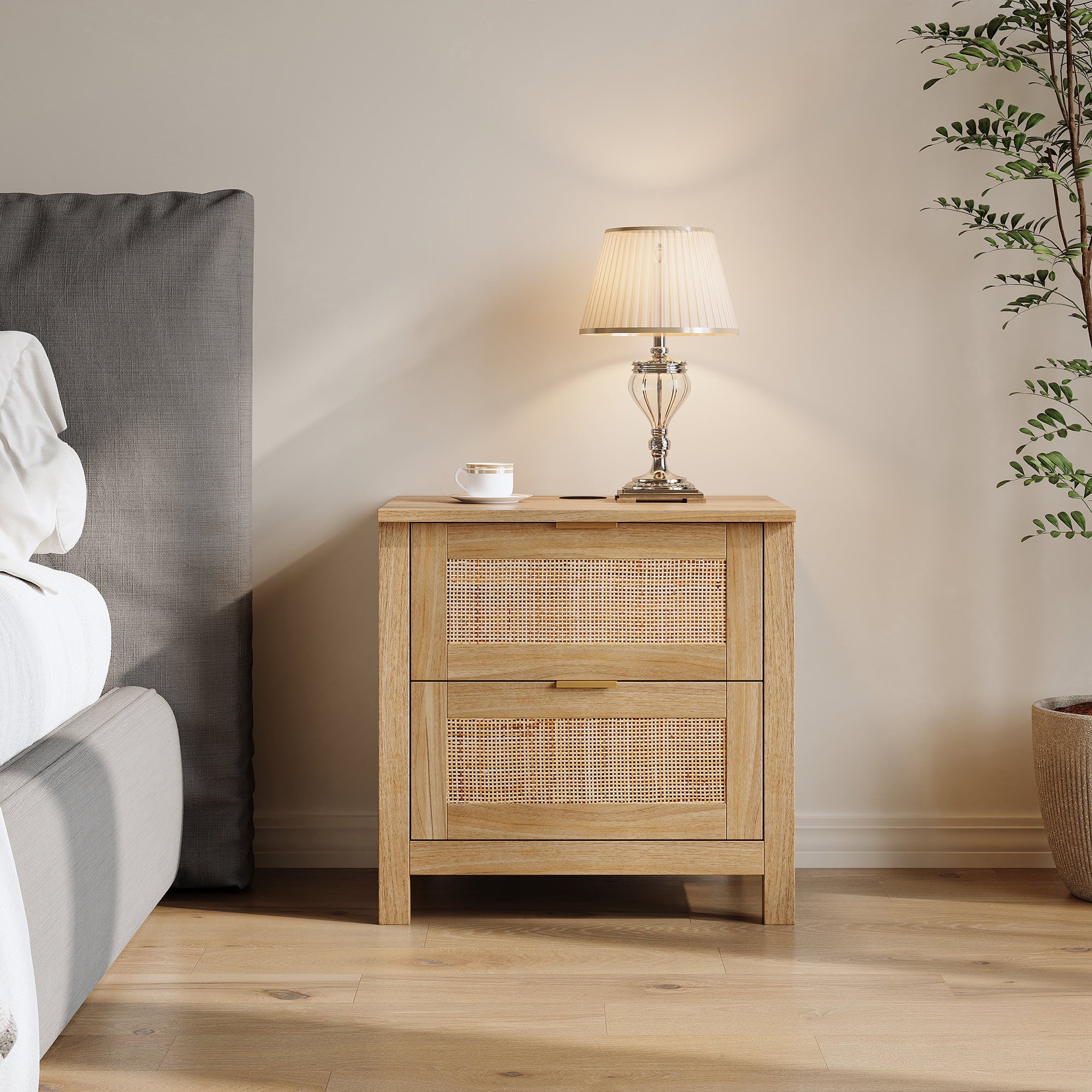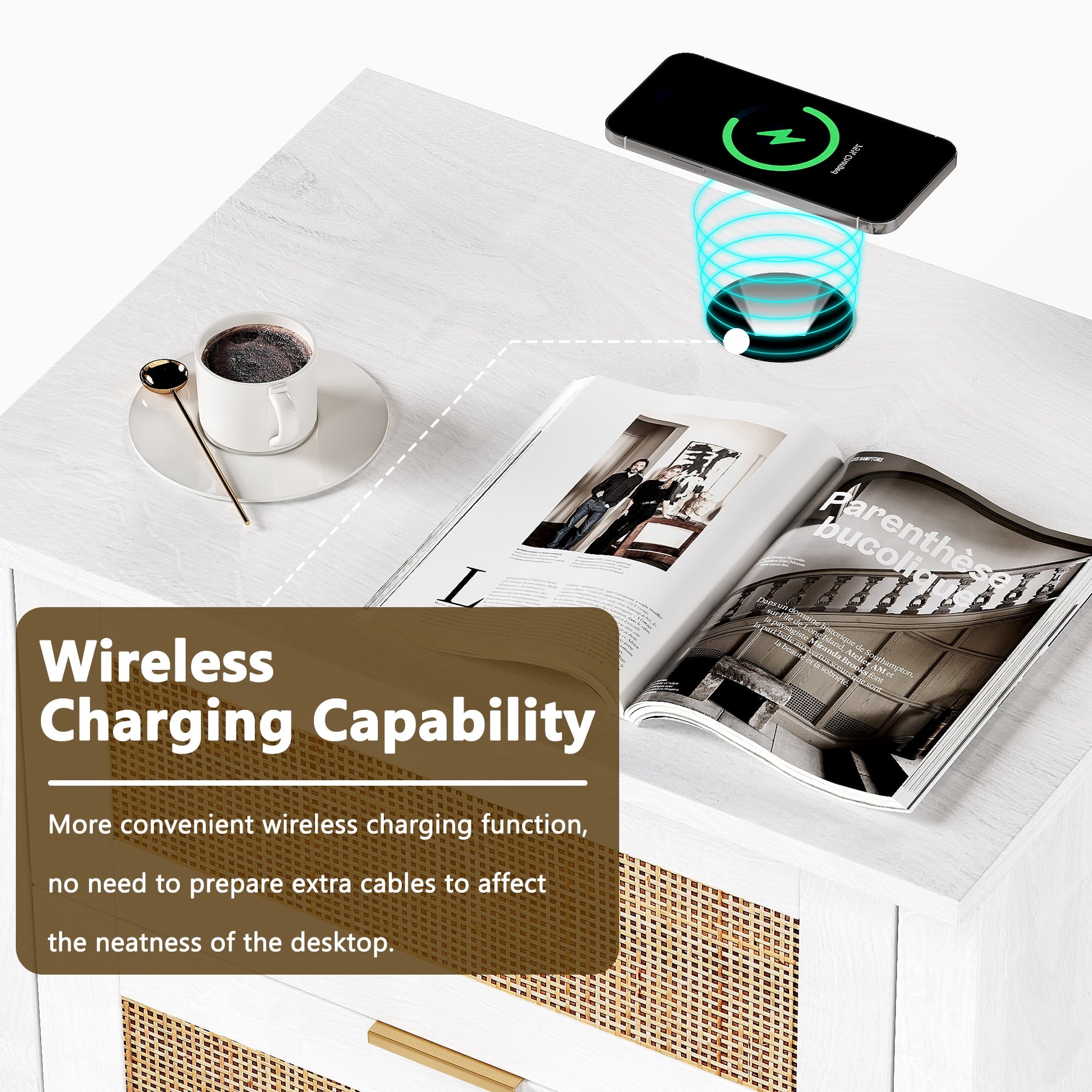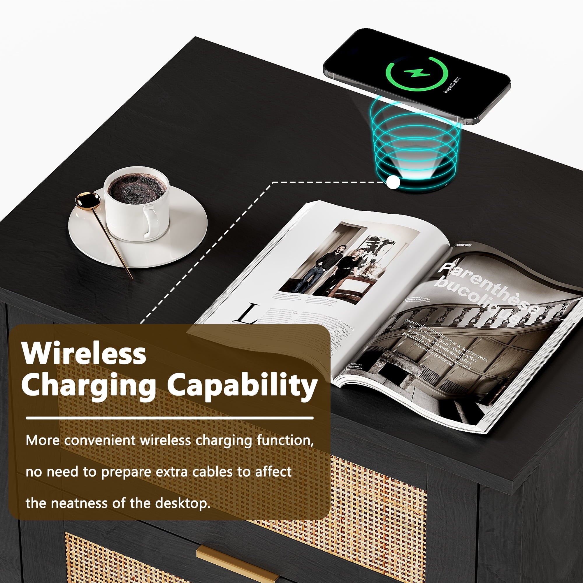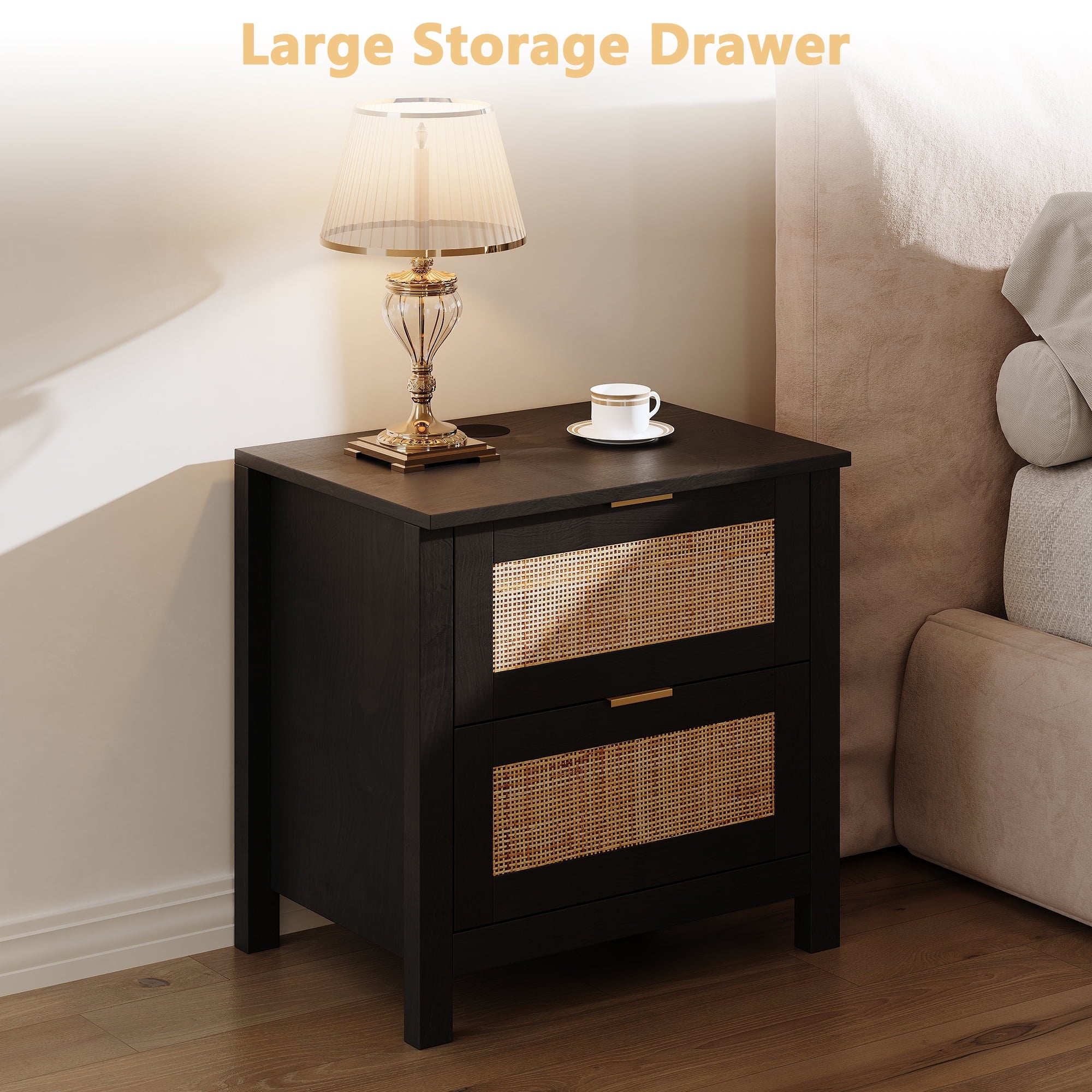 - Wooden nightstand 2-piece set with oversized drawers and desktop provides ample storage space for your bedside essentials and ensures that your bedroom is neat and organized. Featuring a wireless charging station, you can conveniently charge your devices, feature only available for cell phones and electronics with wireless charging capability.