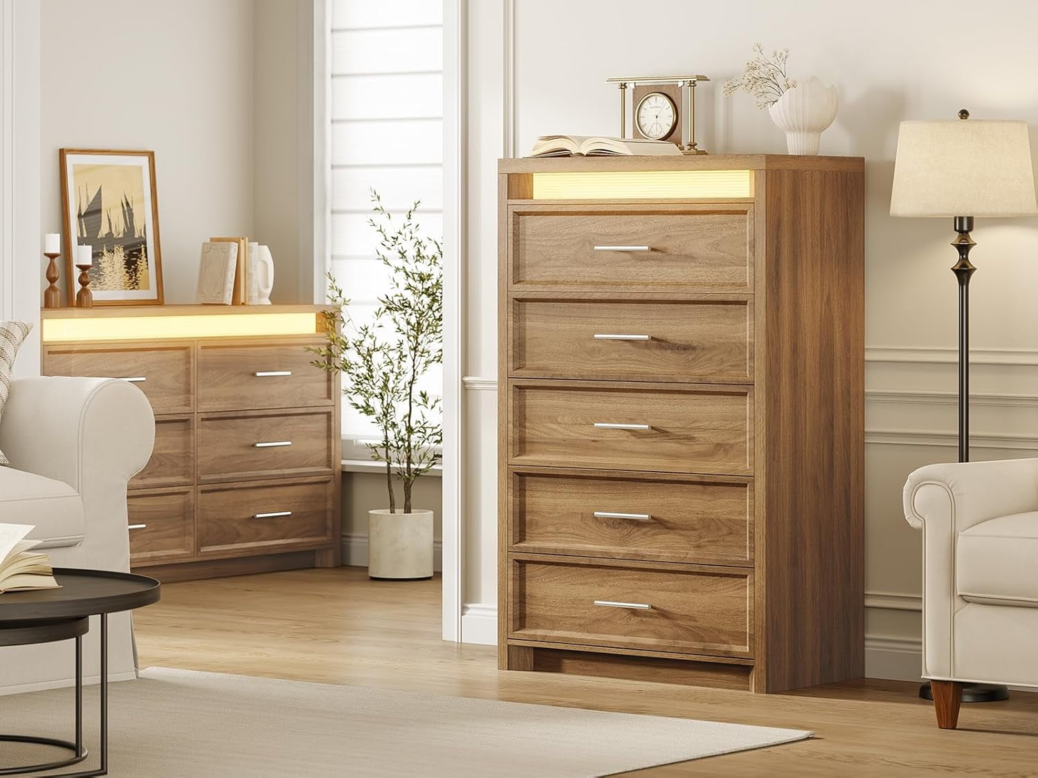 This stylish AOGLLATI dresser features a built-in LED lightbox with 3 adjustable modes (Warm White, Yellow White, Cool White). This bedroom dresser can enrich your bedroom space and can also be used as a nightlight, it adds a cozy yet modern touch to your bedroom.