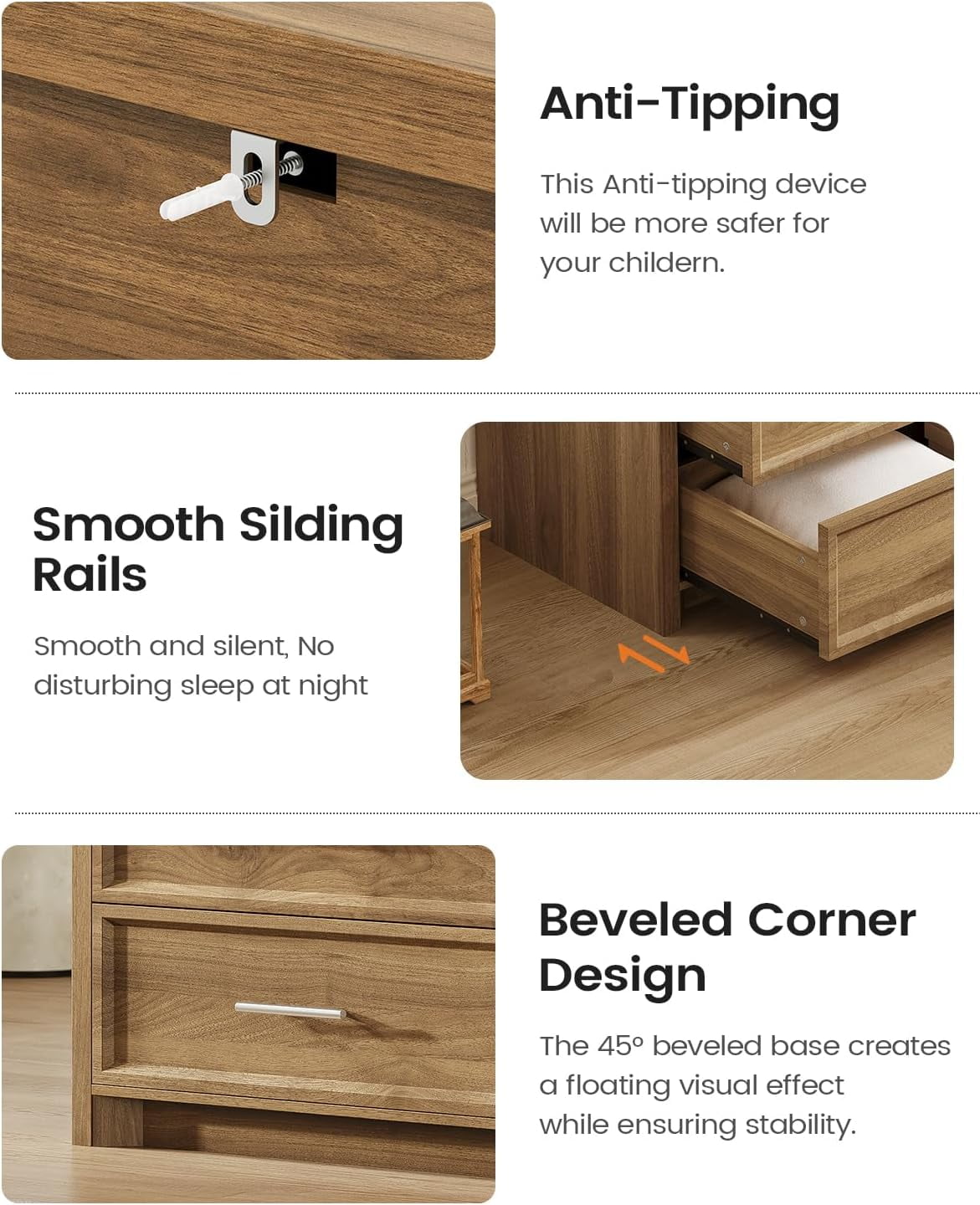 Equipped with an anti-tip wall for added safety, this 5 drawer dresser ensures stability. Each drawer includes smooth metal handles and built-in glide rails for effortless use. The 45° beveled base creates a floating visual effect while ensuring stability.