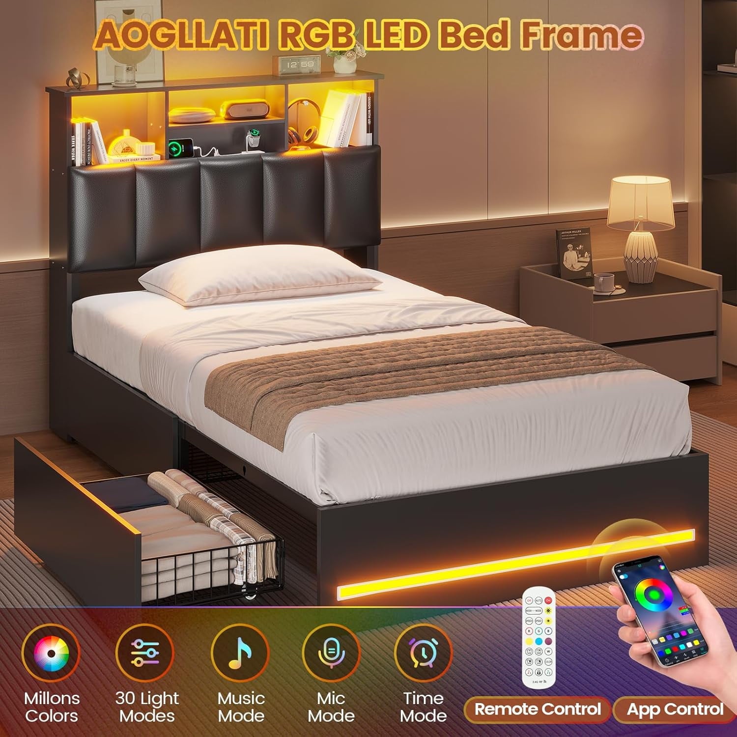 AOGLLATI Upholstered Platform Twin Bed with 4 Storage Drawers & Charging Station & LED Lights, Black