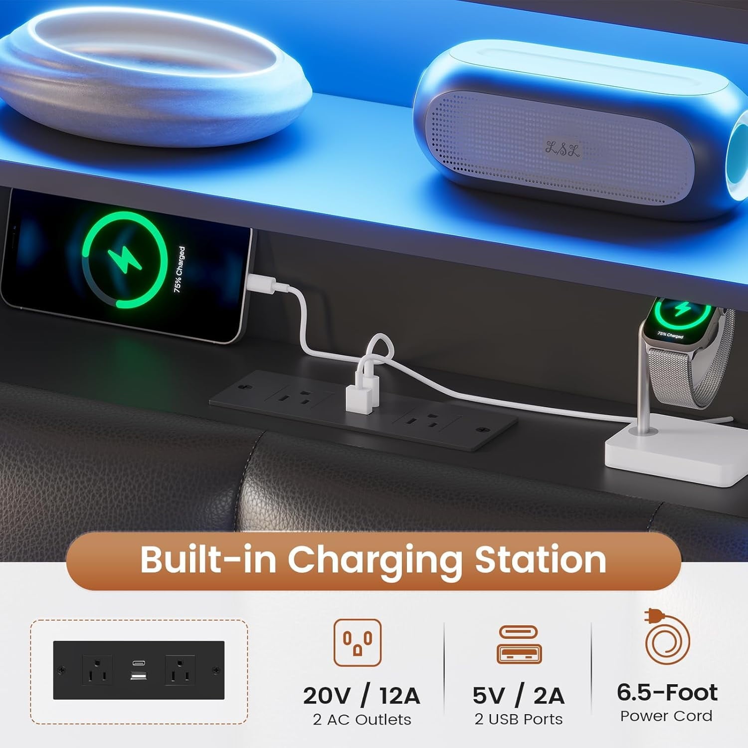 • Built-in charging station with Type-C, USB, and electrical outlets.