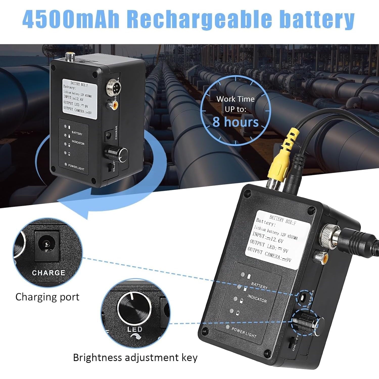 • Adjustable Brightness LED Lights: For optimal visibility in dark environments, this sewer inspection camera includes 12 adjustable LED lights. It is powered by a robust 4500mAh rechargeable battery, offering 6-8 hours of continuous use for thorough inspections.