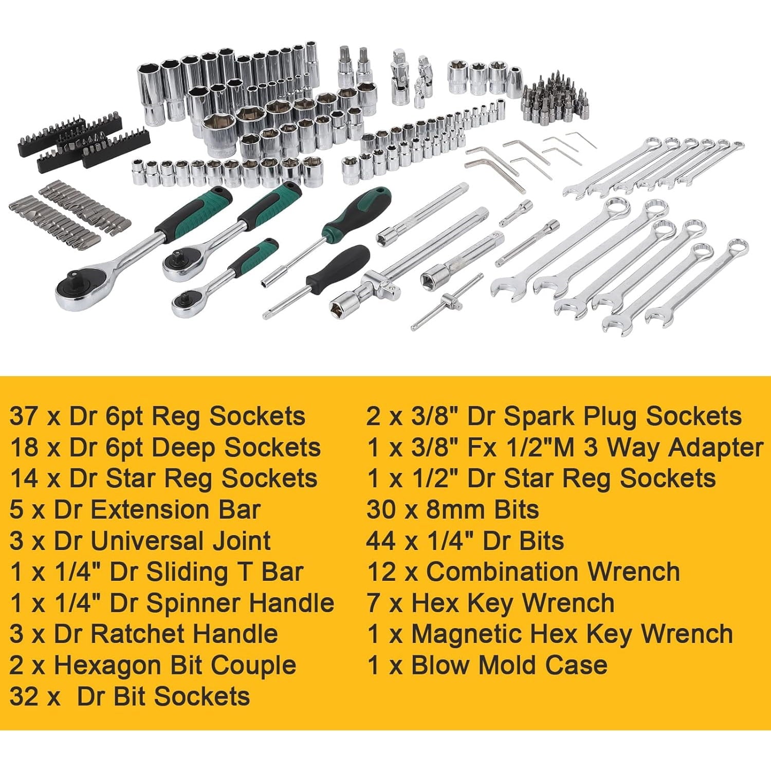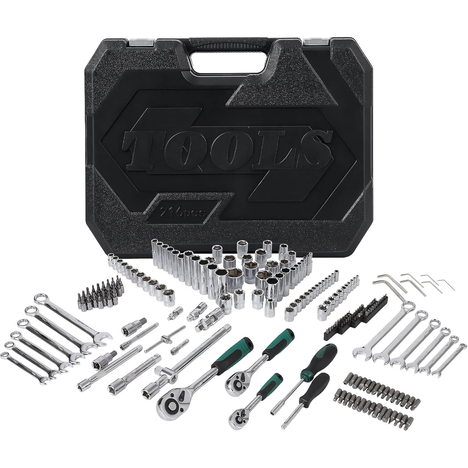 - Complete Socket & Wrench Kit: 216 pieces including SAE/metric sizes, extenders, and adapters for versatile use.