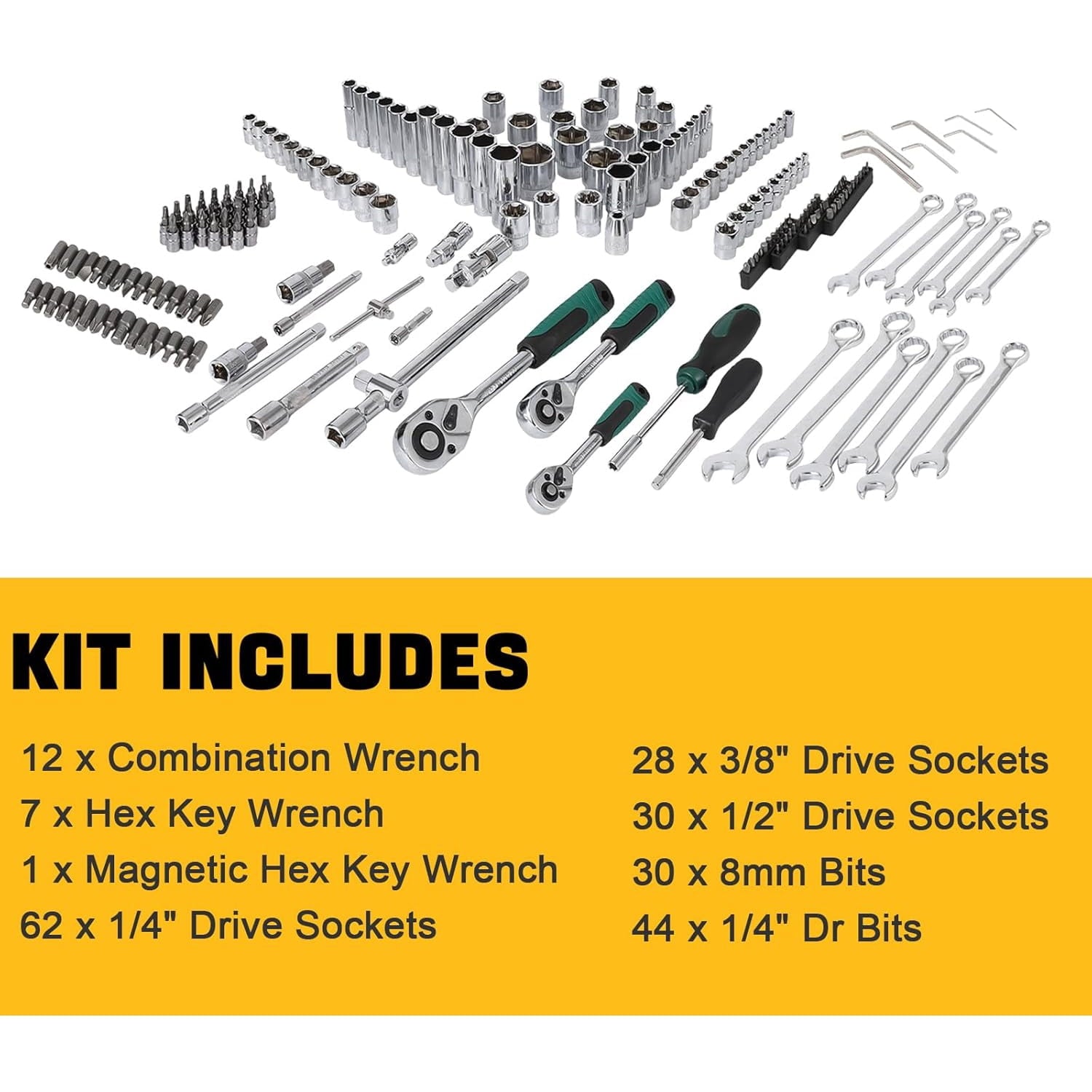 - Included Tools: Ratchets, Sockets, Wrenches, Hex Keys, Screwdrivers, Extensions, Adapters