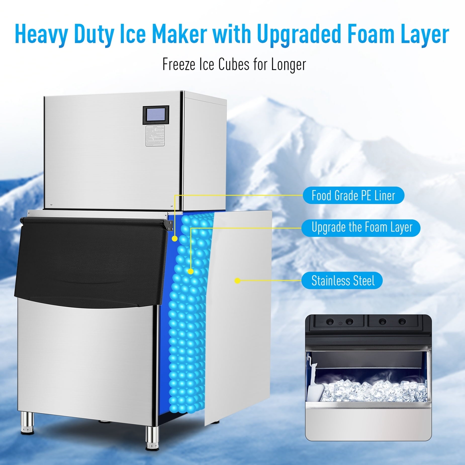 • Fast ice making: 550 lbs daily production, 350 lbs ice bin capacity, meet for commercial or home bar use