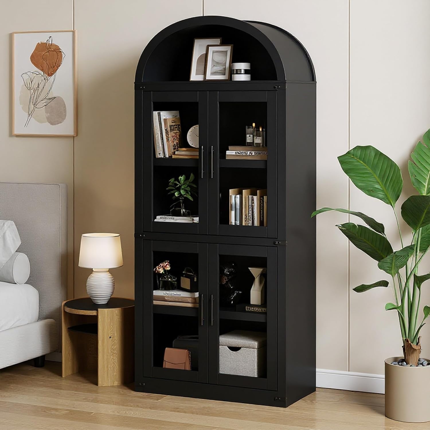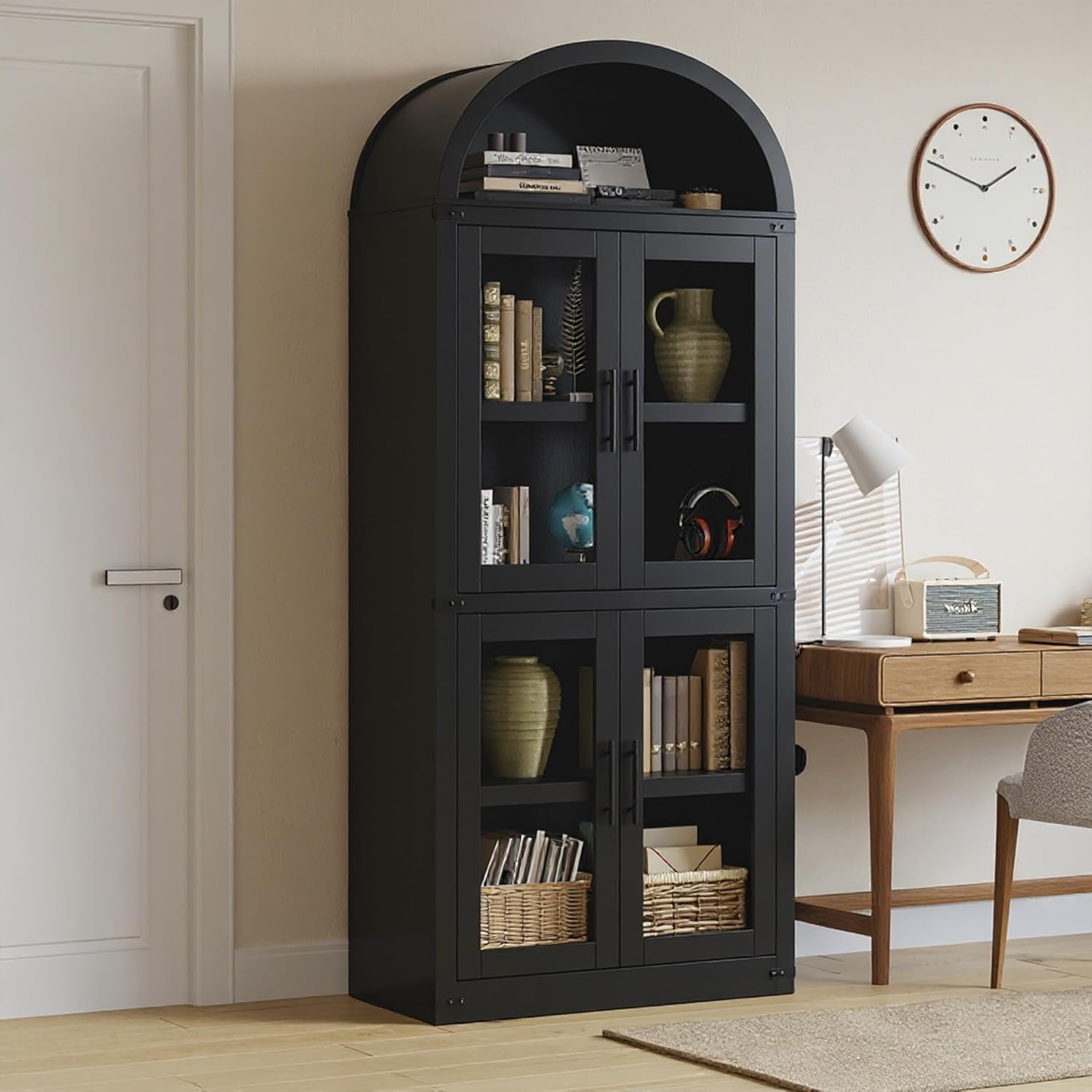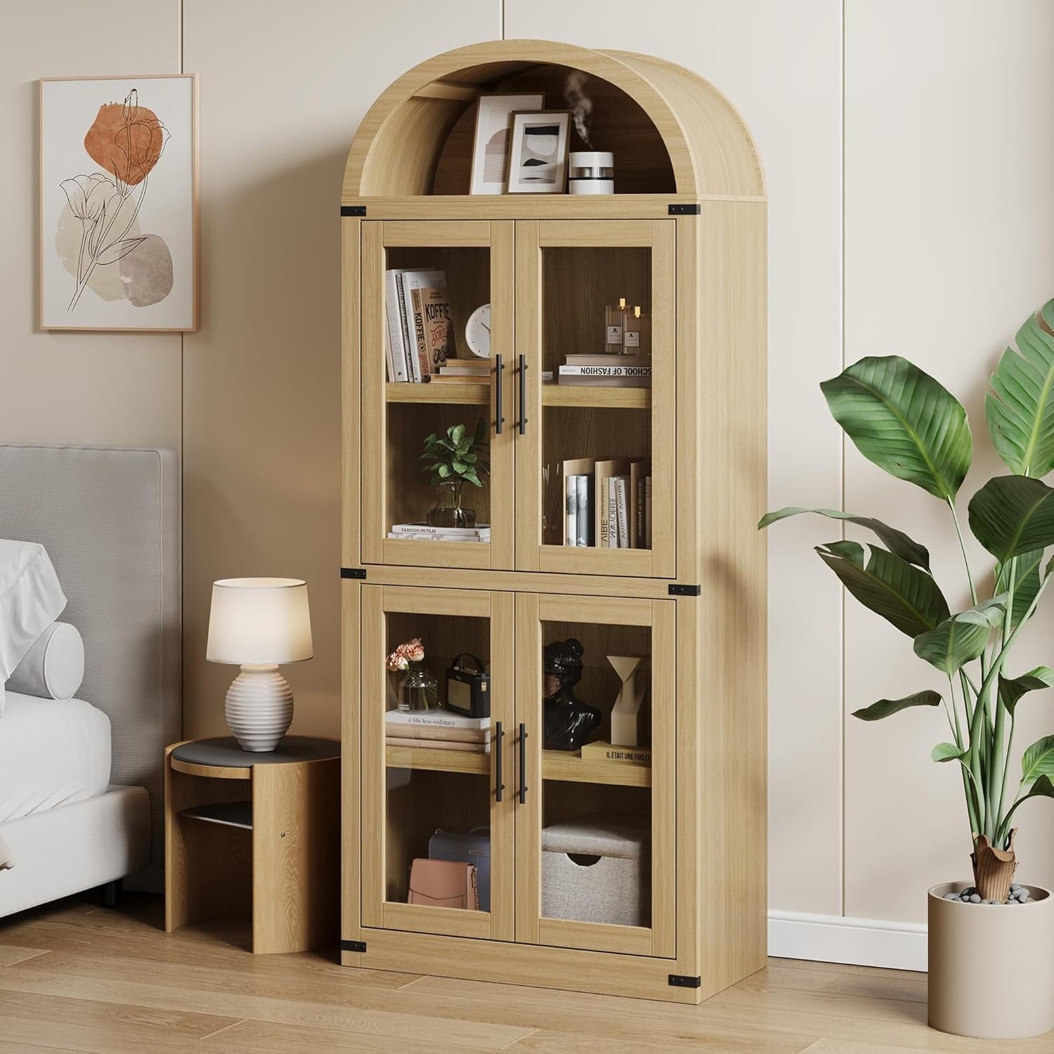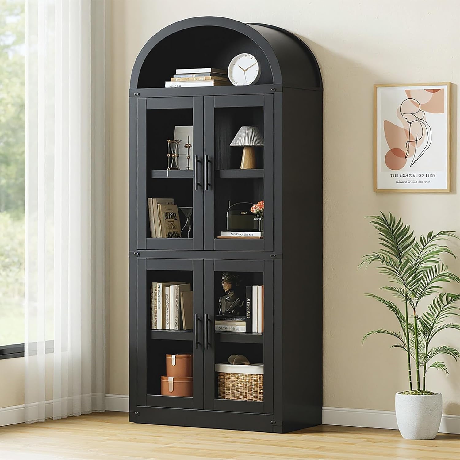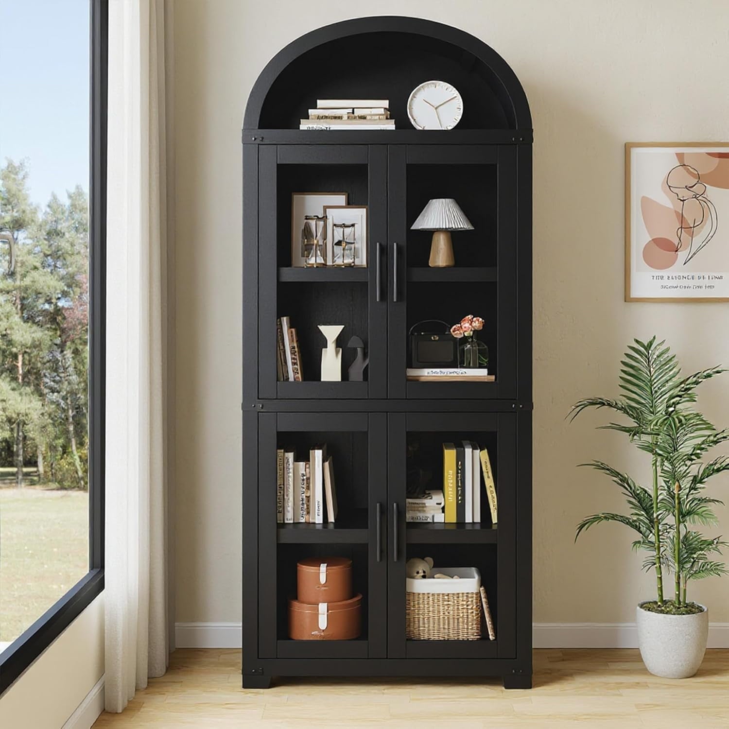Add timeless charm and practical storage to your space with this 71.65-inch tall arched farmhouse bookcase. Made from engineered wood, this cabinet combines rustic appeal with modern function. It features both open shelving for display and closed storage with doors and metal handles to keep essentials dust-free. With a generous depth of 15.83 inches and each shelf supporting up to 60 lbs, it’s ideal for storing books, kitchenware, or decorative items. Whether used in the kitchen, living room, or office, its arched silhouette and neutral color options blend effortlessly with a variety of interiors. The cabinet also includes anti-tipping hardware for added stability and peace of mind.