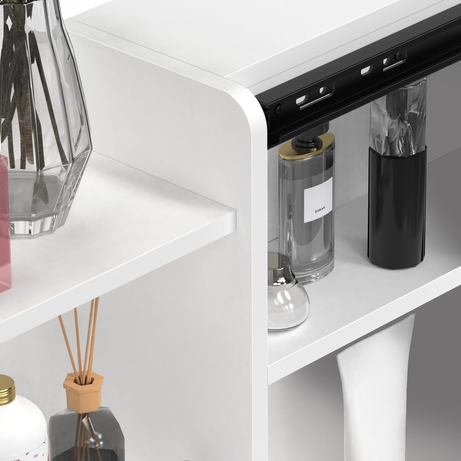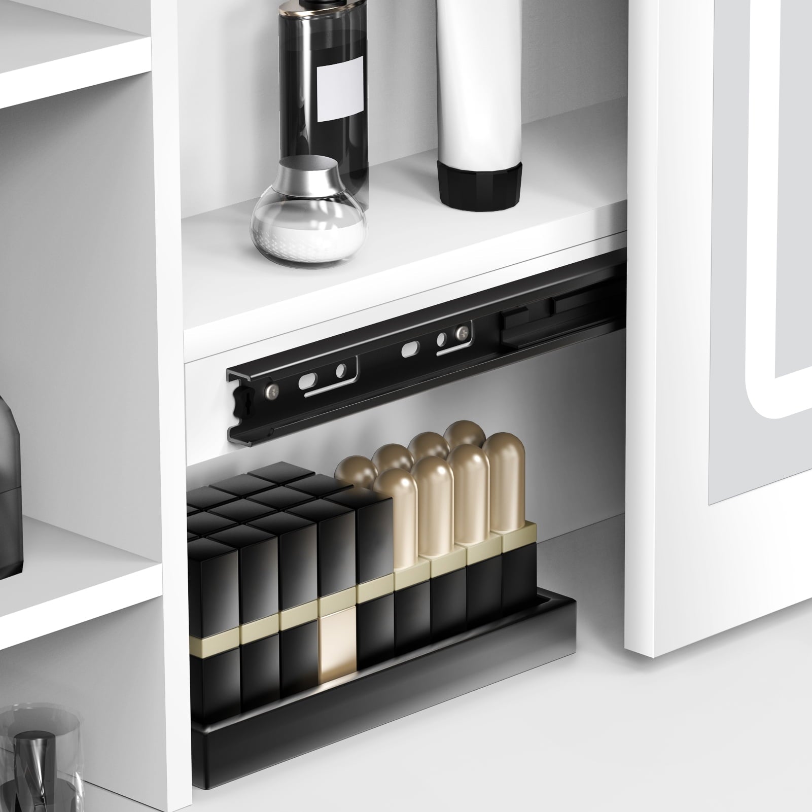 • Sliding rail mirror design: With sliding tracks equipped, this mirror really meets various makeup needs. You can do your makeup from a different angle or organize your cosmetics with a little push to the mirror.