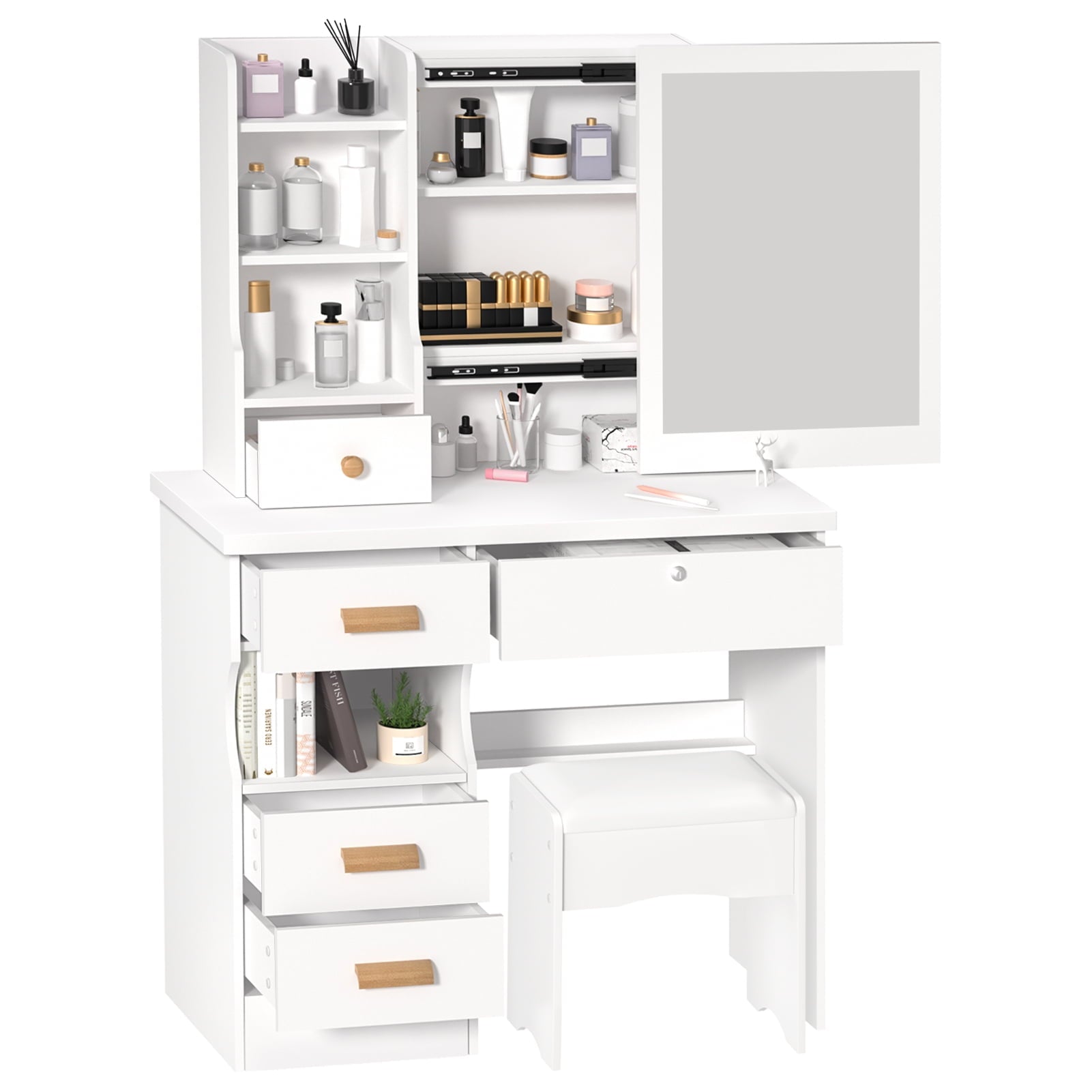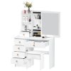 • Large storage space: You can never imagine that there is hidden storage space behind the mirror. The vanity desk features 6 spacious drawers with wooden handles and a lock, allowing you to store your jewelry and makeup. The open shelves and hidden shelves provide plenty of storage space to display cosmetics, nail polish, etc.