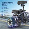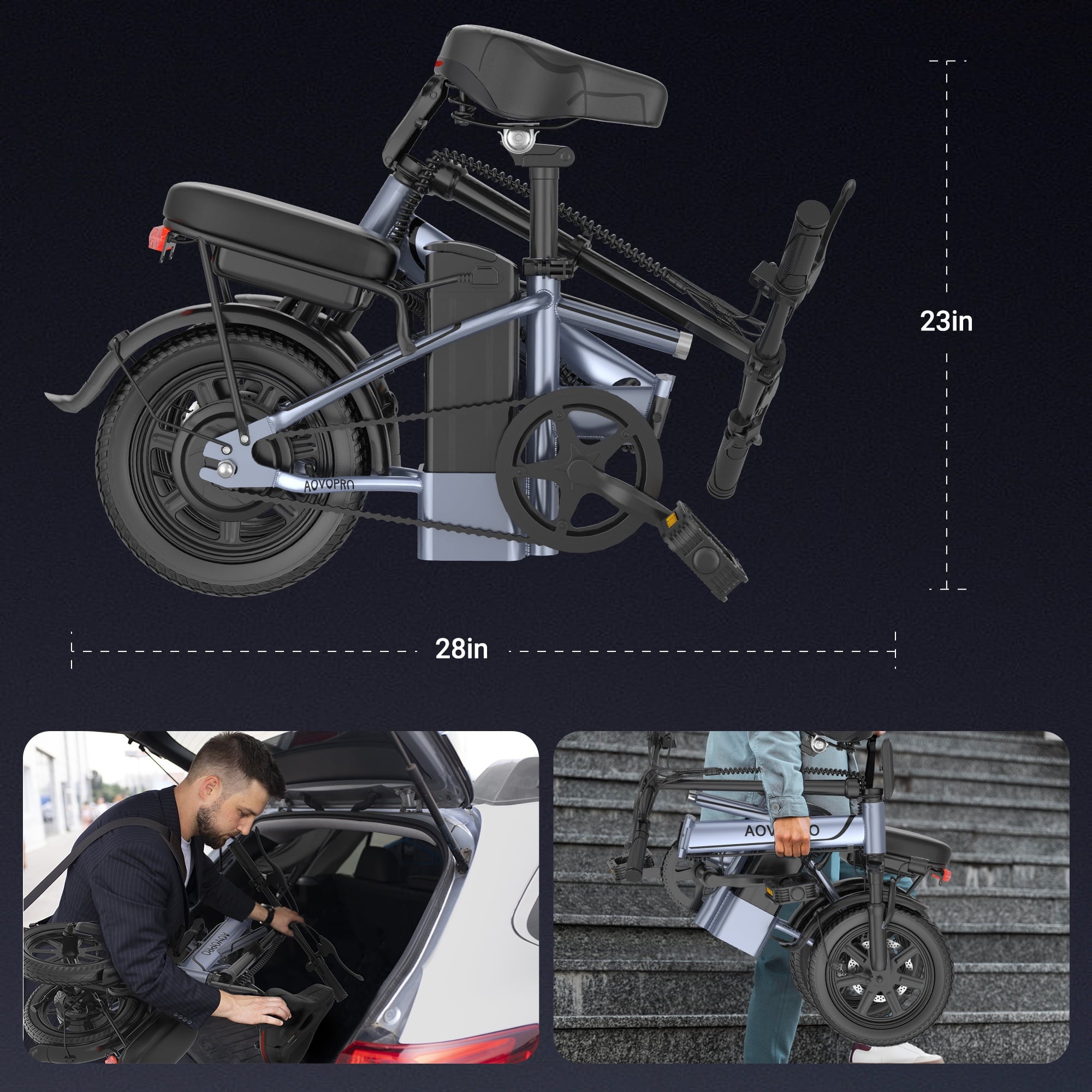 - AOVOPRO EB60 electric bicycle has a foldable body, with a folding size of only 27.6 * 27.6 * 23.3 inches and a weight of only 50 pounds. You can easily lift it up or put it in the car to travel with you. In addition, we have added a phone holder for you to use navigation at any time. What’s even more surprising is the USB charging port, which allows you to charge your phone at any time, bringing you a full sense of security for your cycling. In addition, I also gave you a password lock as a gift to protect your scooter from theft