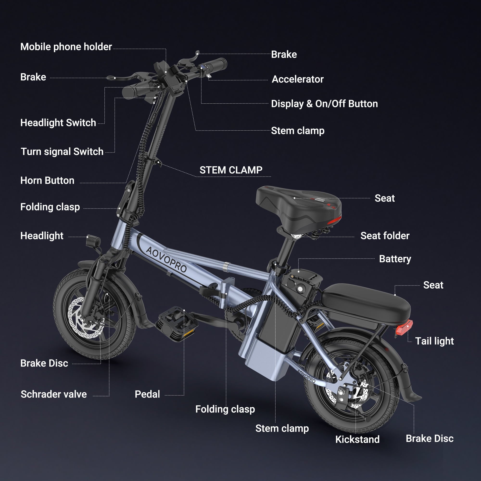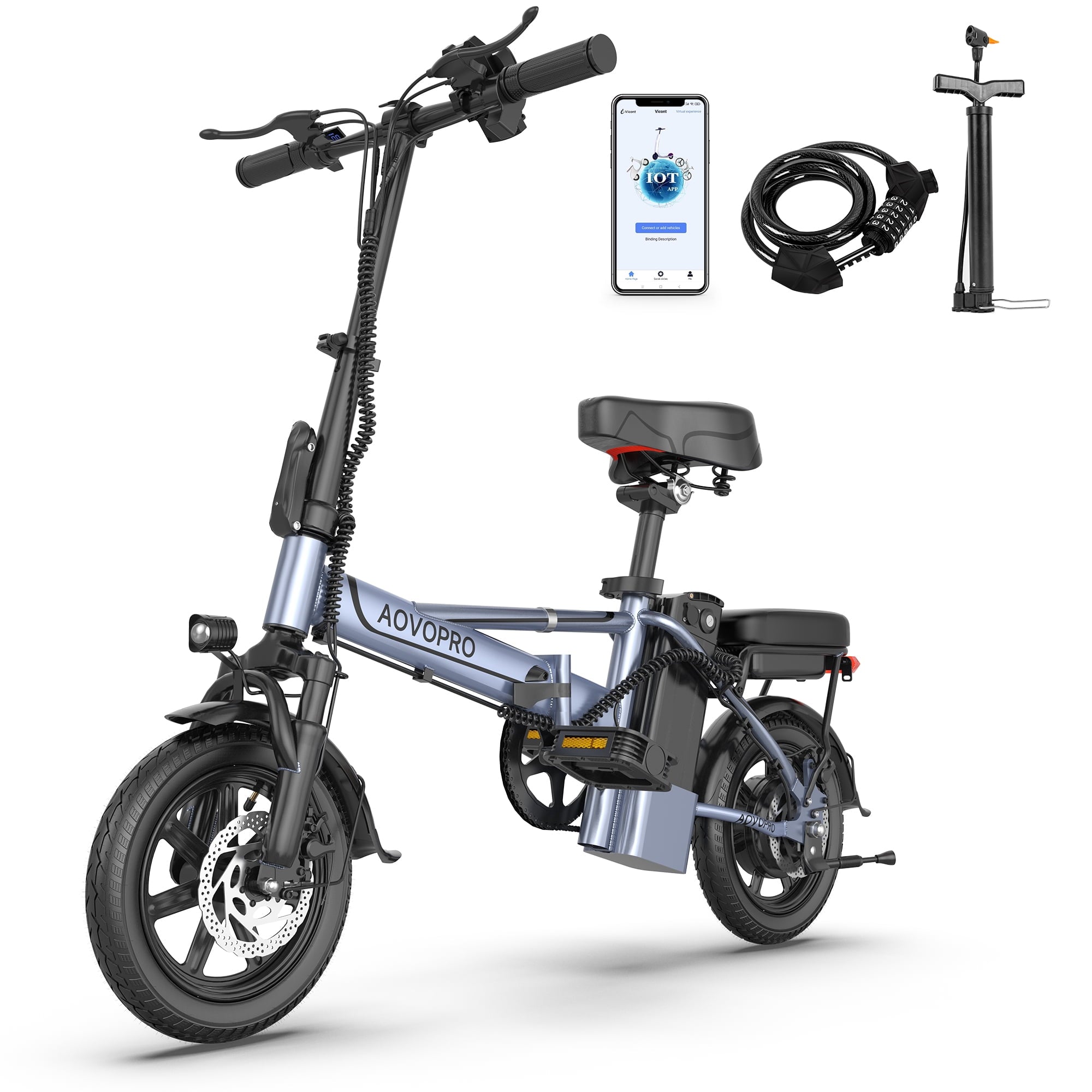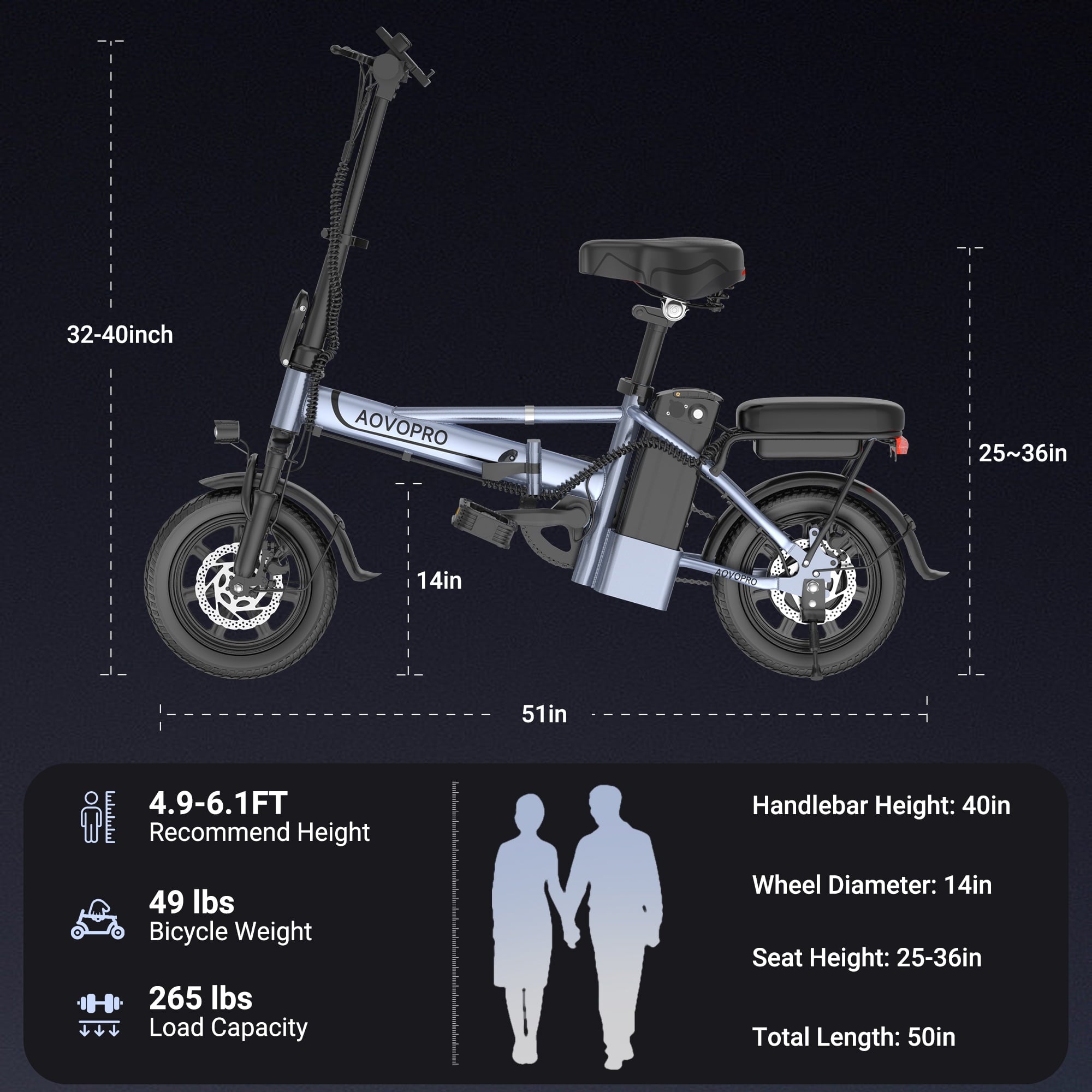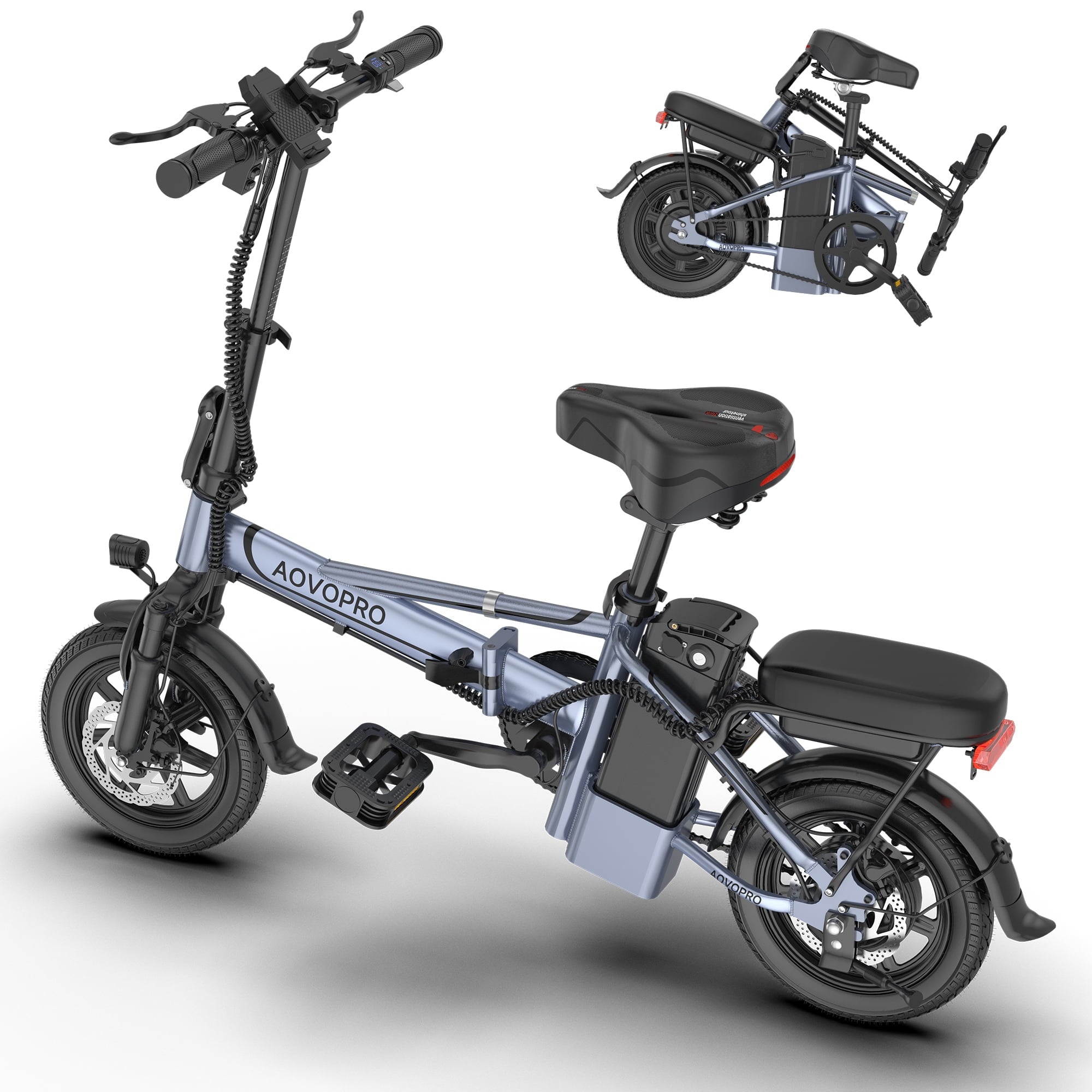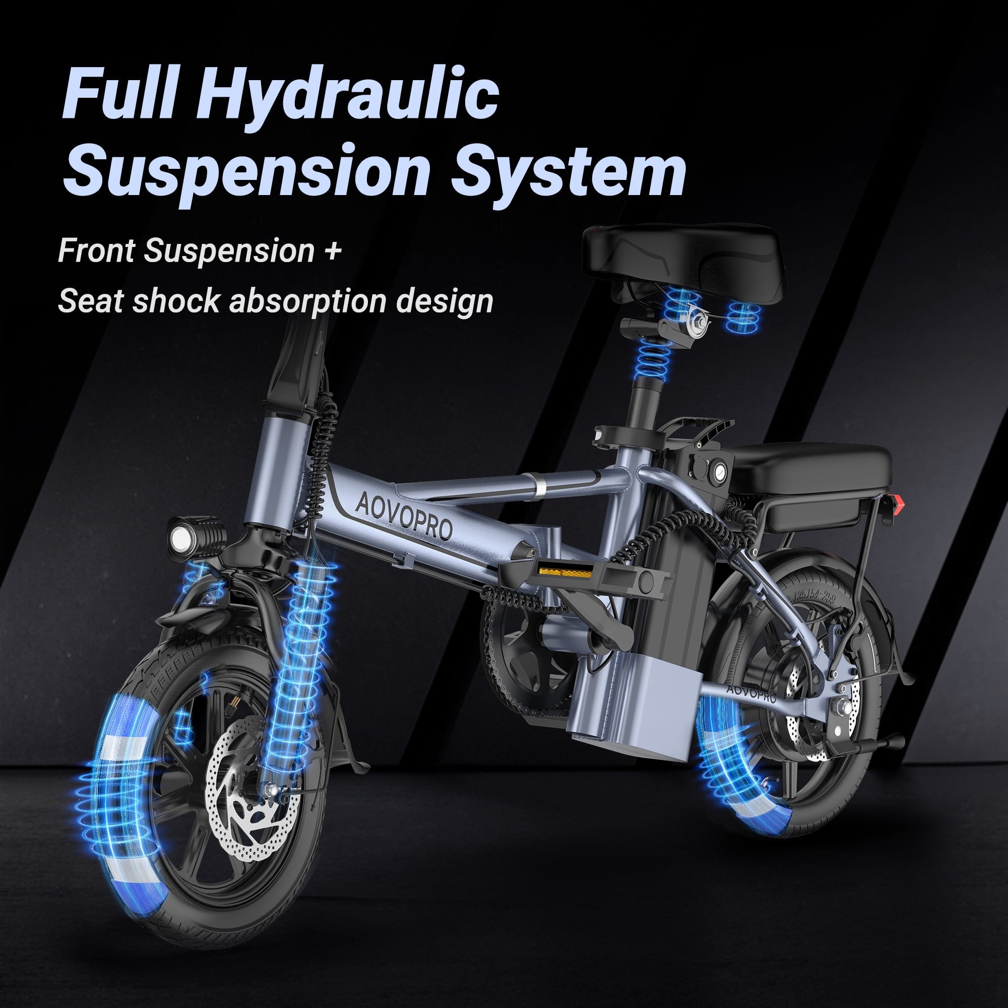 - AOVOPRO EB60 electric bike features adjustable height seats that meet everyone’s riding needs, dual disc brakes, front hydraulic shock absorbers, seat spring shock absorbers, and 14 inch inflatable tires, greatly enhancing riding safety and comfort