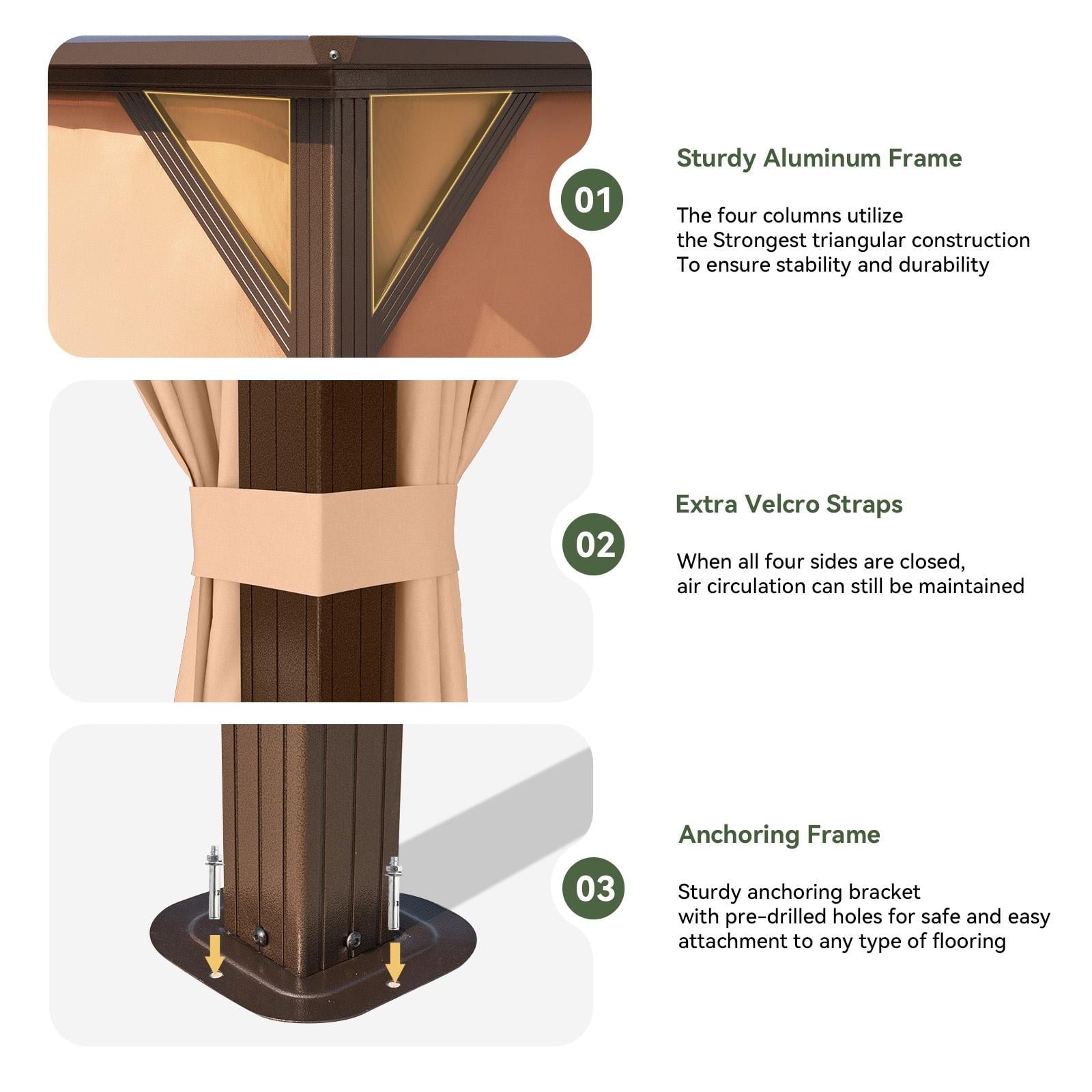- Sturdy frame The thick powder-coated aluminum frame has a strong load-bearing capacity, more wind resistance, and can protect you from the influence of sunlight and bad weather in all seasons at the same time, 4 ground piles and expansion screws add extra durability and safety.