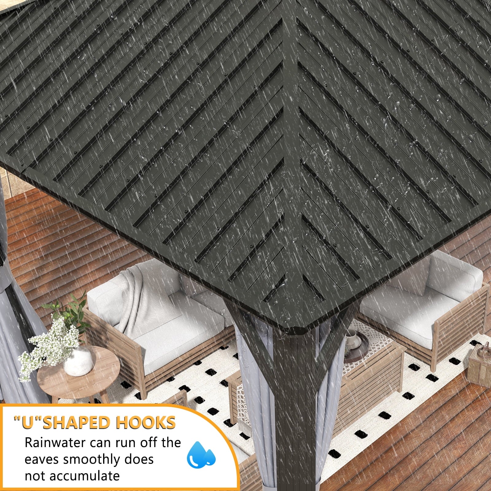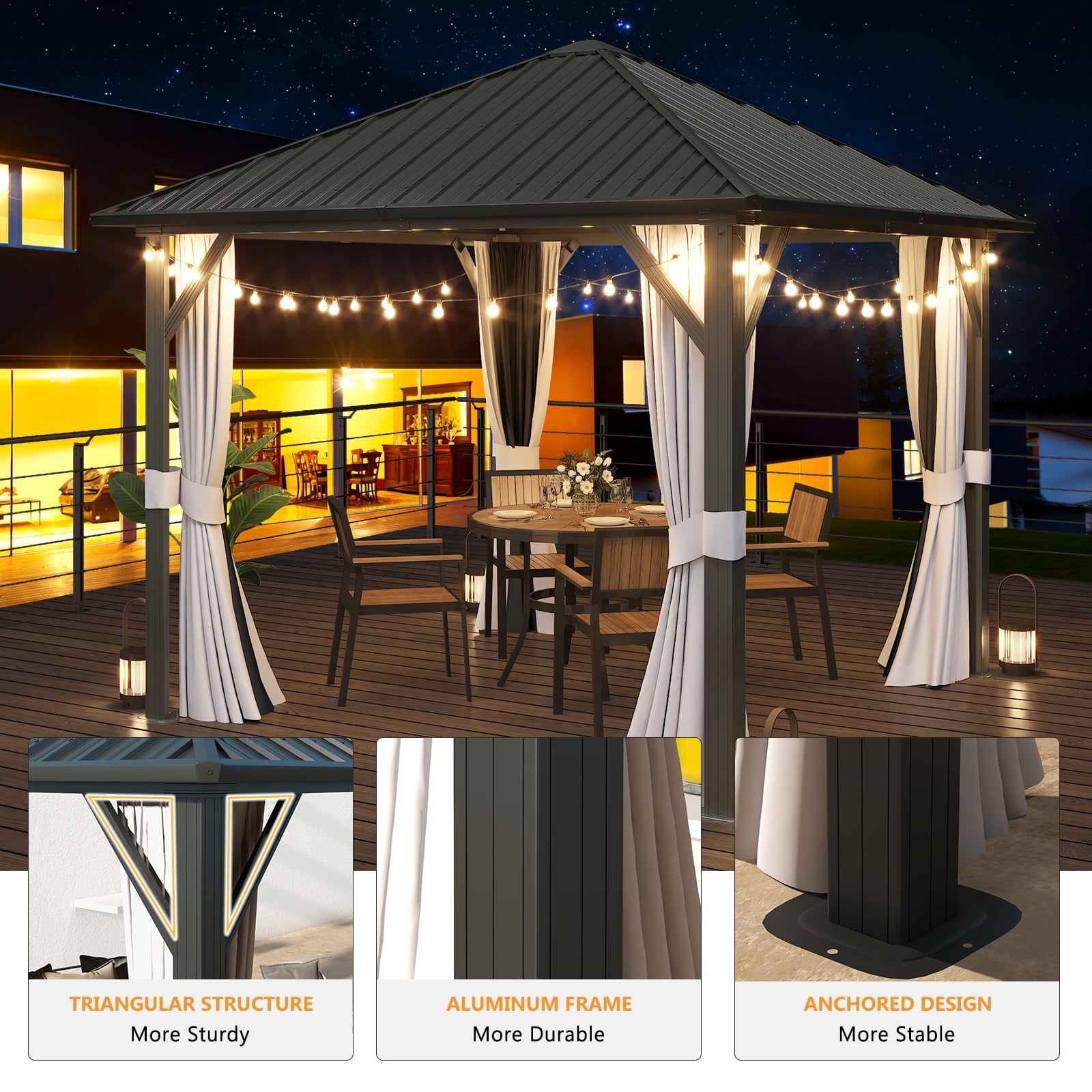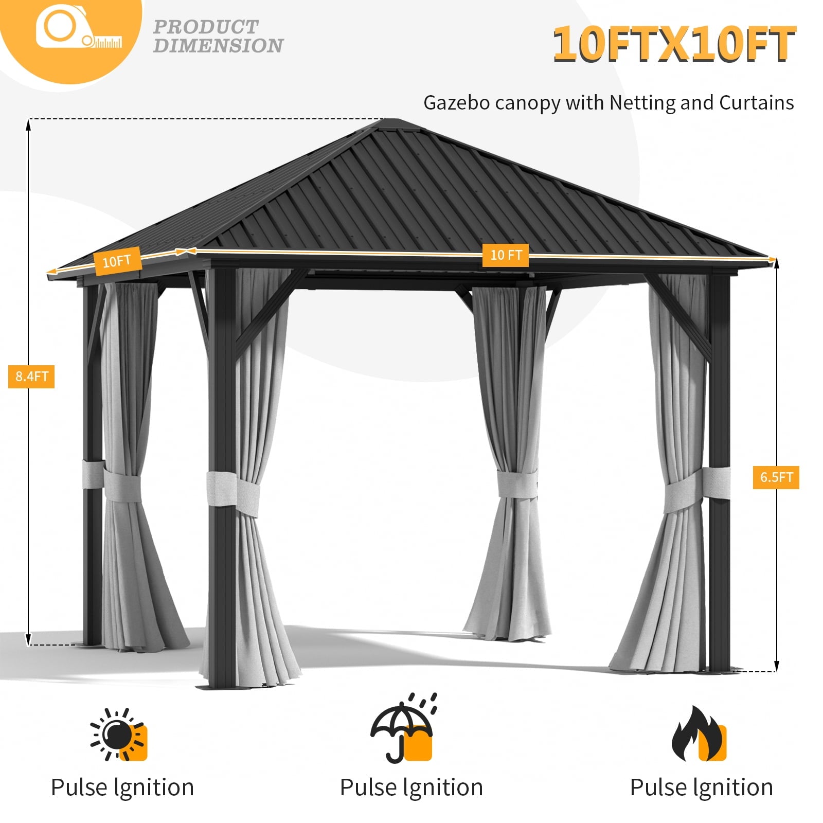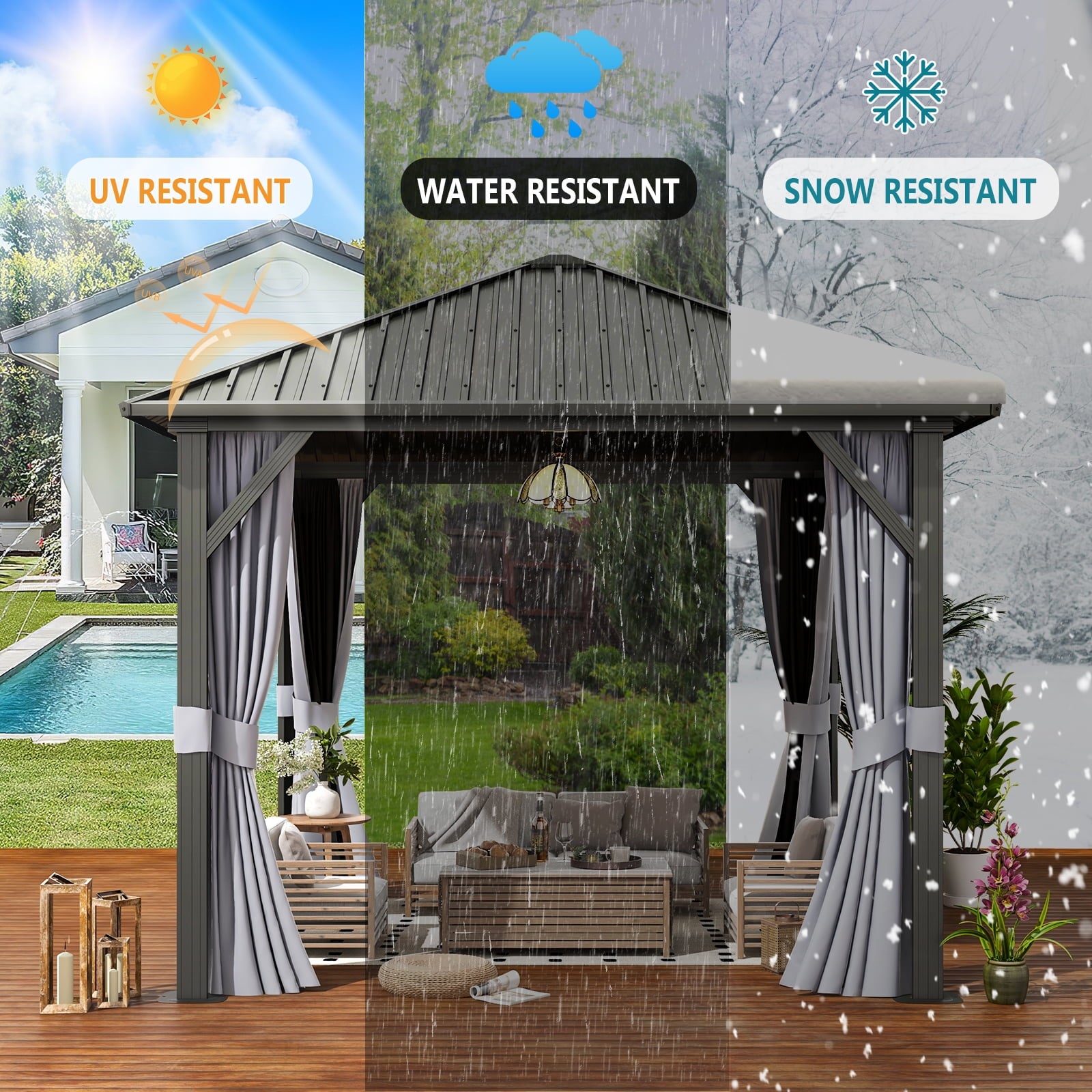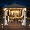 Expand your living space with the hardtop roof gazebo, experience the joy and comfort of having your own private oasis right in your backyard. The galvanized steel roof and aluminum frame constructed the sturdy structure, the privacy curtains and mosquito netting create a cozy gathering for your friends and family. Its stylish and modern design effortlessly blends into any outdoor setting, and the spacious interior provides ample room for seating, dining, or setting up entertainment, making it an excellent choice for outdoor entertaining in your gardens, patios, and backyard spaces. Order yours today and start enjoying the benefits of outdoor living at its finest.