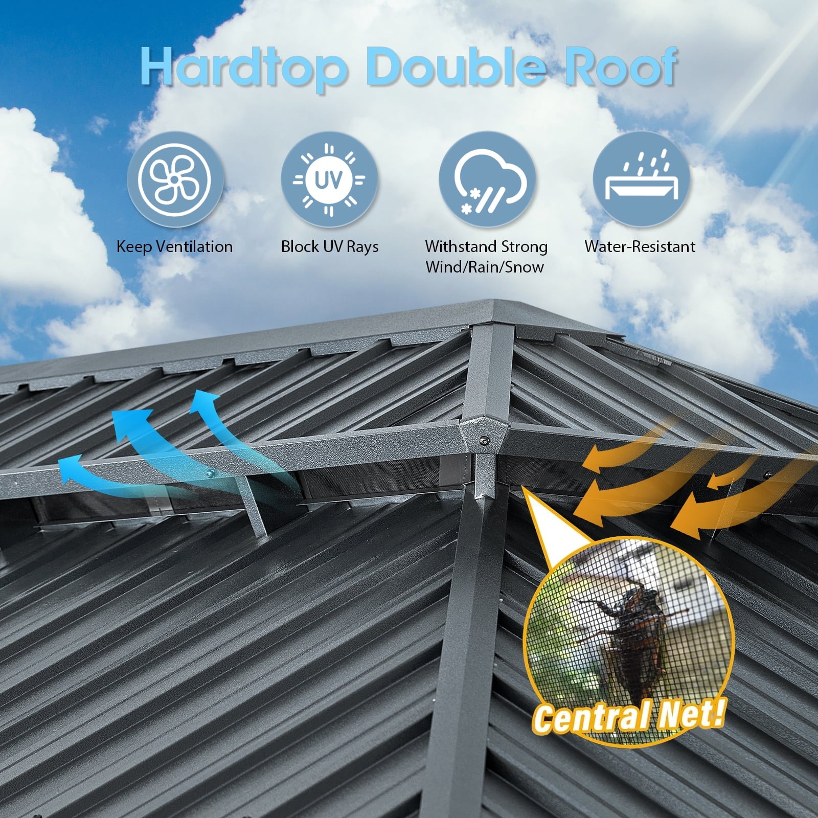 - Galvanized Double-layer Roof: The double-layer galvanized steel roof of the patio gazebo provides excellent protection against UV rays and enables proper ventilation, providing a comfortable and shaded area on hot summer days. The unique water utter design also helps to effectively drain the rainwater, preventing any inconvenience during rainy seasons.