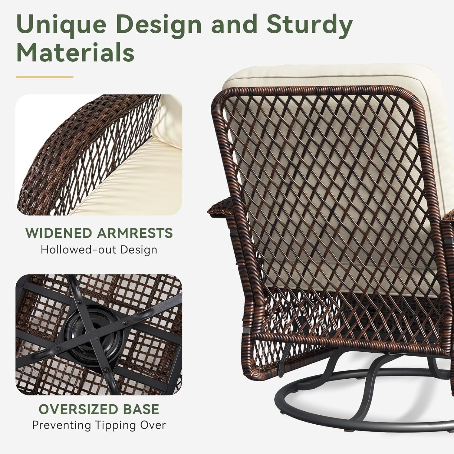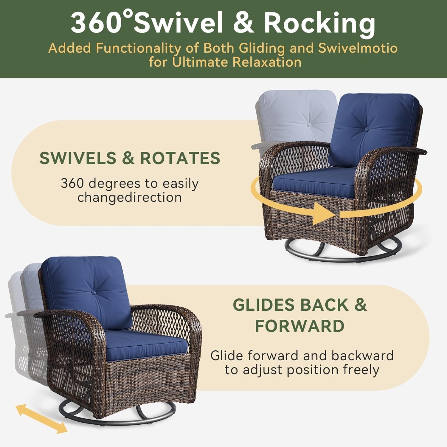 - Swivel 360° & Glides Back and Forth: The patio rocking chair is built on a sturdy metal frame, round base that allow you to glide gently and swivel 360 degrees, the rocking chair in good look brings utmost comfort to relax outdoors.