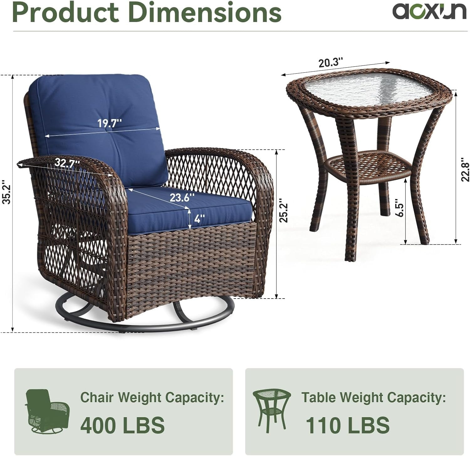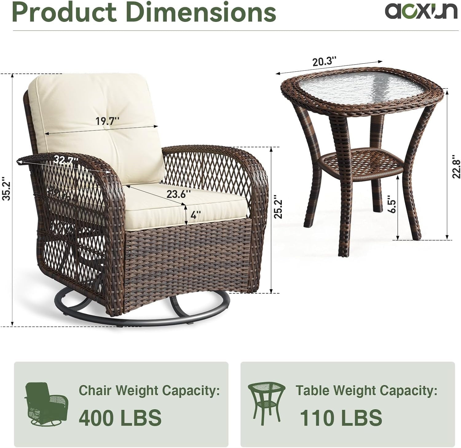 - Sturdy and Durable: Weight capacity: 360 lbs. The tempered glass table can be used for a long time as long as it is maintained simply. Each porch furniture is made of durable outdoor fabric which is convenient to remove.