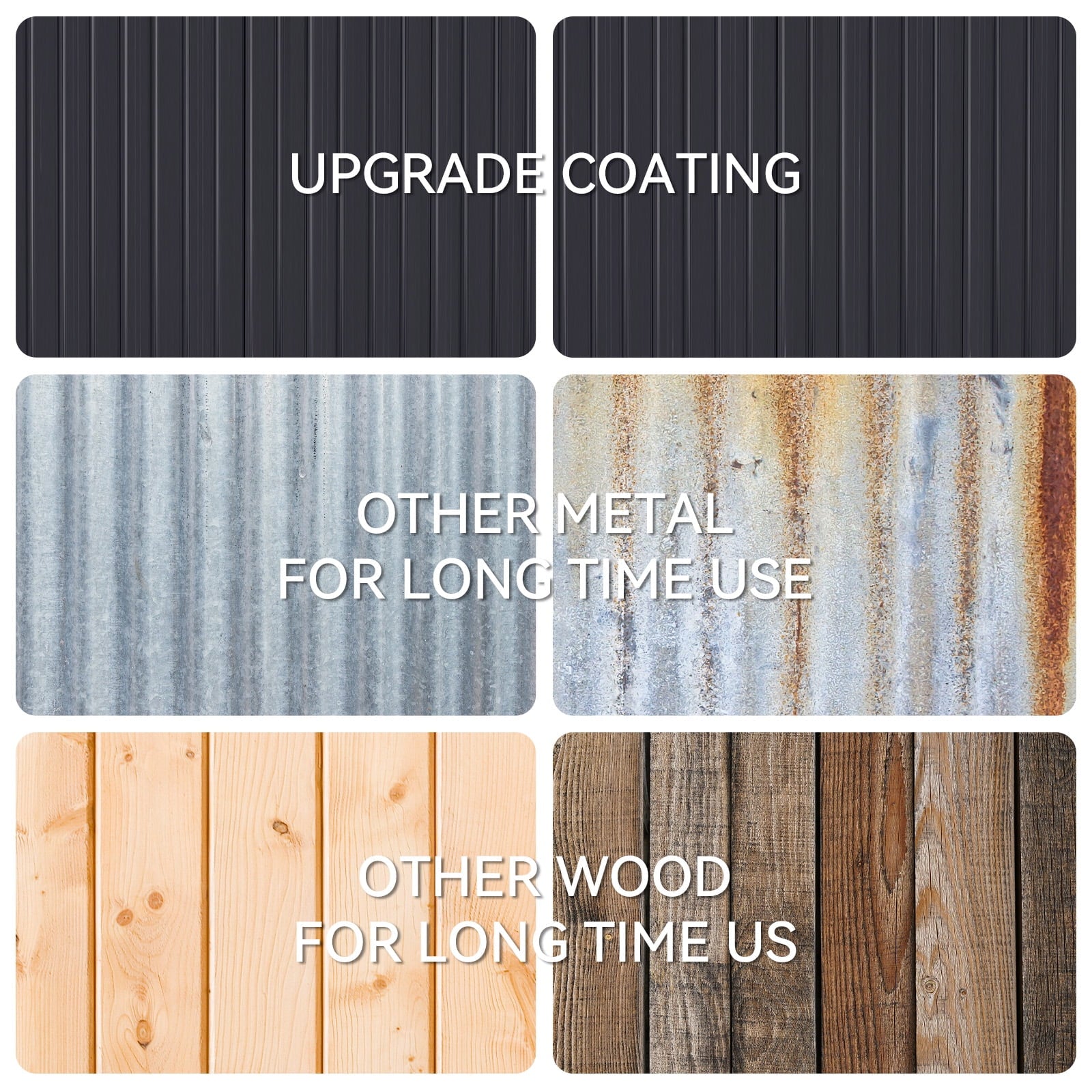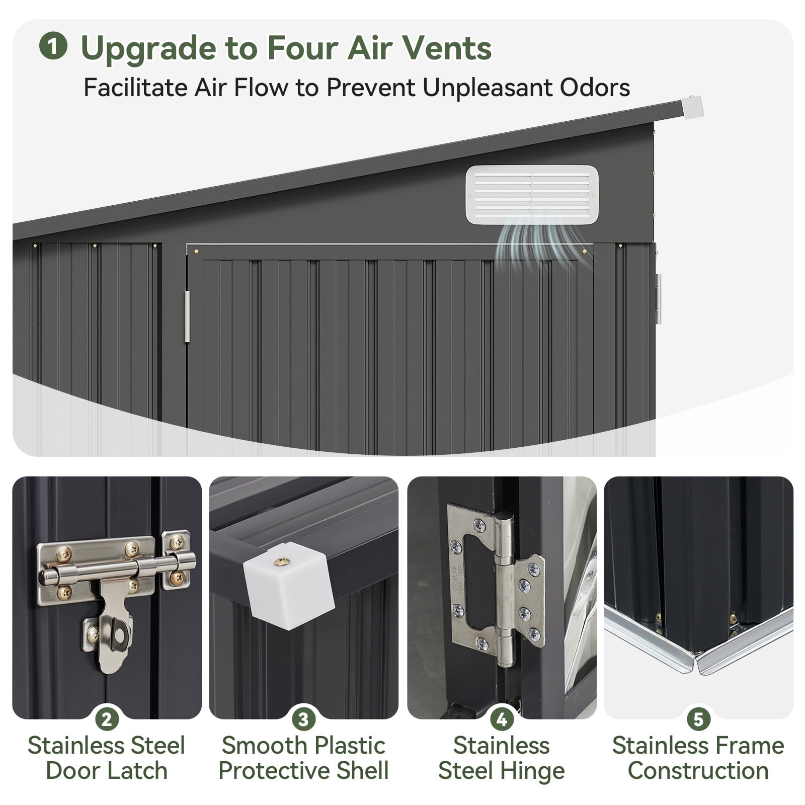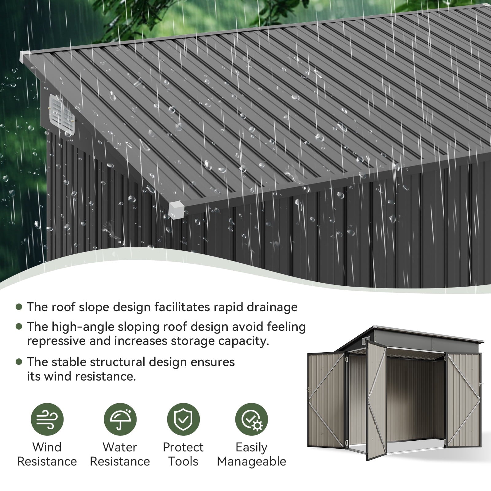 - 【More Details】There is a louver vent on each side of the top, which can keep the shed dry and ventilated whether it is a humid rainy day or a hot summer; the four corners of the roof adopt an anti-collision protection design, which not only prevents collision and warping, but also makes the entire shelf more sturdy and durable.