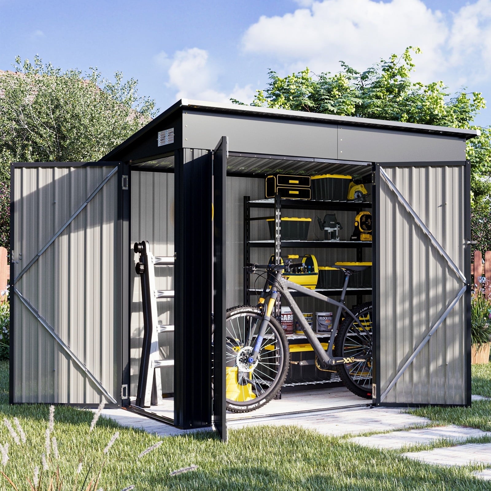 - 【Triple-Door Design】This shed has 3 doors at the front and side, providing unparalleled practicality to meet all your storage and access requirements. Besides, the side door makes it more convenient to store or take out large items like bikes. The product is also equipped with latches that help keep your goods safe.