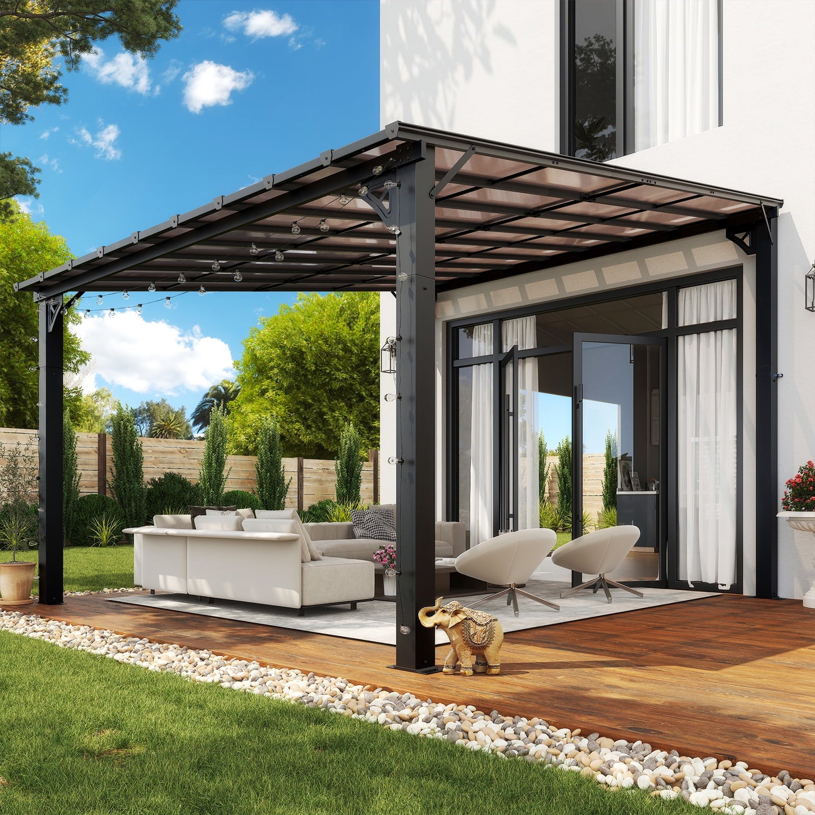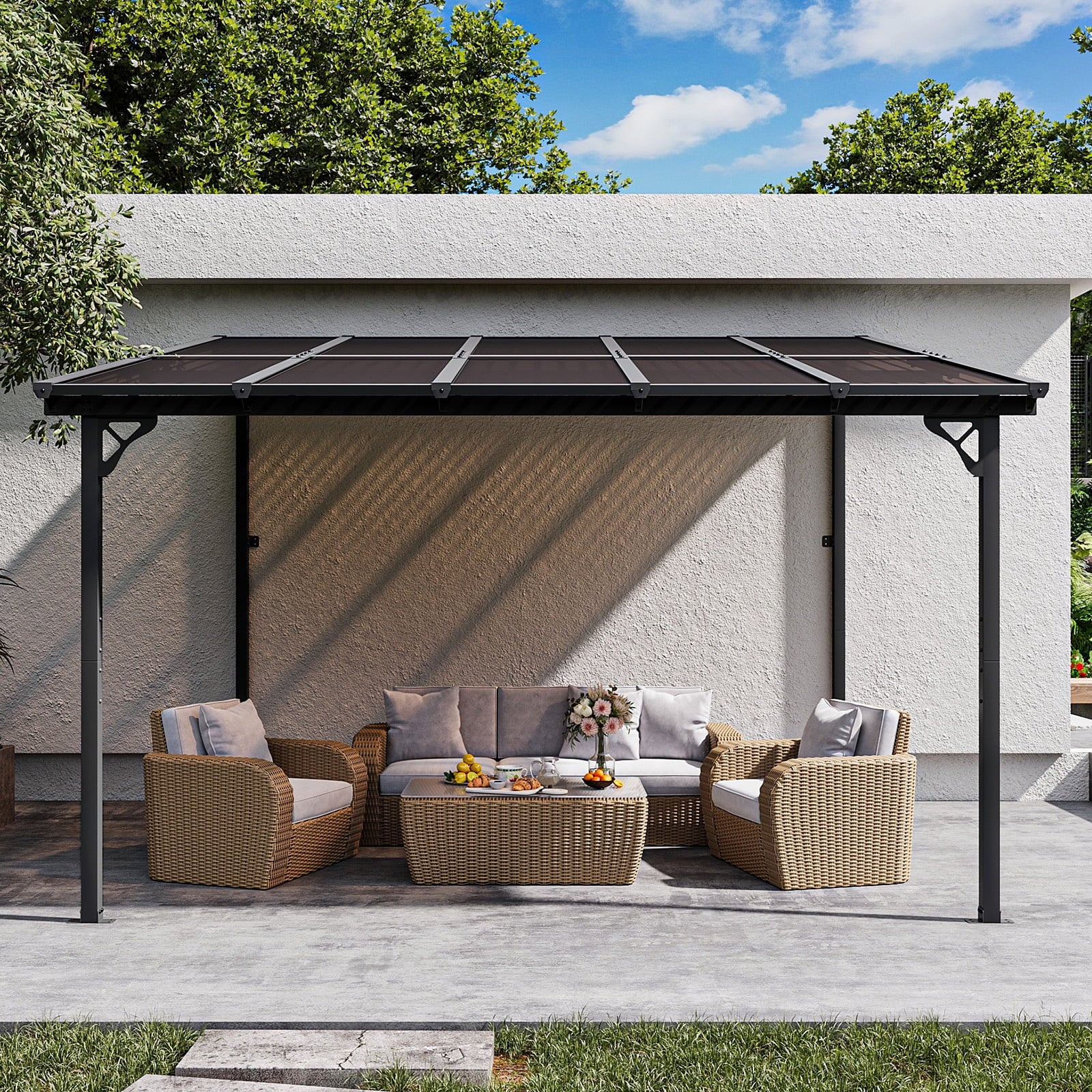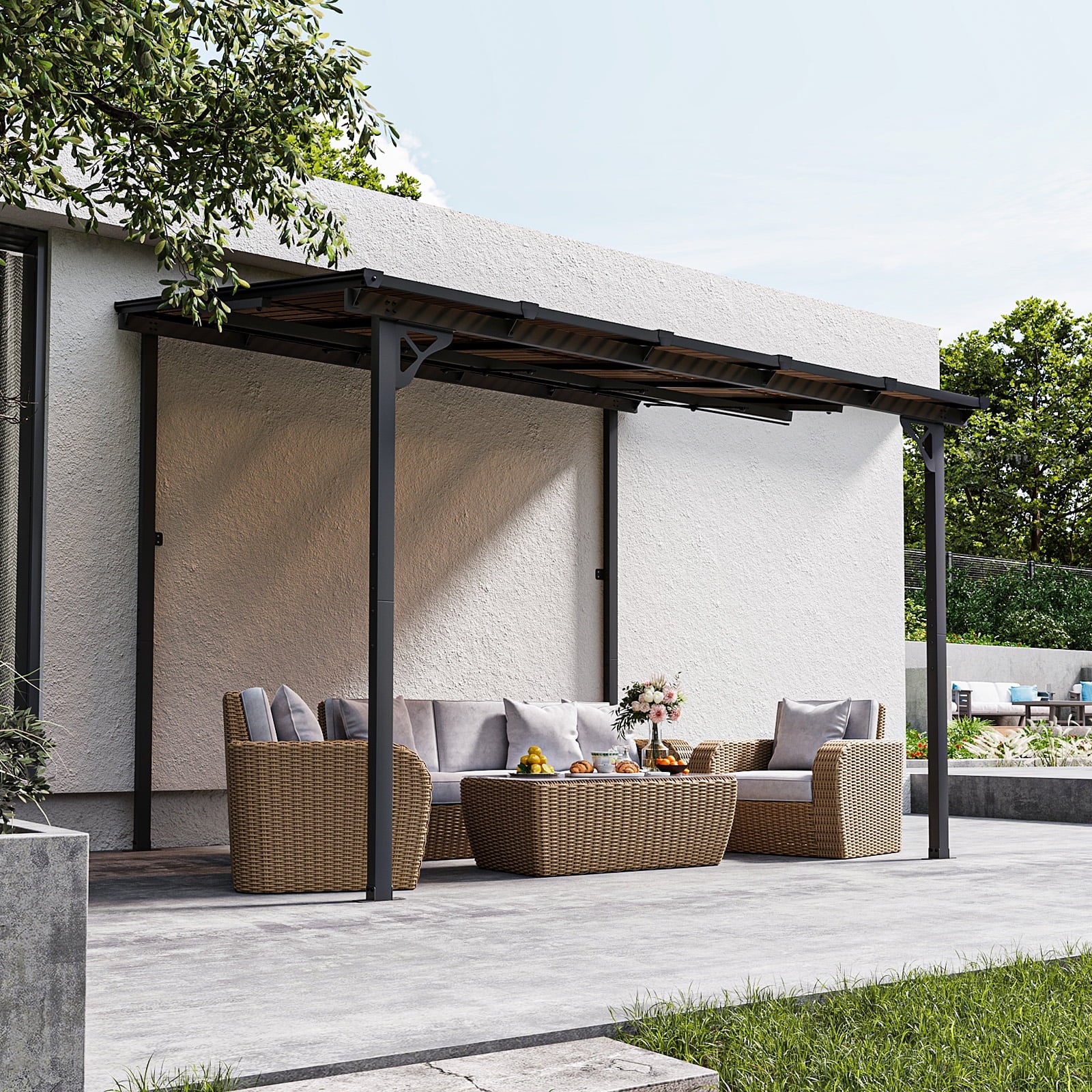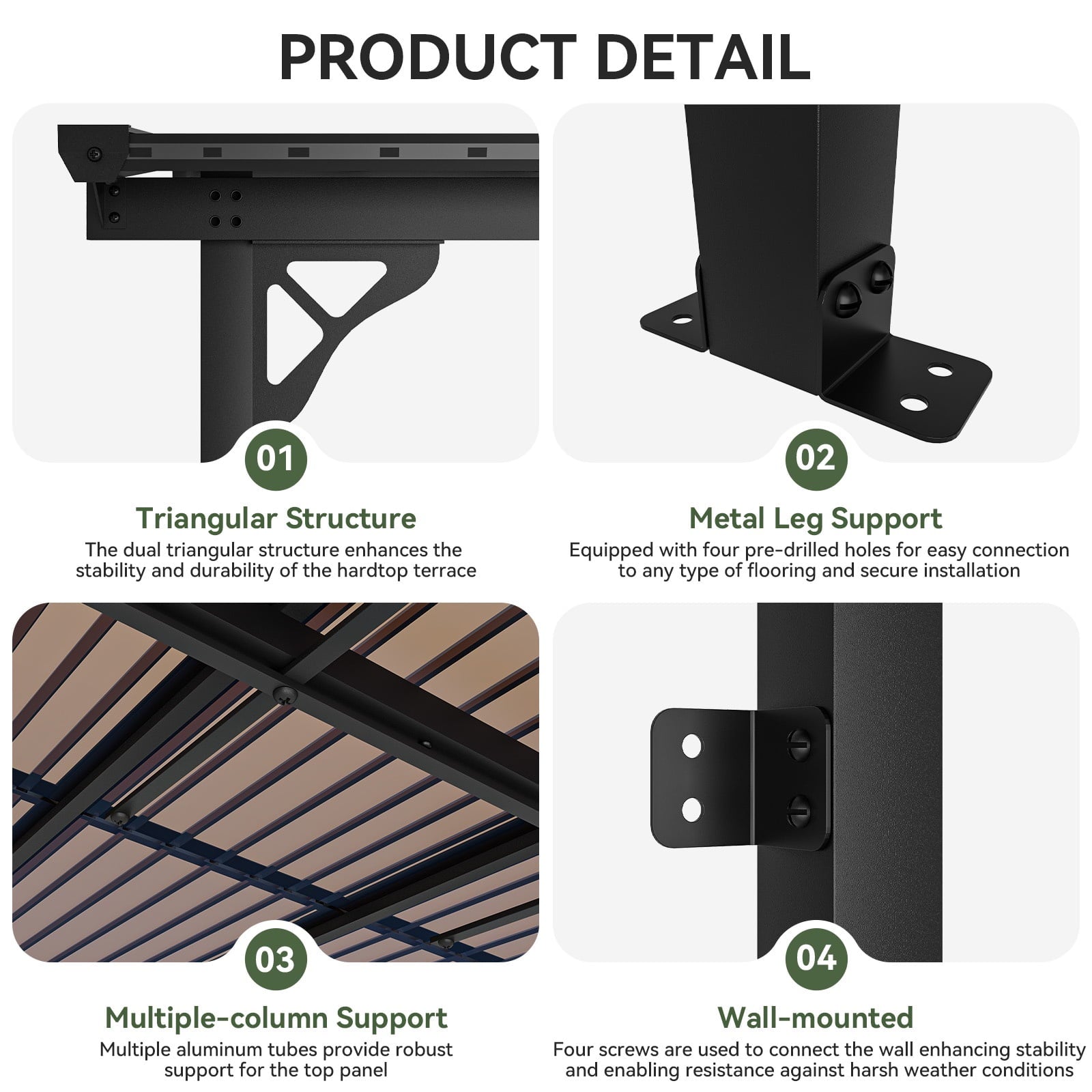 • Stable and Solid:Carbon steel frames and triangle metal structure greatly ensure the durability, stability and sturdiness of our patio pergola. It is designed to provide partial shade and create a defined space in an outdoor area
