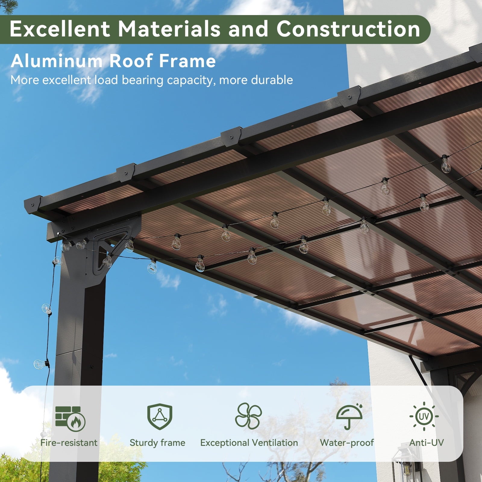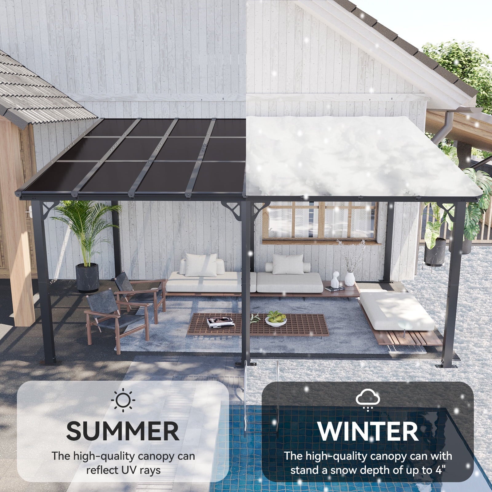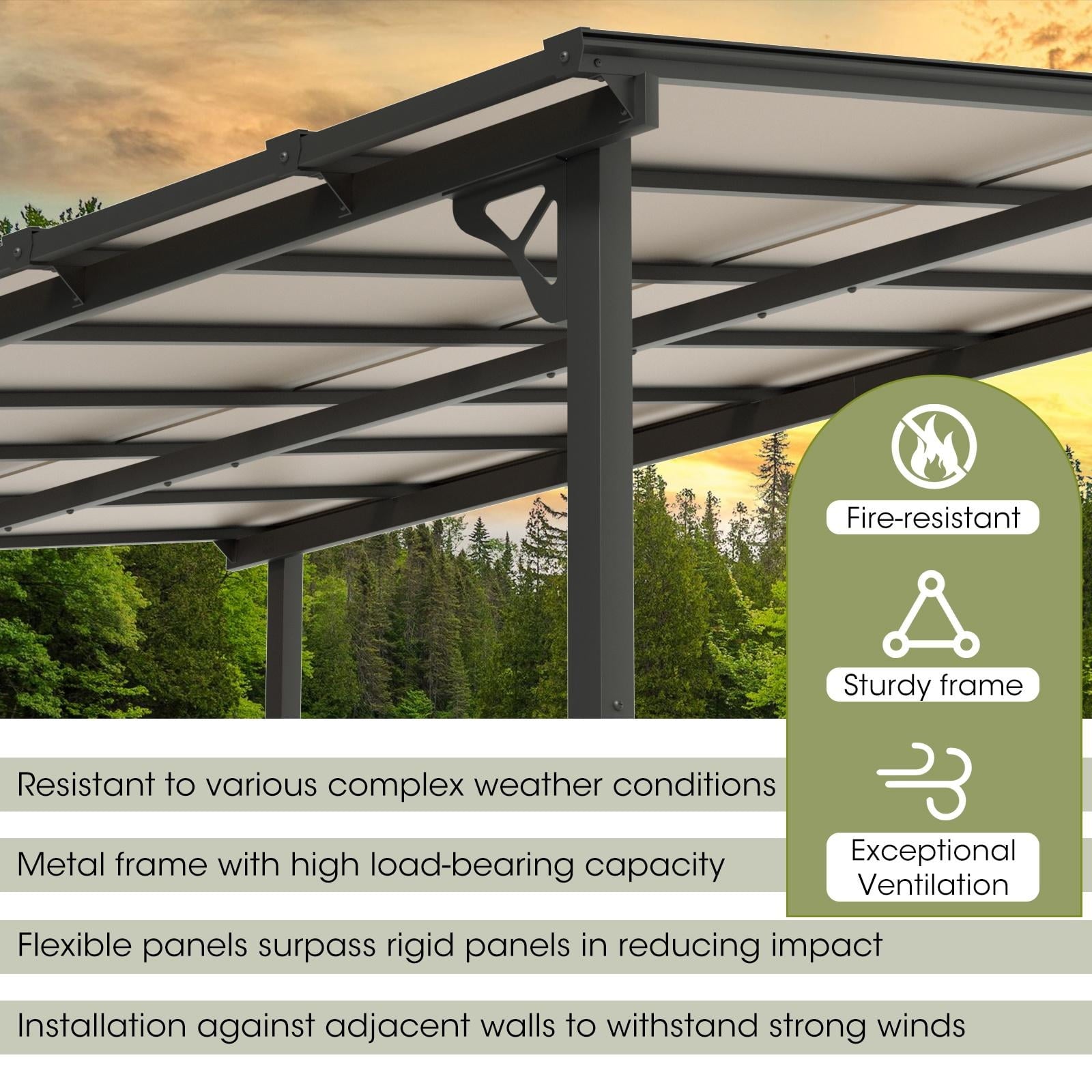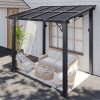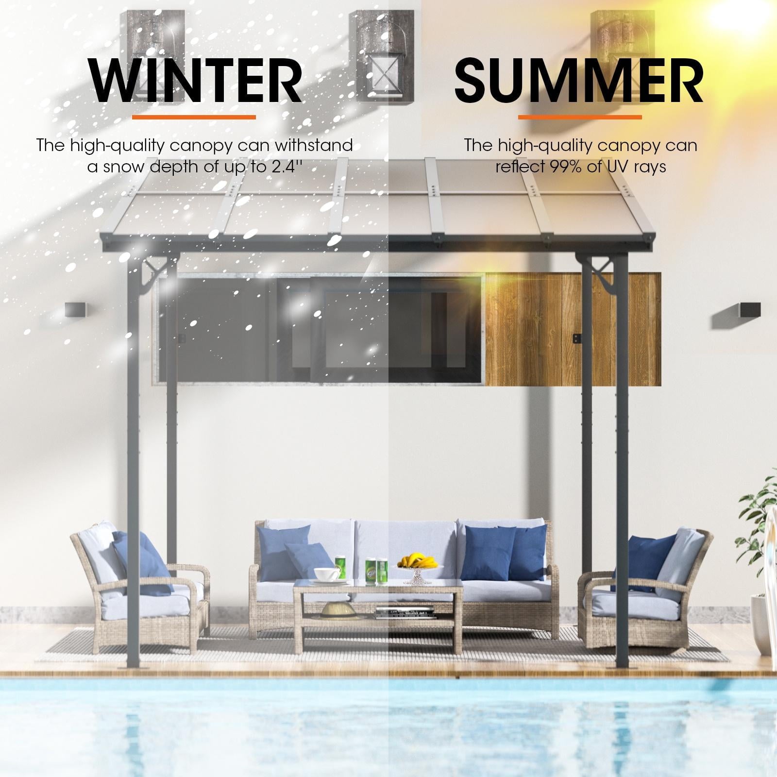 • Premium Material & Excellent Load-bearing:The top of the pergola has a remarkable load bearing of 55 lbs/㎡, which is resistant to various complex weather conditions as long as it is wall-mounted with expansion bolts. Besides, the polycarbonate top is able to reflect 99% of UV rays and thus provide UV protection
