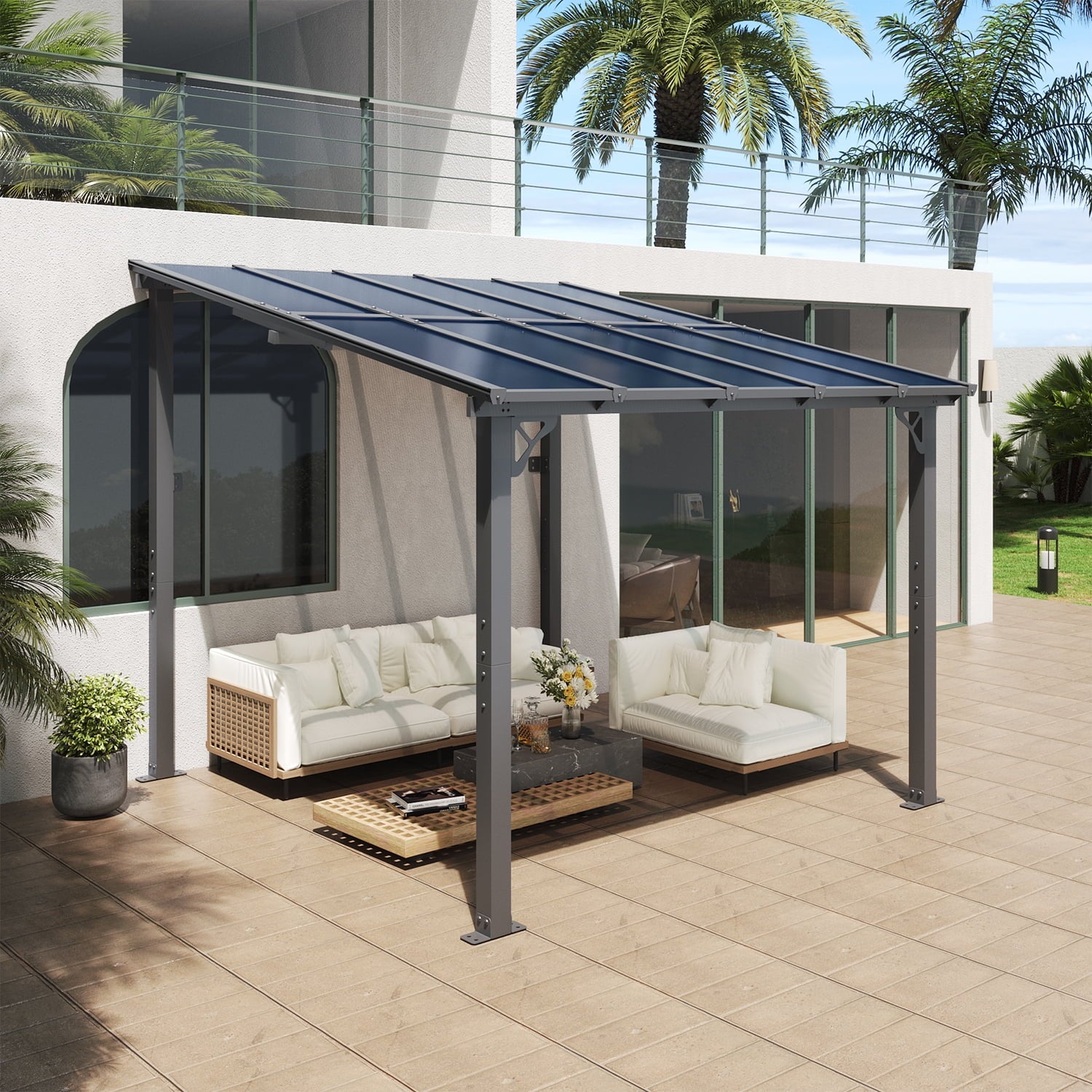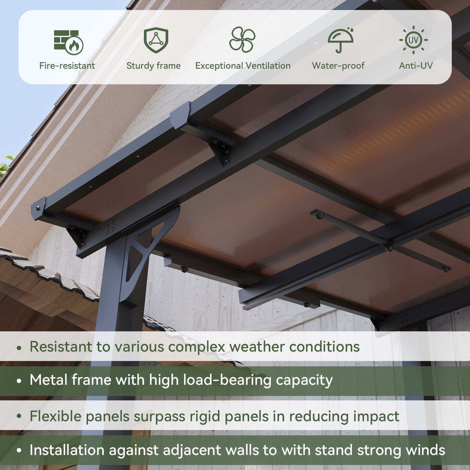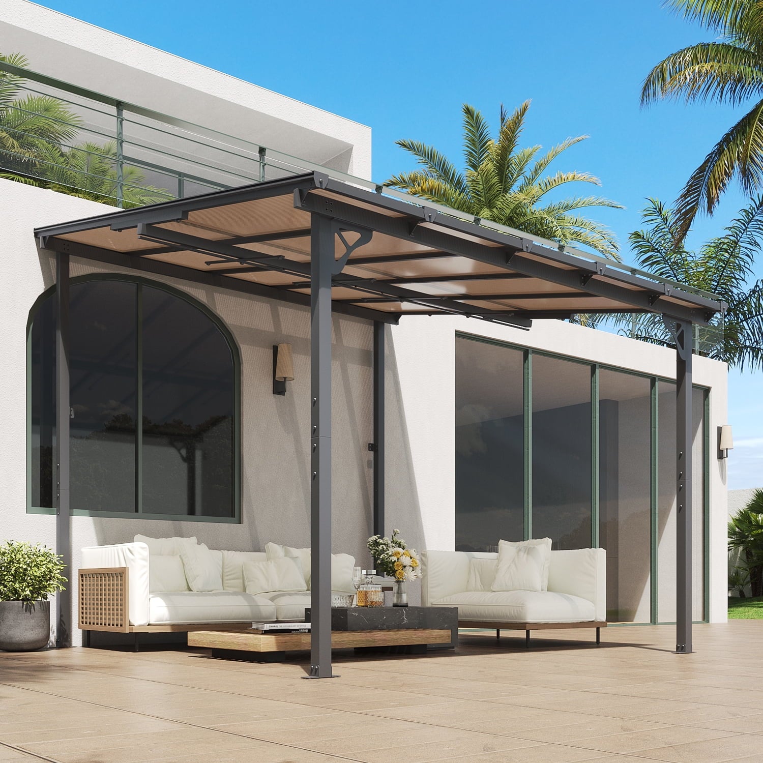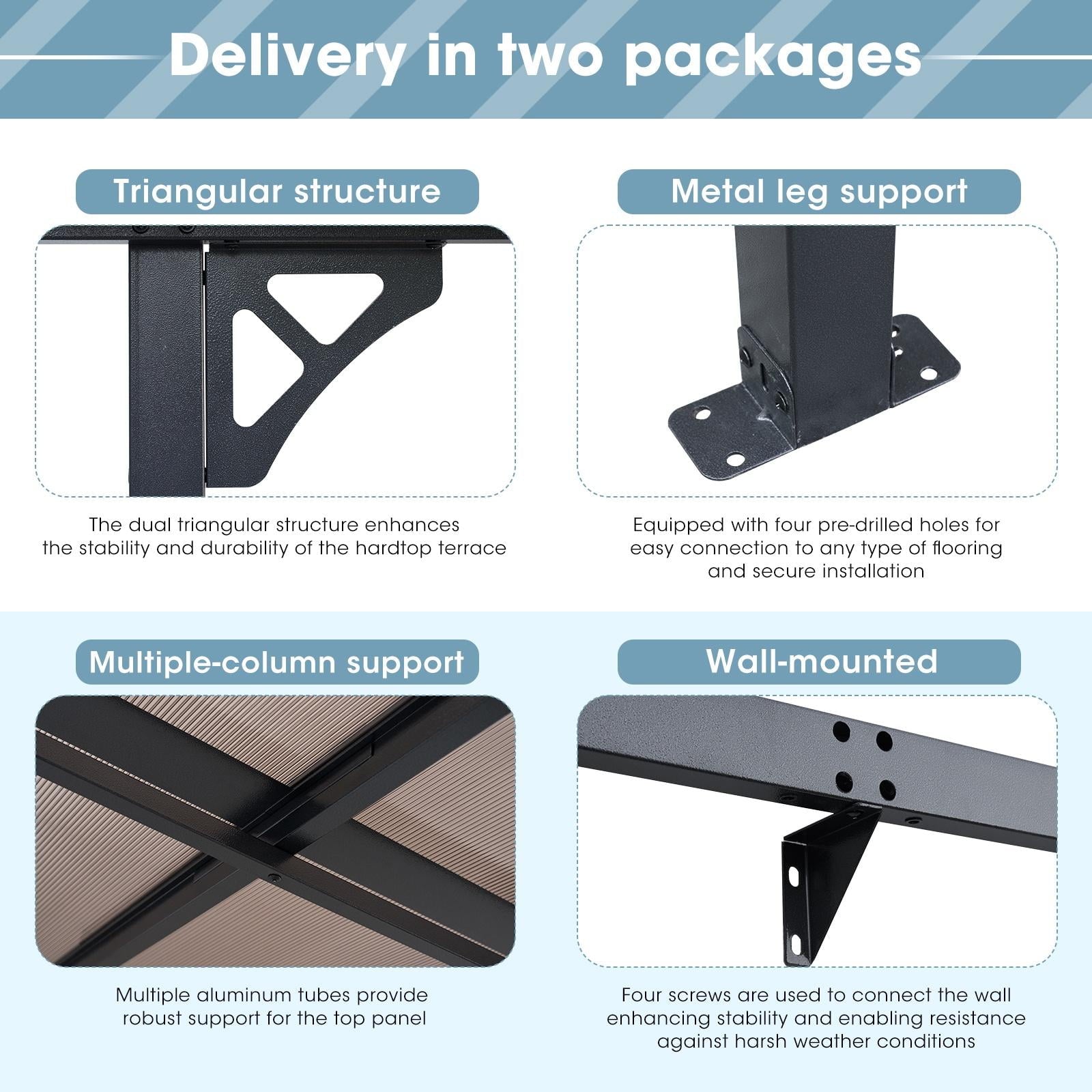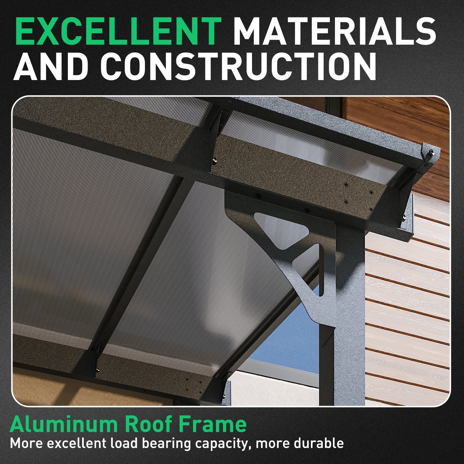 • Premium Material & Excellent Load-bearing:The top of the pergola has a remarkable load bearing of 55 lbs/㎡, which is resistant to various complex weather conditions as long as it is wall-mounted with expansion bolts. Besides, the polycarbonate top is able to reflect 99% of UV rays and thus provide UV protection