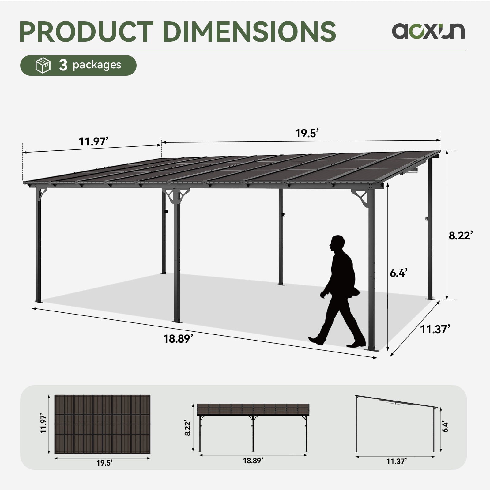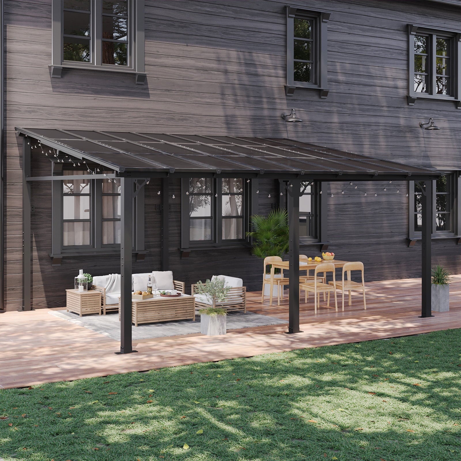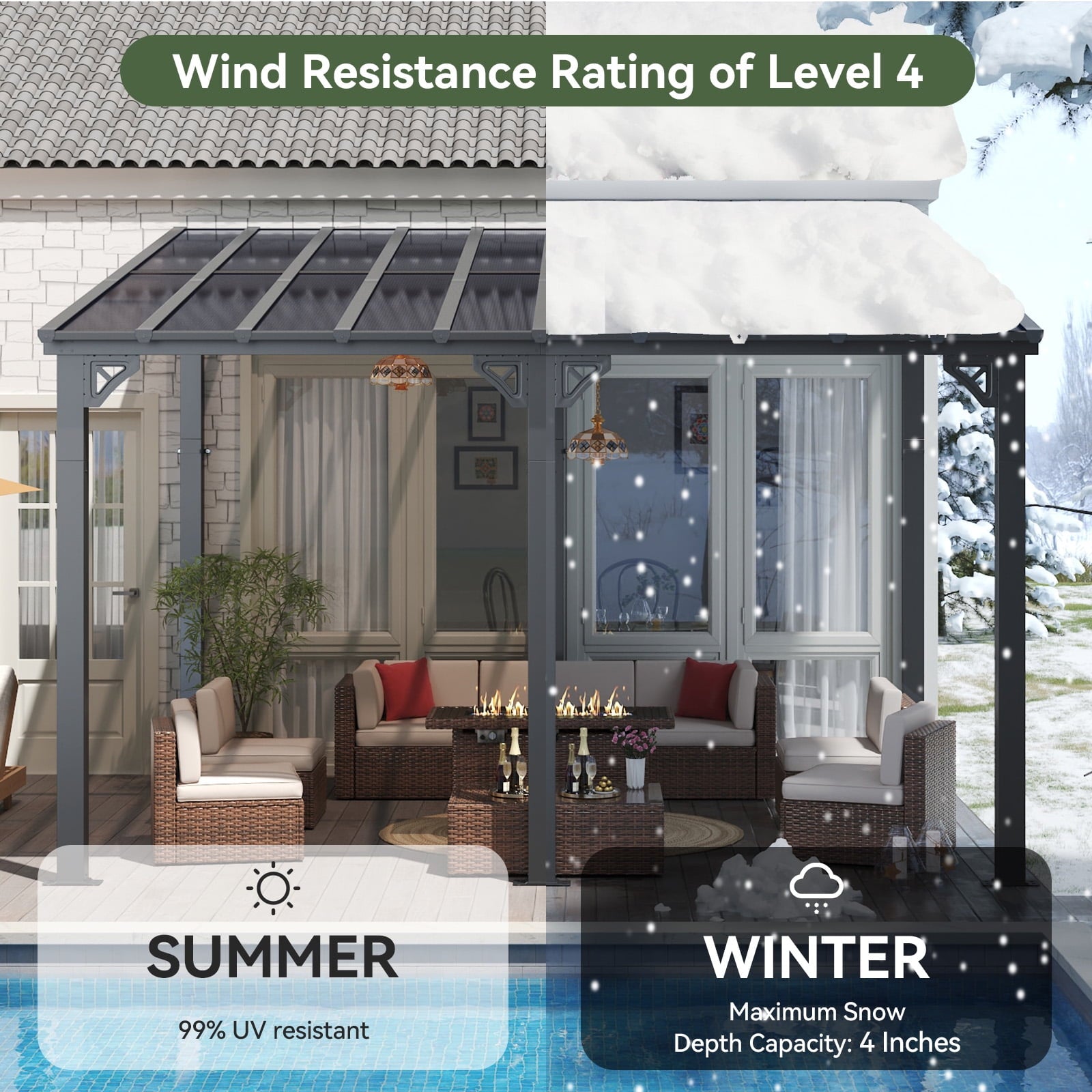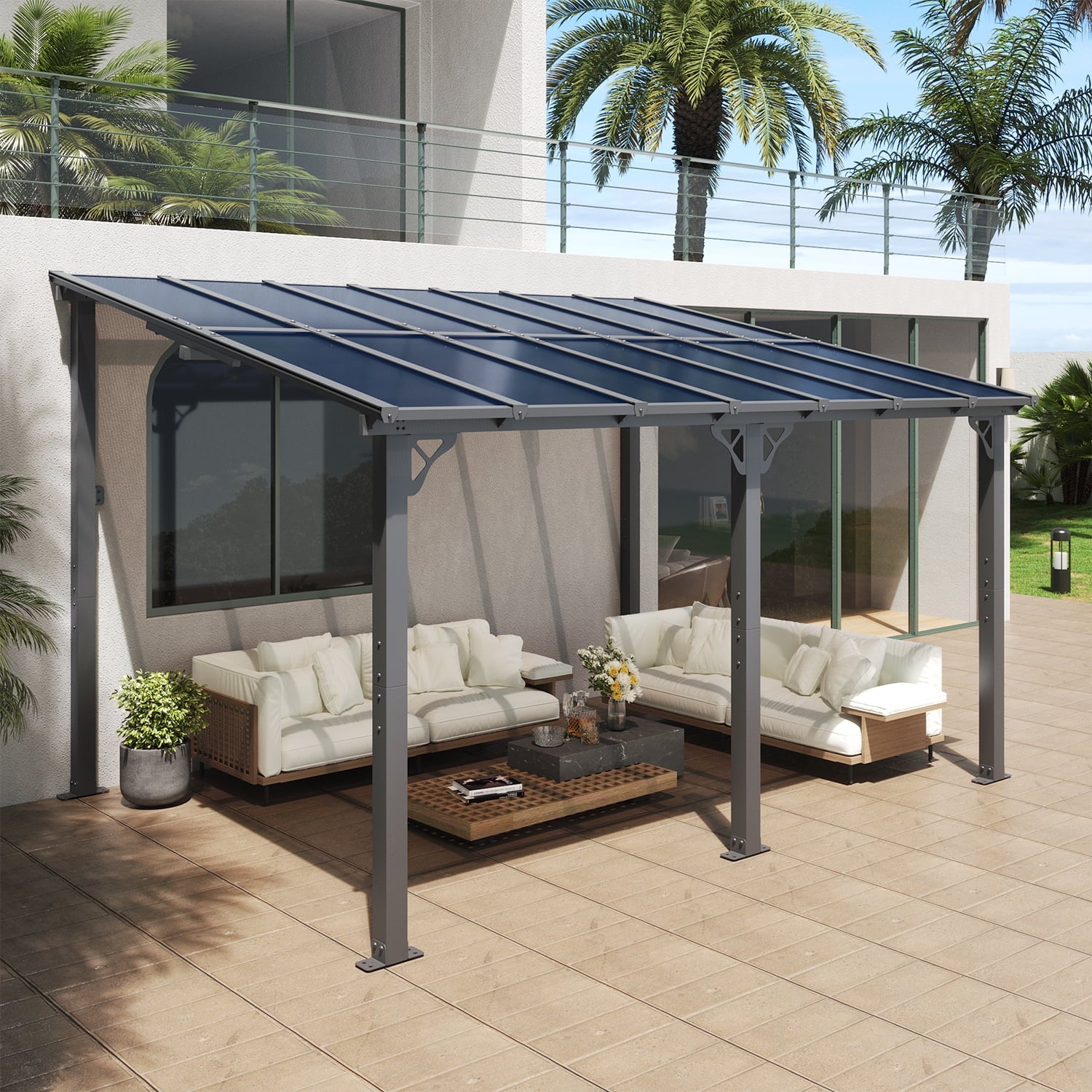 • Premium Material & Excellent Load-bearing:The top of the pergola has a remarkable load bearing of 55 lbs/㎡, which is resistant to various complex weather conditions as long as it is wall-mounted with expansion bolts. Besides, the polycarbonate top is able to reflect 99% of UV rays and thus provide UV protection