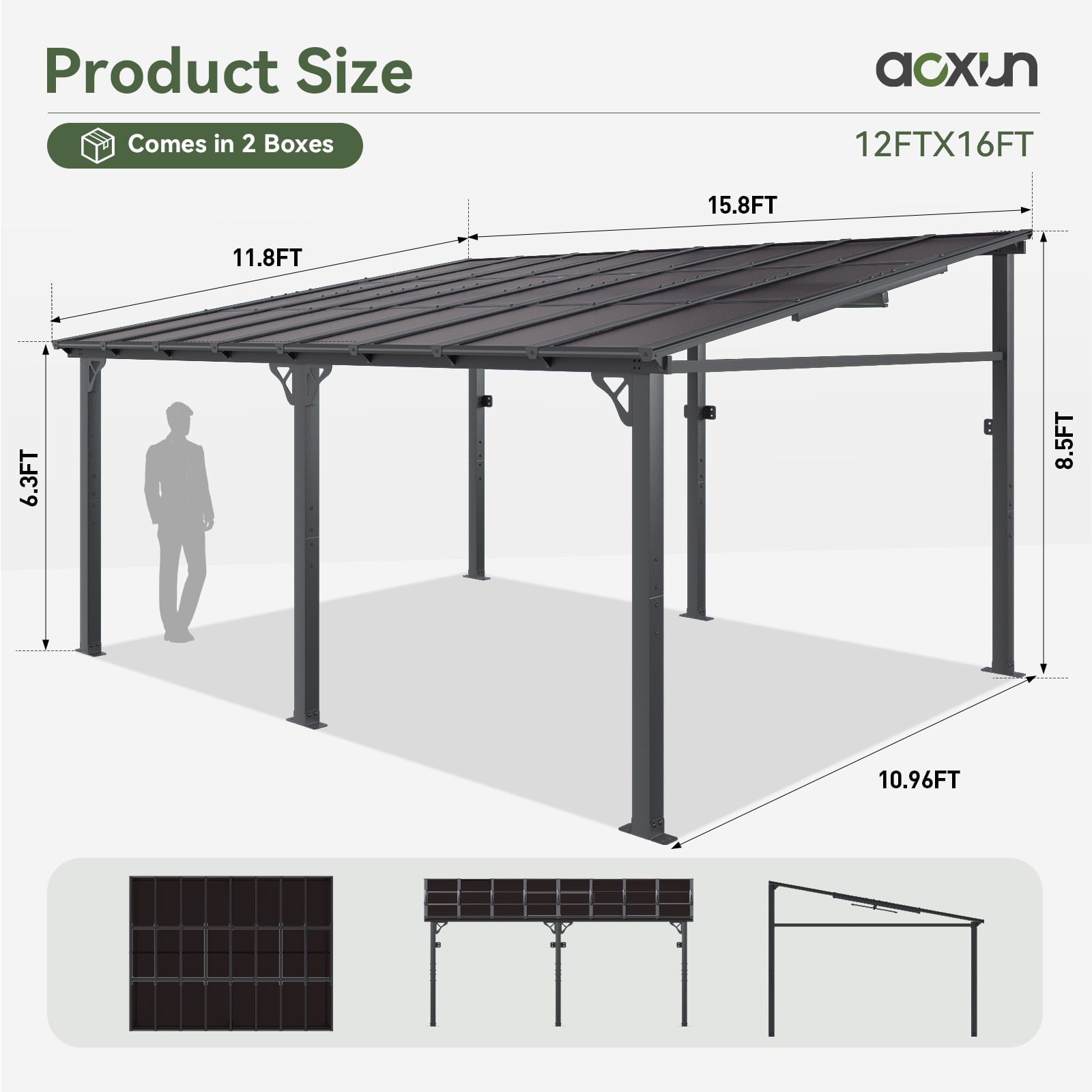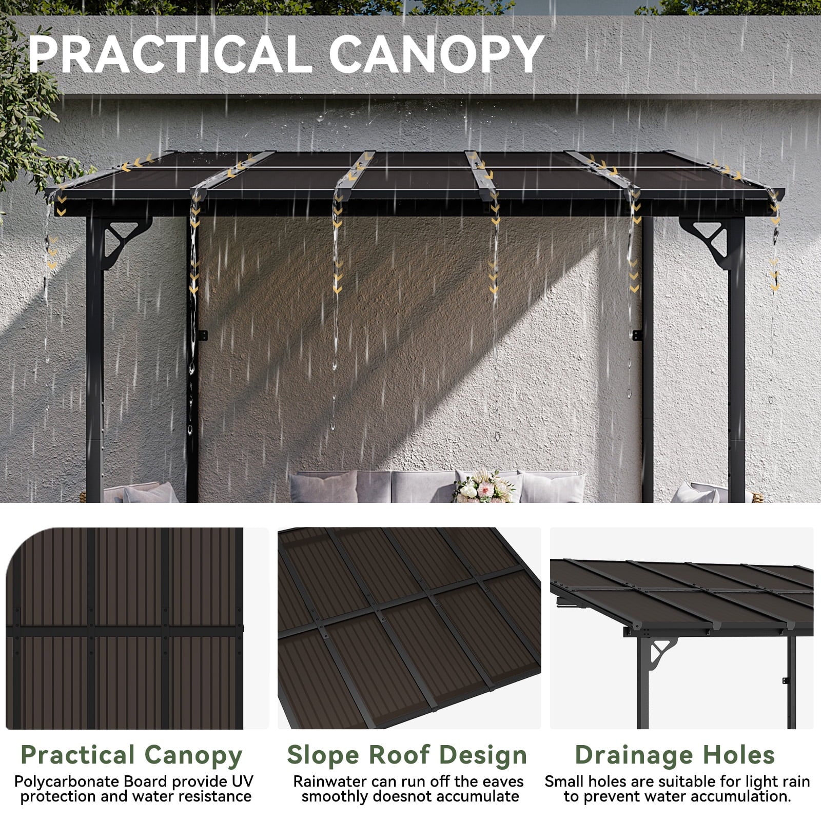 • Sloped Roof and Drainage Holes:Sloped roof design make the rainwater run off the eaves smoothly and easily, reducing the problems of water accumulation. This patio pergola also features drainage holes to help better drain water