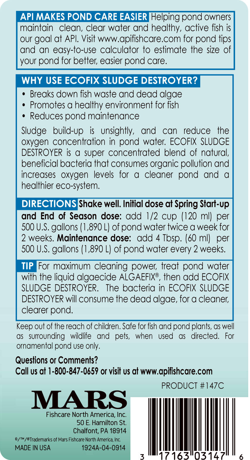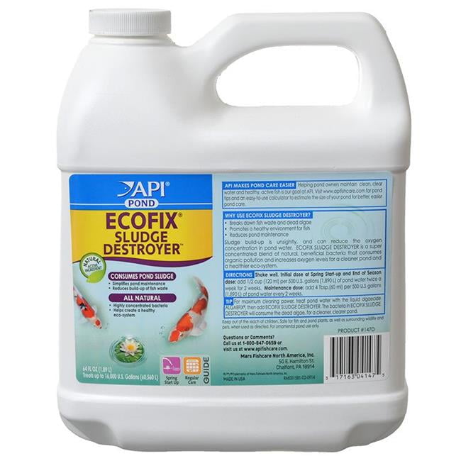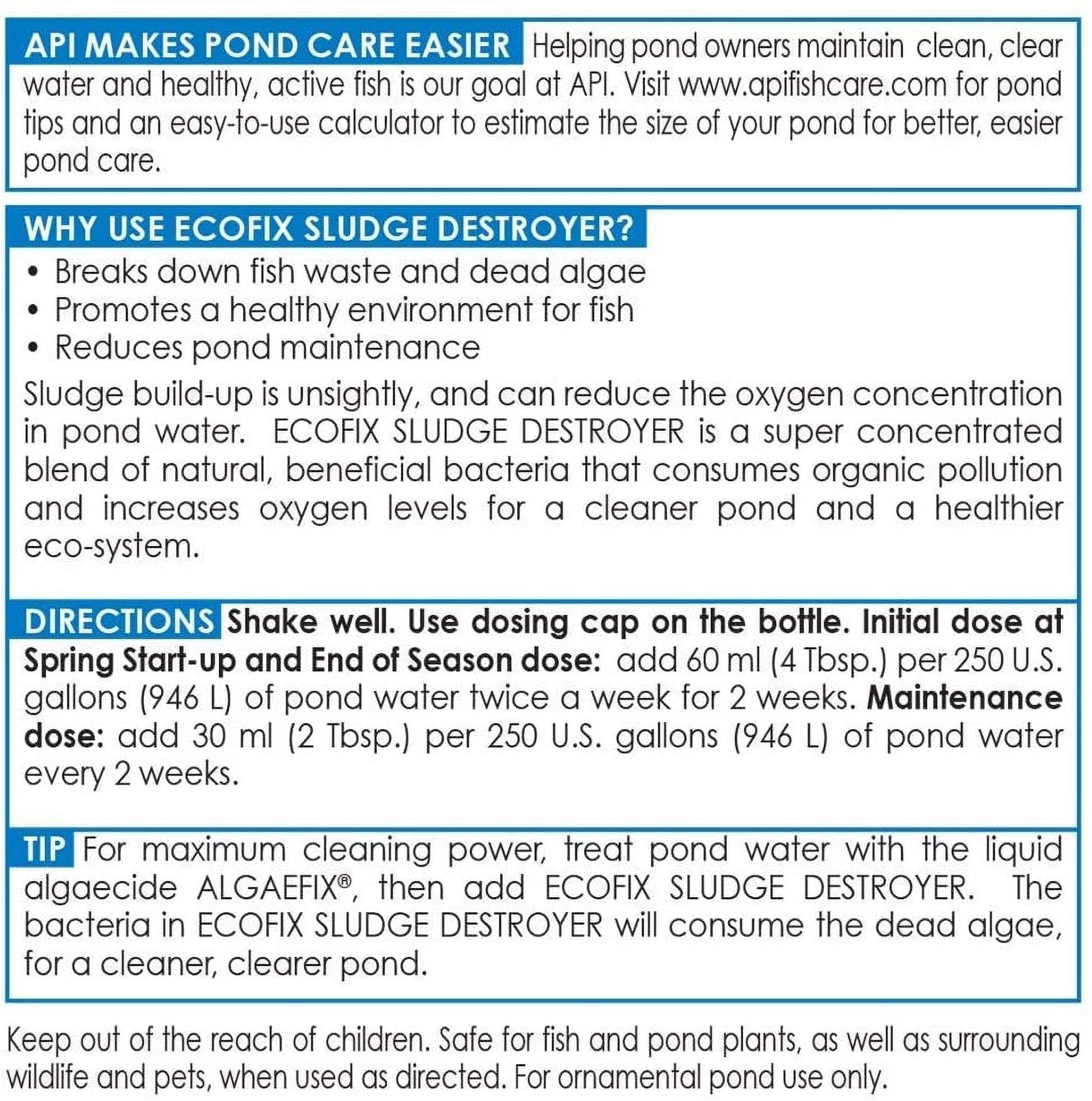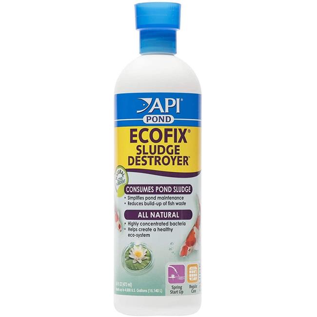 API POND ECOFIX SLUDGE DESTROYER Pond Water Clarifier reduces build-up of fish waste and consumes pond sludge, which is typically an accumulation of organic matter that degrades water quality and clogs pumps and filters. API ECOFIX SLUDGE DESTROYER contains all-natural, highly-concentrated bacteria to break down fish waste and dead algae, digest leaves and grass clippings, and reduce overall pond maintenance for the season. Use twice a week for two weeks as an initial dose at the start of the season, quick clear-up, and end of season, and once every two weeks for regular maintenance. With API POND products, it?s easy to keep a beautiful pond. For over 50 years, API has been creating innovative, research-driven solutions that make it easier to care for your pond. API POND Pond Treatment Supplies are designed to work in conjunction with each other to provide best results to control algae, promote healthy bacterial growth and help control and mediate fish diseases and conditions such as ich and fin rot. They work to provide a safe, hospitable environment for fish such as koi, catfish, perch, goldfish and more. With API, you can spend more time admiring your fish, and less time scrubbing your pond. Make sure to use all products as directed in order to ensure the best results.