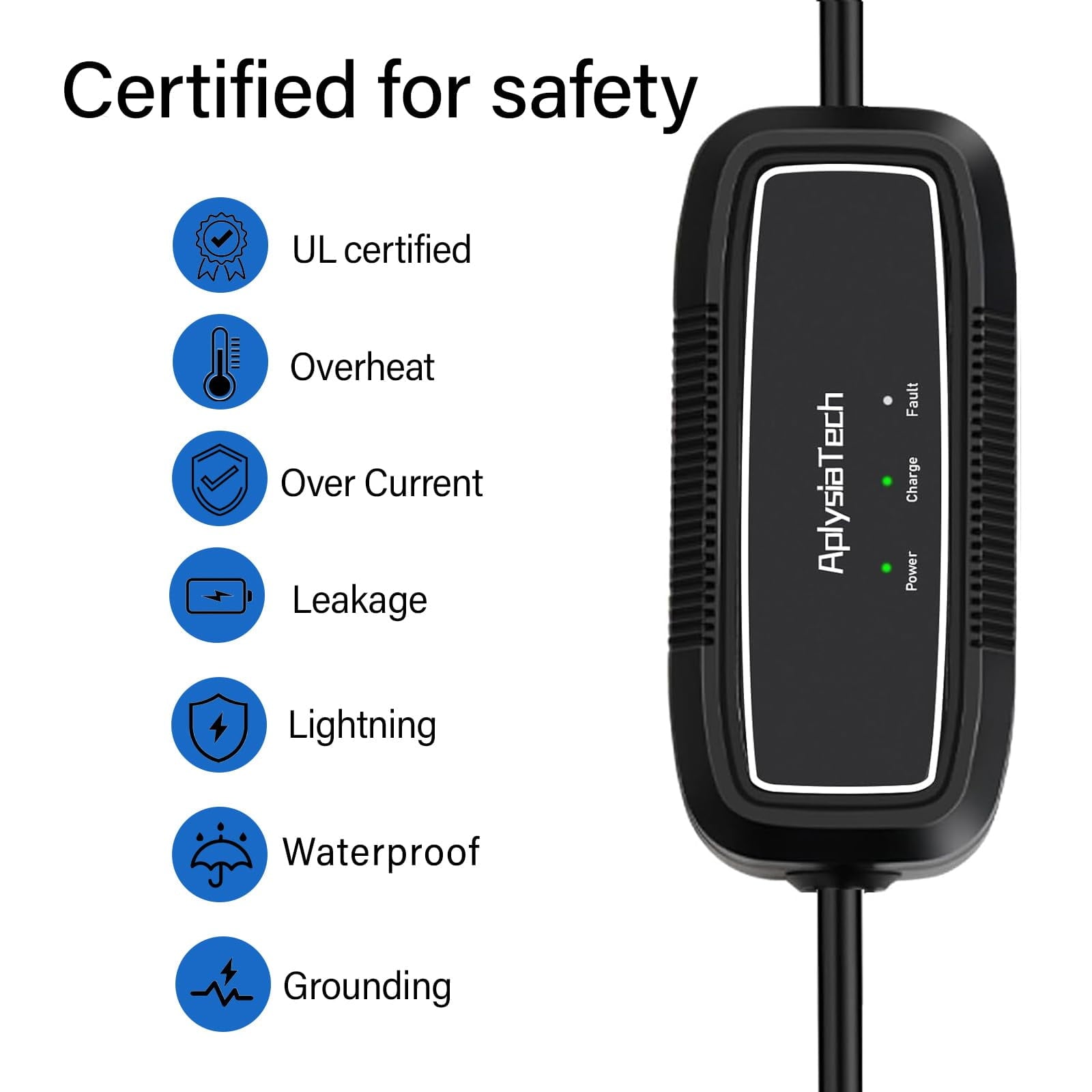 An indicator light on the controller box is used to show the charging phase and to indicate possible errors. The easy-to-read indicator shows the status: state: “Power”, “Charging”, “Fault”.It’s easy to see even at night, displaying charging status and anything unusual with different flashing frequencies.just plug and charge, learning the working status at a glance to help you to identify the working state of electric vehicle charger.AplysiaTech EV Charger equipped with ground protection detection, mainly to ensure that you can safely use the charger. If you connect it to the converter cable but are not grounded, the electric car charger will flash a red warning light and stop charging.