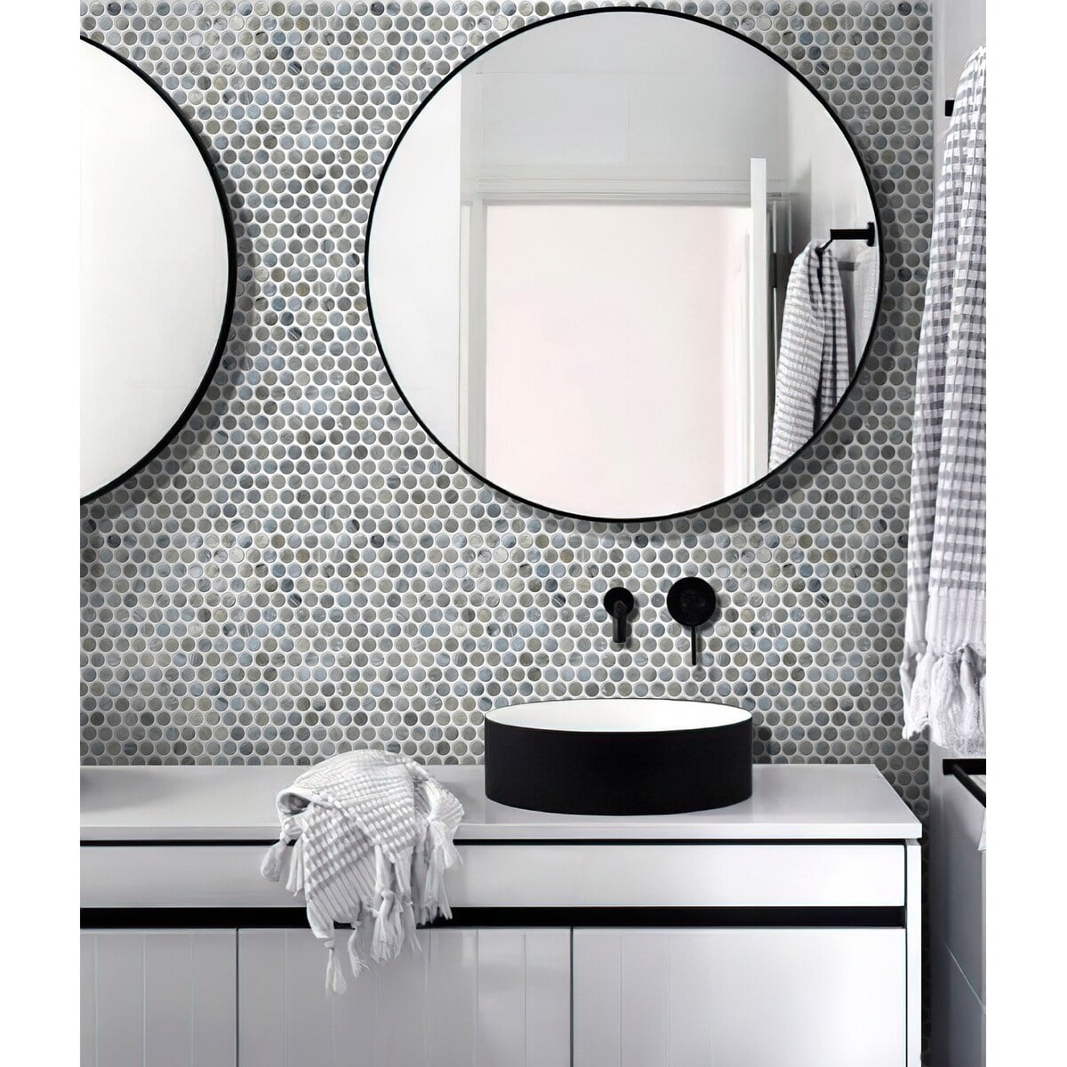 Sleek and graphic, this glass penny tile comes with an impeccable stylish charm and durability. The delightful combination of the neutral hues and luminous glass surface makes any interior look attractive. Its polished finish captivates the beautifully reflecting light – perfect to add a glamorous appeal to your kitchen backsplash, bathroom floor or accent wall designs. Small tiles increase grout lines which improve the grip on tile surface, making tile a practical solution for the walk-in shower, bathroom or entryways where slip-resistance may be a concern. The classic penny round pattern gives interest with the ability to visually expand small rooms with limited square footage. Give a modern feel to your vanity backsplash, shower or fireplace with durable glass tiles that will fill the room with a luminous light-reflecting effect.Sleek and graphic, this glass penny tile comes with an impeccable stylish charm and durability