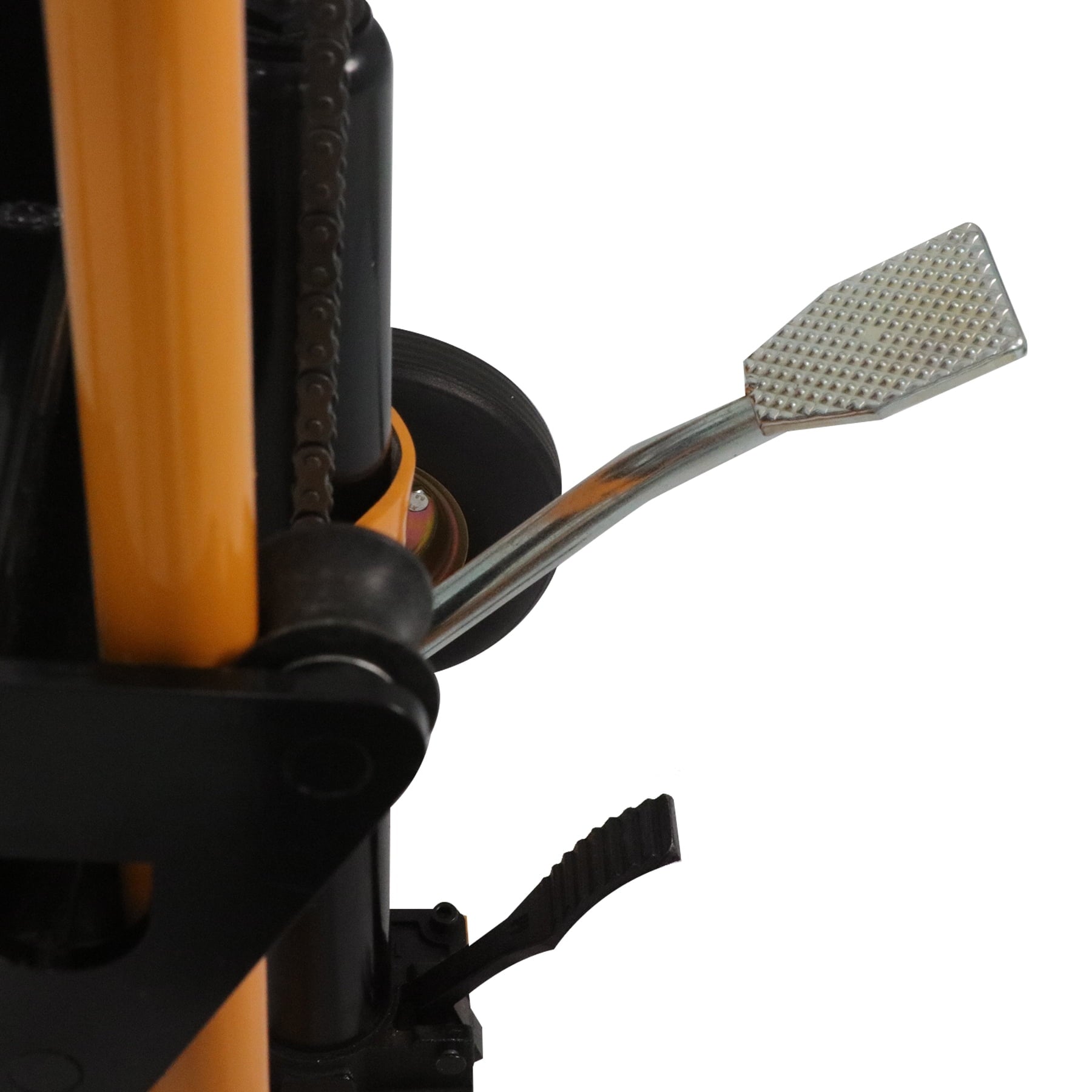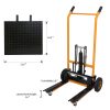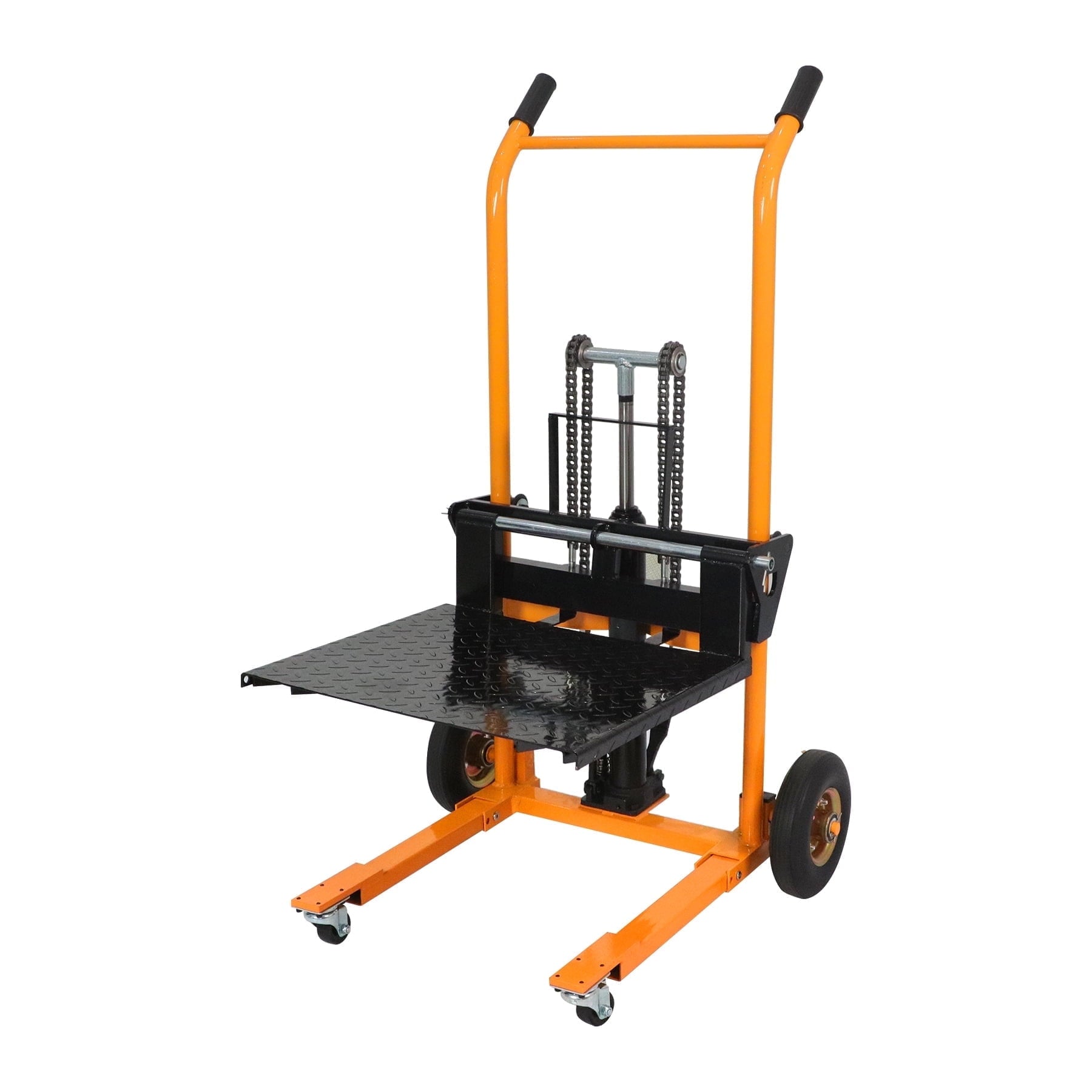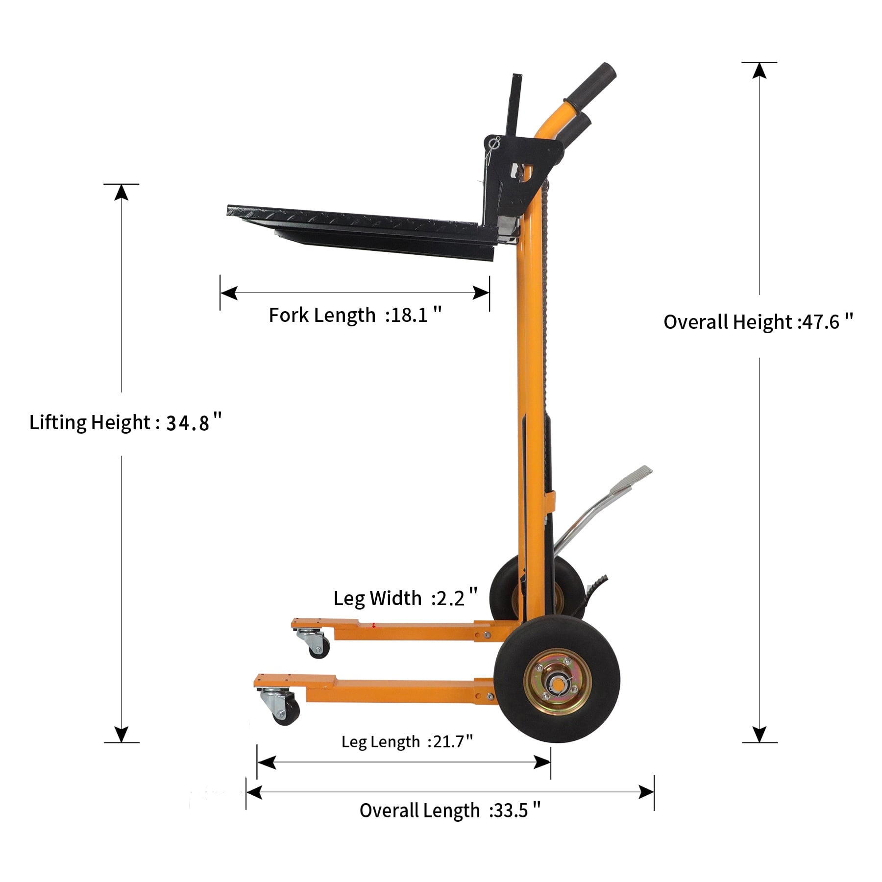 The Material Lift Winch Stacker is a heavy-duty machine with a 440lb capacity, combining stacker and hand truck functions. It features swivel casters and a manual winch to lift objects up to 35.4“, boosting productivity and reducing fatigue in warehouses.