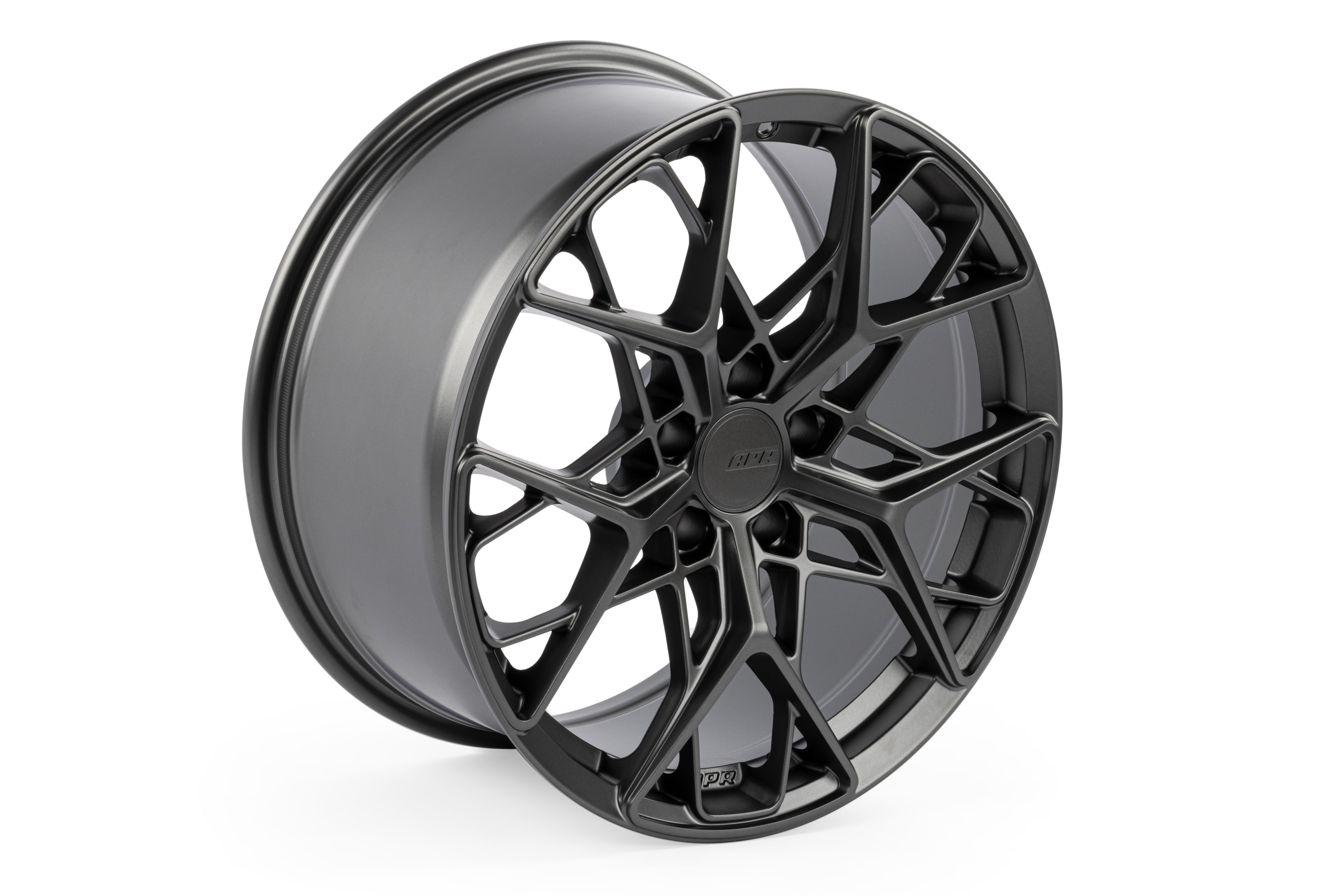 APR A02 Flow Formed Wheels pay homage to several classic wheels in a new and unique design that is sure to turn heads! Central to the wheel is a classic 5-spoke pattern that has been hollowed out for weight savings and interlaced inside of a 5-spoke Y pattern that pays respect to the APR A01 wheels. The meshing together of these two iconic designs brings together a snow flake pattern we all love from decades past. The wheels are flow formed, which means they are strong and light weight, yet cost dramatically less then forged wheels. Finite Element Analysis (FEA) was used to reduce spoke width to reduce weight while providing the strength necessary to achieve a 720 KG load rating. Furthermore, weight saving pockets are cut behind the wheel face to reduce weight. Strong billet aluminum CNC-machined rings allow the wheels to be compatible with both common center bores, and won’t wobble, crack, or crumble like other materials. The center caps are removable and upgradeable and are even compatible with various OEM center caps for a stealth look! The lug bolts are compatible with OEM ball seat lugs, and the barrel has anti-slip machining features to prevent tire-to-wheel rotation. The A02 wheels are offered in various widths, diameters, offsets, and colors.;