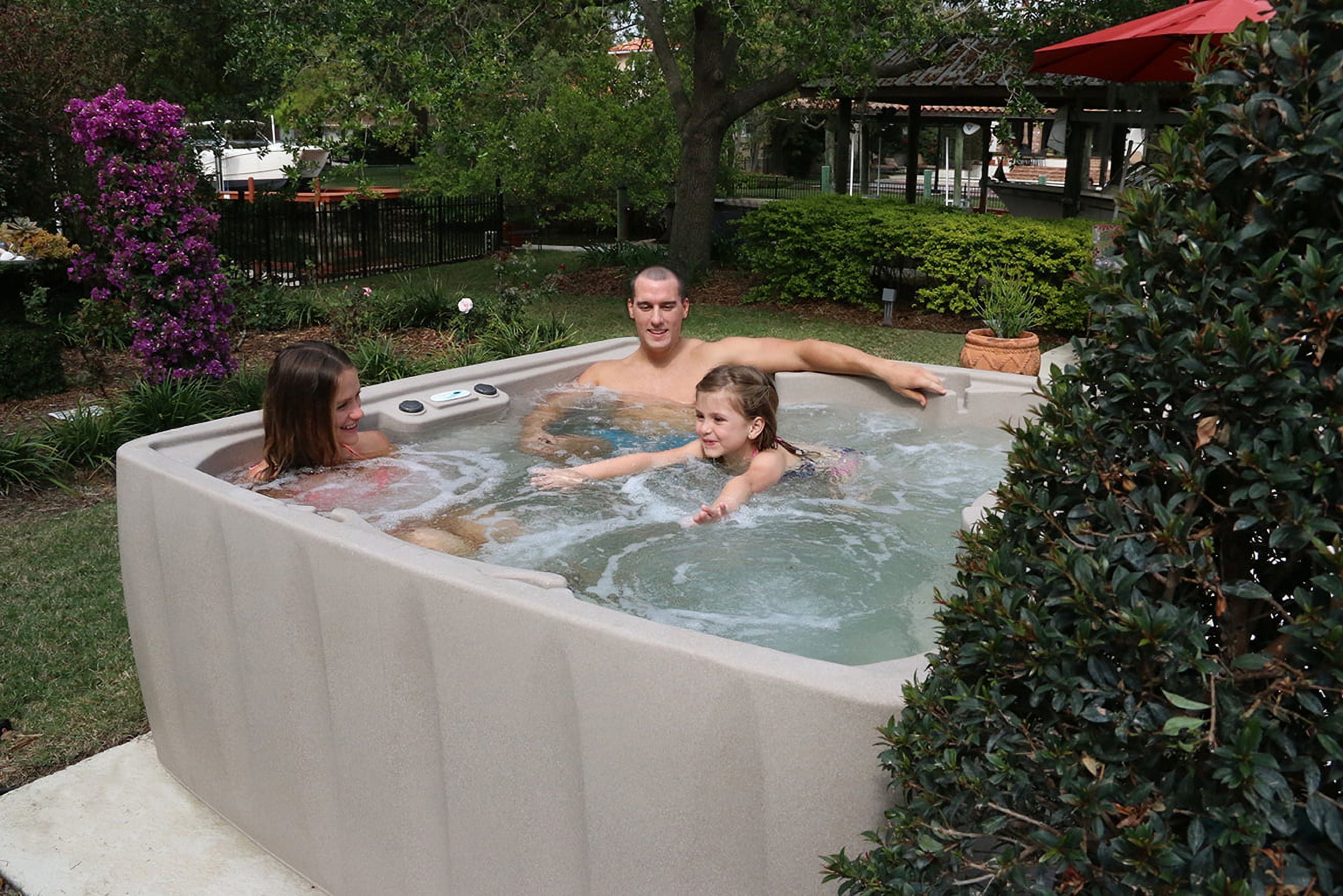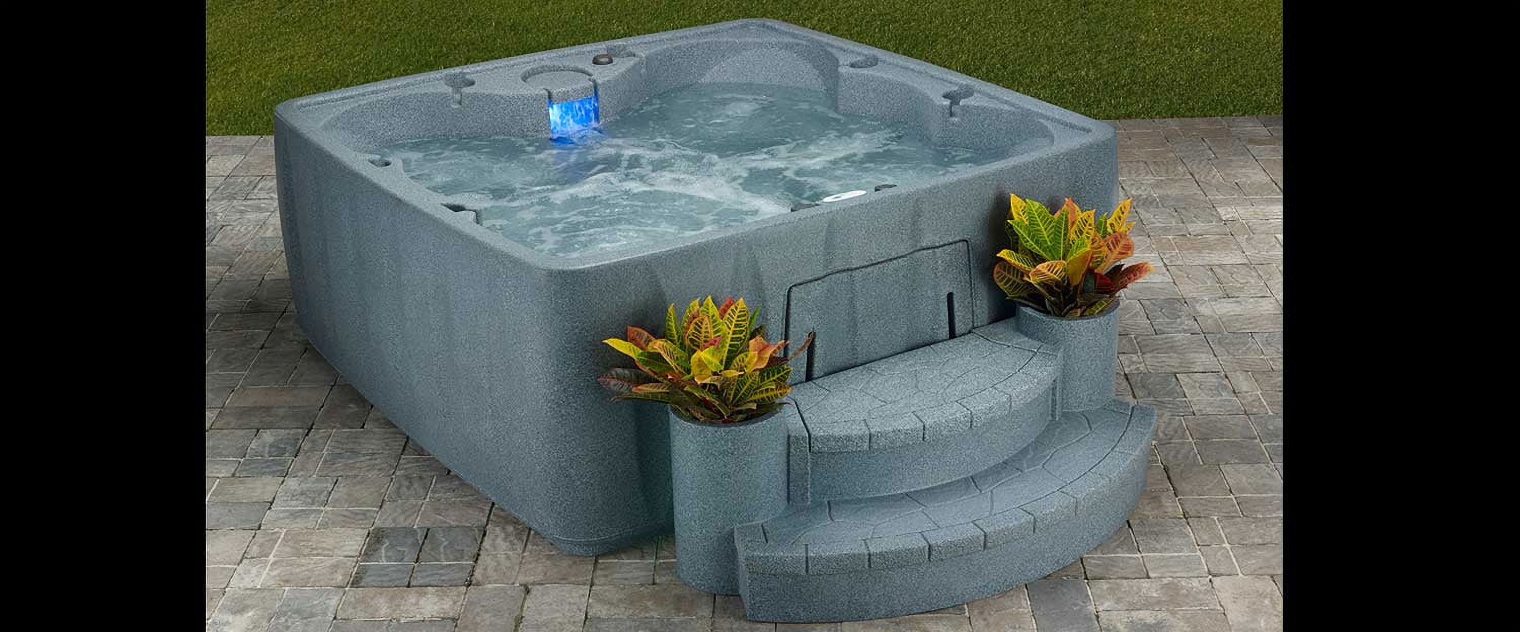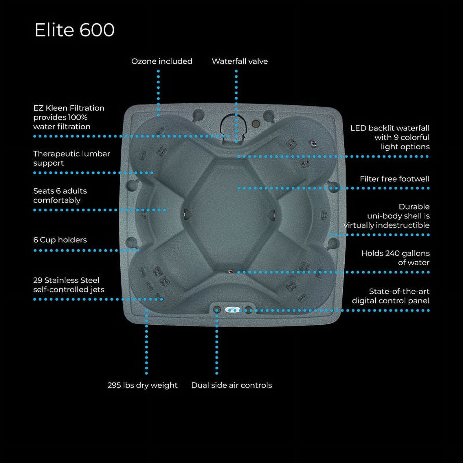 The AquaRest AR-600 Elite spa is a big spa with elite features at an affordable price. The AquaRest AR-600 Elite features the biggest footwell of any AquaRest hot tub model, ensuring that you have plenty of leg room to enjoy the hot therapeutic water pulsing through the 29 stainless steel two-tone jets. The AR-600 features 4 Captain’s seats and two cool-off seats. Each Captain’s seat features lumbar arch support and a unique jet configuration that pinpoints a different section of your back. Many hot tubbers will move from one seat to the next to get a complete back and neck hydrotherapy workout. The AR-600 Elite comes with our AquaPure Ozone system installed. The Ozone system works in conjunction with your spa chemicals to help kill bacteria and pollutants to ensure you have clean, crisp water. This feature alone can help you save up to 75% on your chemical costs, plus giving you more time to relax in the spa and less time maintaining it! The AquaRest AR-600 Elite is manufactured using a process known as “roto-molding”, making the AR-600 Elite unbelievably sturdy and able to withstand all types of weather, while also remaining extremely portable, weighing in at only 295 lbs. The AR-600 Elite offers top of class hydrotherapy, powered by the premium 1.5HP pump. While relaxing in the AR-600, enjoy the patented LED backlit waterfall with 9 colorful light settings that helps create the perfect ambiance for any situation. Sometimes a beverage is called for while relaxing in your spa, so enjoy the 4 deep cup holders included on every AquaRest AR-600. Your AquaRest AR-600 comes with dual side air controls, allowing you to adjust the water flow to each seat. All Aquarest Spas include a state-of-the-art Balboa digital control with freeze protection and simple to use push button controls. The AquaRest AR-600 Elite includes the patented Easy Kleen 100% water filtration AND a powerful Ozone Purification system, ensuring that you spend less time maintaining and more time enjoying your AquaRest AR-600. The AquaRest AR-600 Elite is energy efficient, meeting the strict California energy efficiency code. You can relax knowing your spa is using less energy with full-foam insulation and an ASTM-certified locking safety cover to deliver optimum efficiency. The AR-600 Elite runs on just a 110-volt 15-amp service, allowing you to easily set it up. It is literally a “Plug-n-Play” hot tub. If you add everything up, The AR-600 Elite Simple, Portable, Durable, and Affordable! Set it up, fill it up, plug it in and enjoy! Time to relax and enjoy this affordable, comfortable spa without breaking the budget. The AquaRest AR-600 Elite is proudly manufactured in the USA! – 79″ x 79″ x 32″ – 295 lbs – 240 Gallons – 29 stainless steel jets – 110-volt 15-amp electrical – Digital Control – 1.5HP pump – Patented LED backlit waterfall with 9 color settings – Patented Easy Kleen 100% water filtration system – Ozone Purification System – decreasing up to 75% of your chemical costs – Portable – Durable – Affordable