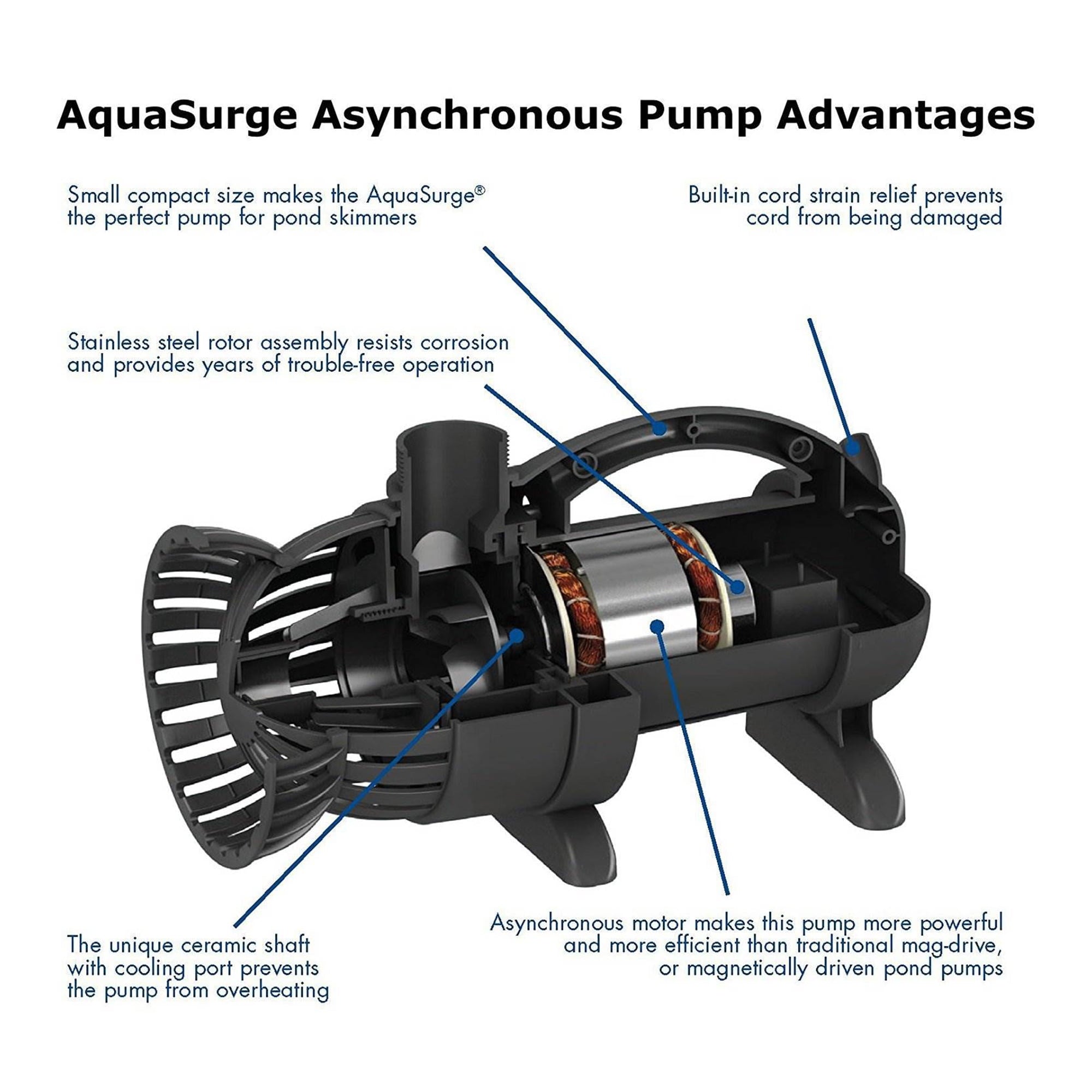 Featuring an asynchronous motor, this water pump is powerful and extremely energy efficient compared to traditional water pumps. Ideal for use in ponds, waterfalls, and other water features, the AquaSurge 5,000 was designed for continuous use. Its compact design and ability to work in a horizontal or vertical orientation, make this the perfect pump for pond skimmers.