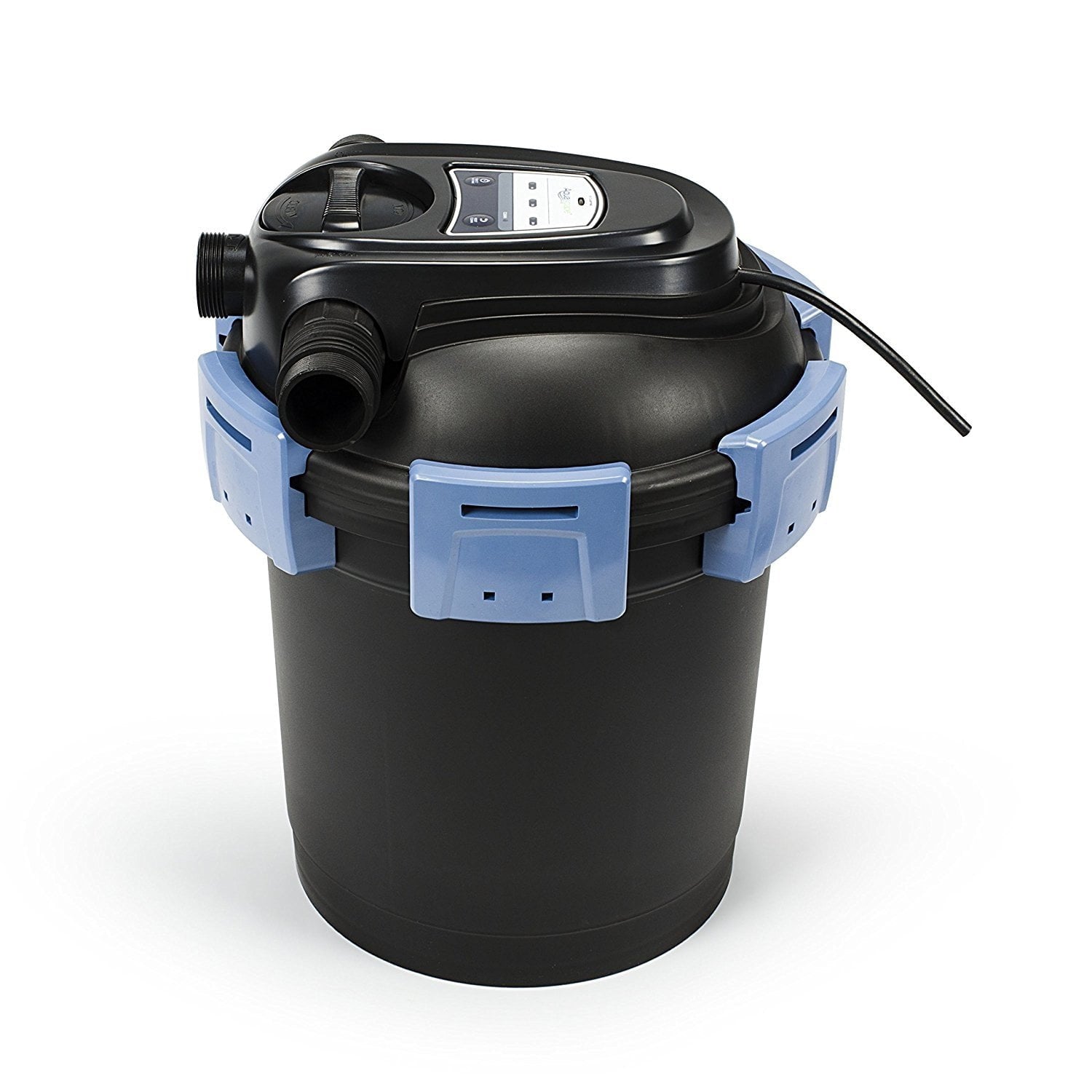 The Aquascape UltraKlean 2000 Biological Pressure Filter with high-output ultraviolet clarifier and integrated electronic bulb-saver provides pond owners with optimum water conditions and crystal-clear water for ponds up to 2,000 gallons (with a maximum flow rate of 2,700 GPH). The unique sponge-free design minimizes maintenance and maximizes efficient mechanical and biological filtration as the UltraKlean BioBalls create small channels by packing together, leaving behind unwanted debris. The UV clarifier/sterilizer eliminates single-celled algae commonly referred to as green water. The bulb-saver timer feature allows for bulb on/off customization to save bulb life and provides an ideal time to add water treatments while the Simple-to-use self-cleaning feature allows for the unit to be backwashed in less than five minutes without opening the canister or getting your hands dirty. A cleaning indicator light will automatically remind you when the filter requires backwashing. The Aquascape UltraKlean 2000 Pond Filter comes complete with all necessary fittings and is backed by a 3-year limited warranty, and features that stand above the competition.
