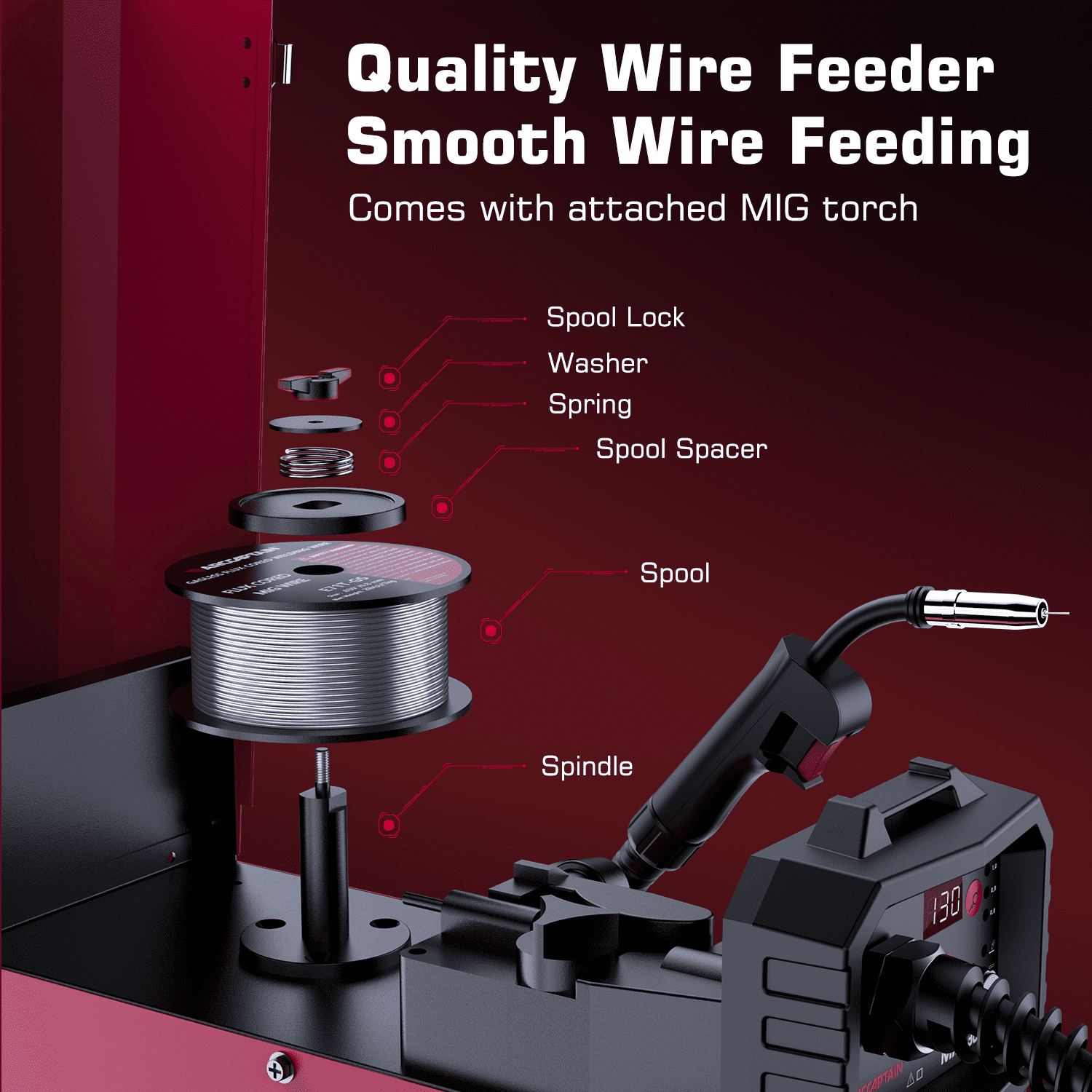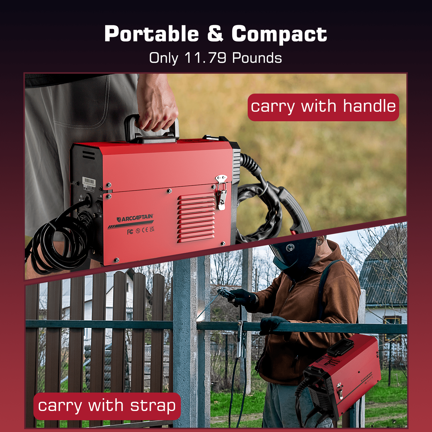 PORTABLE AND COMPACT: The machine weighs only 11.79 pounds, and you can freely carry it anywhere with a handle or shoulder strap. Extra 2lb flux-cored wire will be attached in the package, you can start to run the machine as soon as you open it.