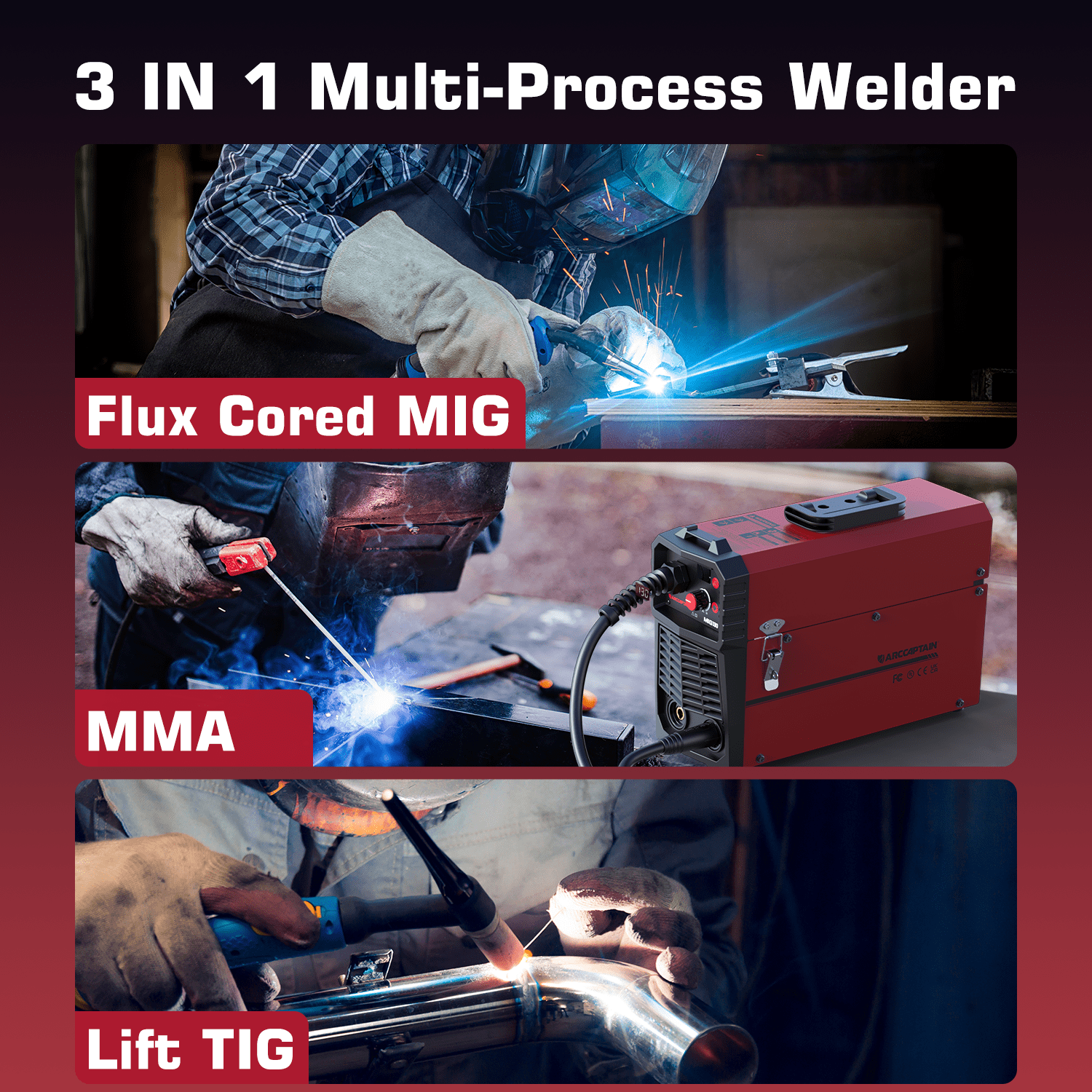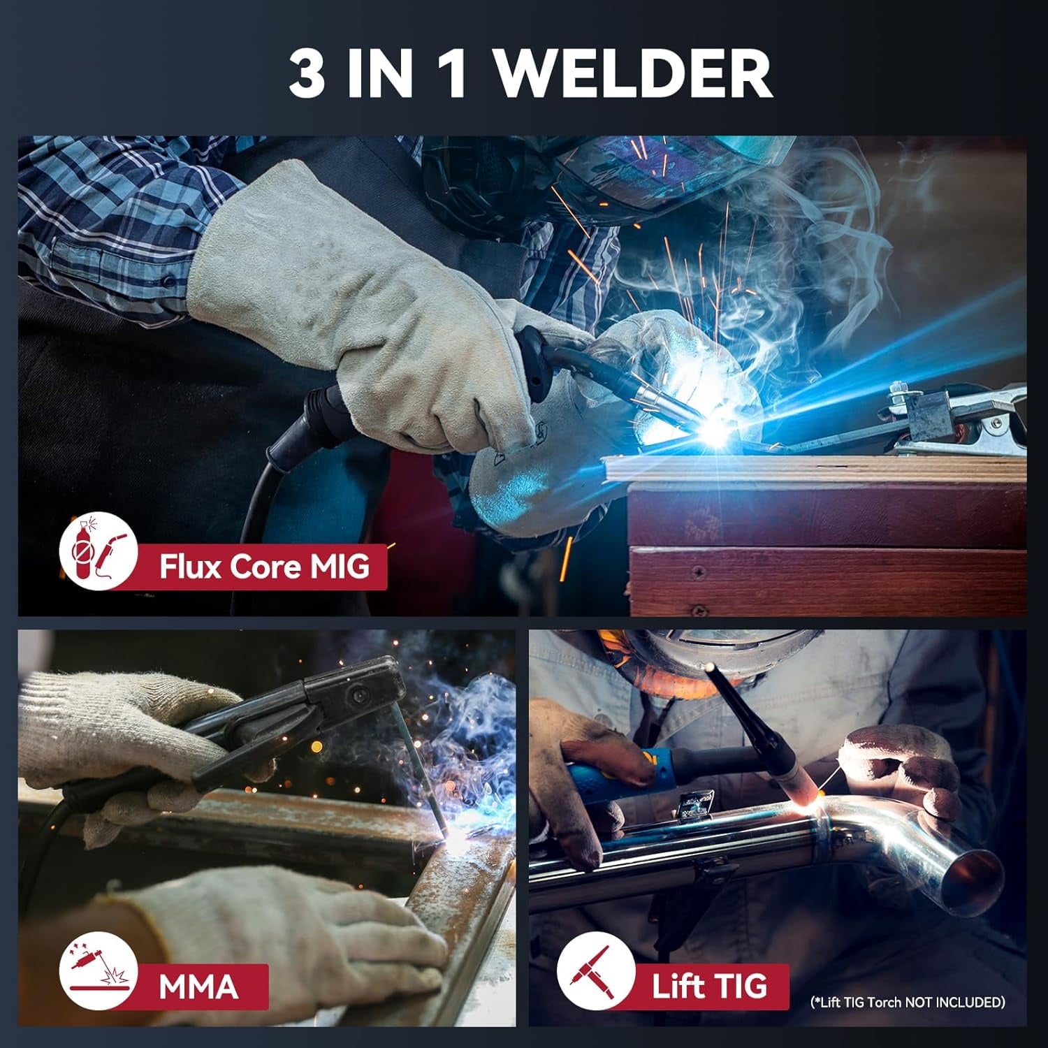 3 IN 1 WELDER: 3 welding modes Flux Core Gasless MIG/ Lift TIG/ MMA meet your different requirements (Need to buy extra Lift tig torch). Adjust the current and 10-speed variable feed controls for perfectly managed flux-cored welding of carbon steel, stainless or even thicker steel, Ideal for home DIY, outdoor repairs, rusty metal, farm and road equipment, and maintenance and repairs.