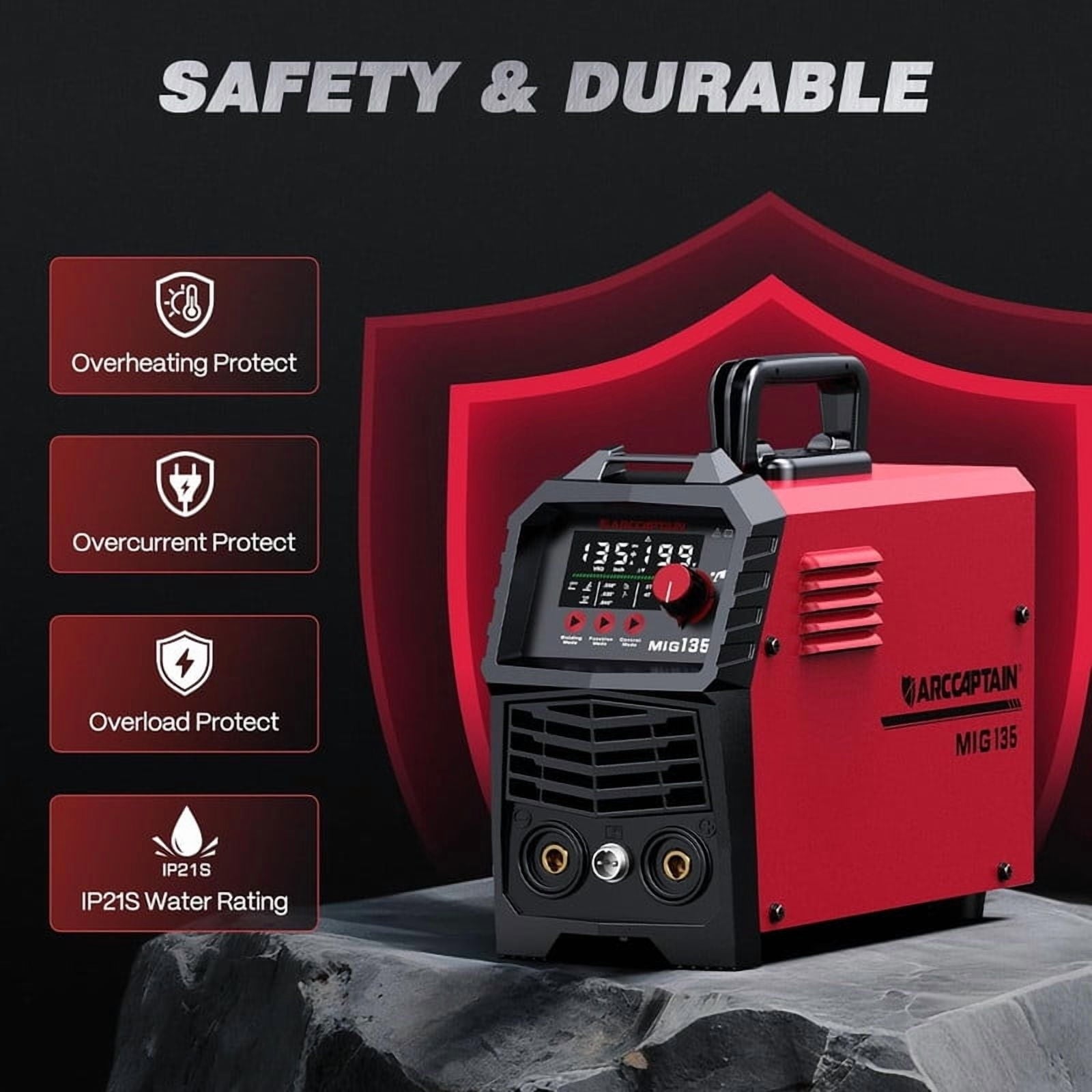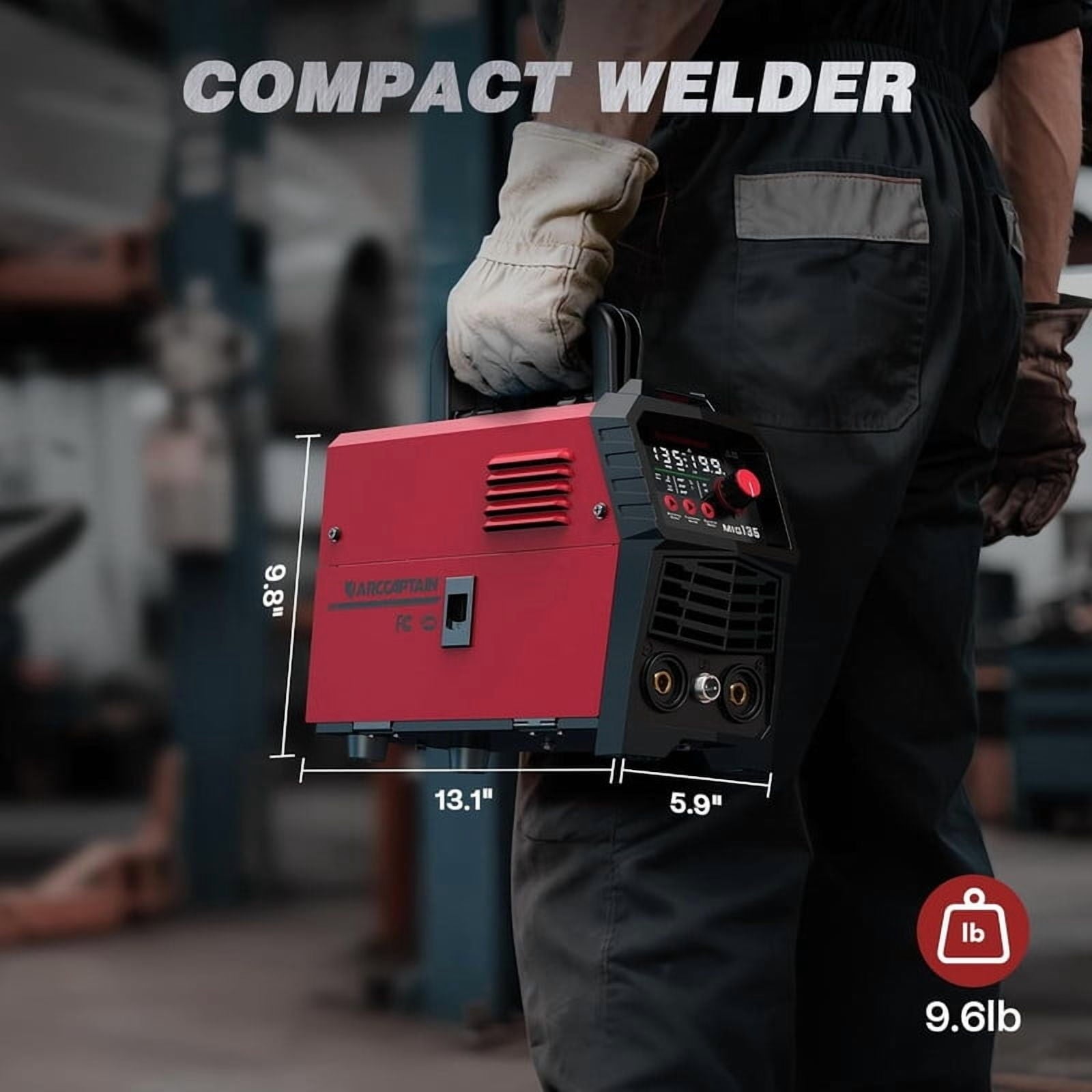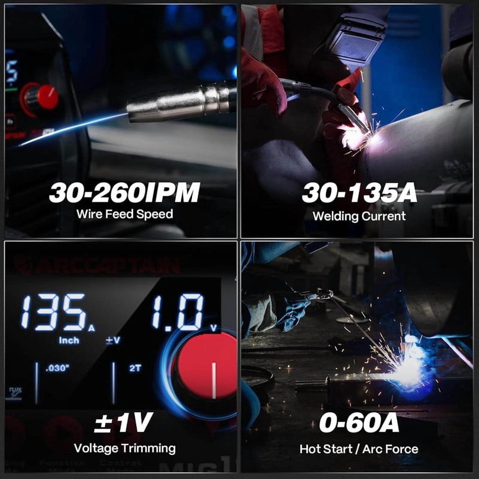 The ARCCAPTAIN MIG135 3-in-1 Welder masters Flux Core MIG, Lift TIG, and Stick welding with 135A power. Its Large LED Display delivers crystal-clear parameter visibility in any lighting, while auto-synced wire speed/voltage (based on metal thickness/wire size) makes setup beginner-friendly. Pros unlock precision via manual tuning (-1V/+1V voltage, 2T/4T modes, 60A Hot Start/Arc Force). Engineered with digital MCU tech, it achieves 30% smoother arc starts and 20% higher efficiency on carbon/stainless steel. Weighing just 9.48 lbs with a handle/shoulder strap, it’s ideal for mobile repairs. Built-in quad-protection