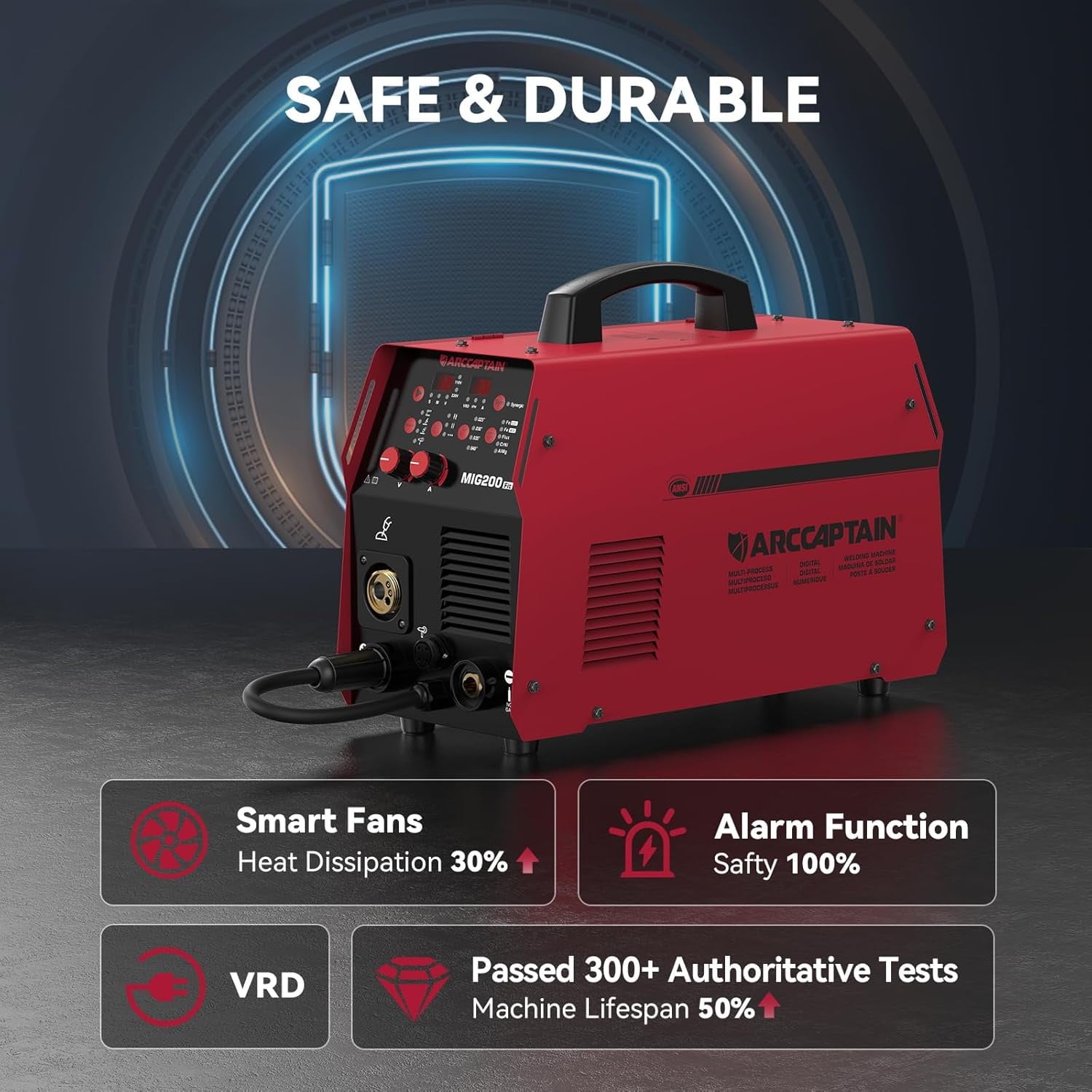 • Advanced Digital Technology & Safety Features: Equipped with a fully digital MCU and a high-integrity circuit, this welder delivers precise control over the welding process for superior results. The intelligent fan system improves heat dissipation by 30%, ensuring the welder operates efficiently even in high temperatures up to 40°C. Multiple safety protections, including VRD, over-current, over-voltage, overload, and overheating protection, ensure reliable performance and safe operation.
