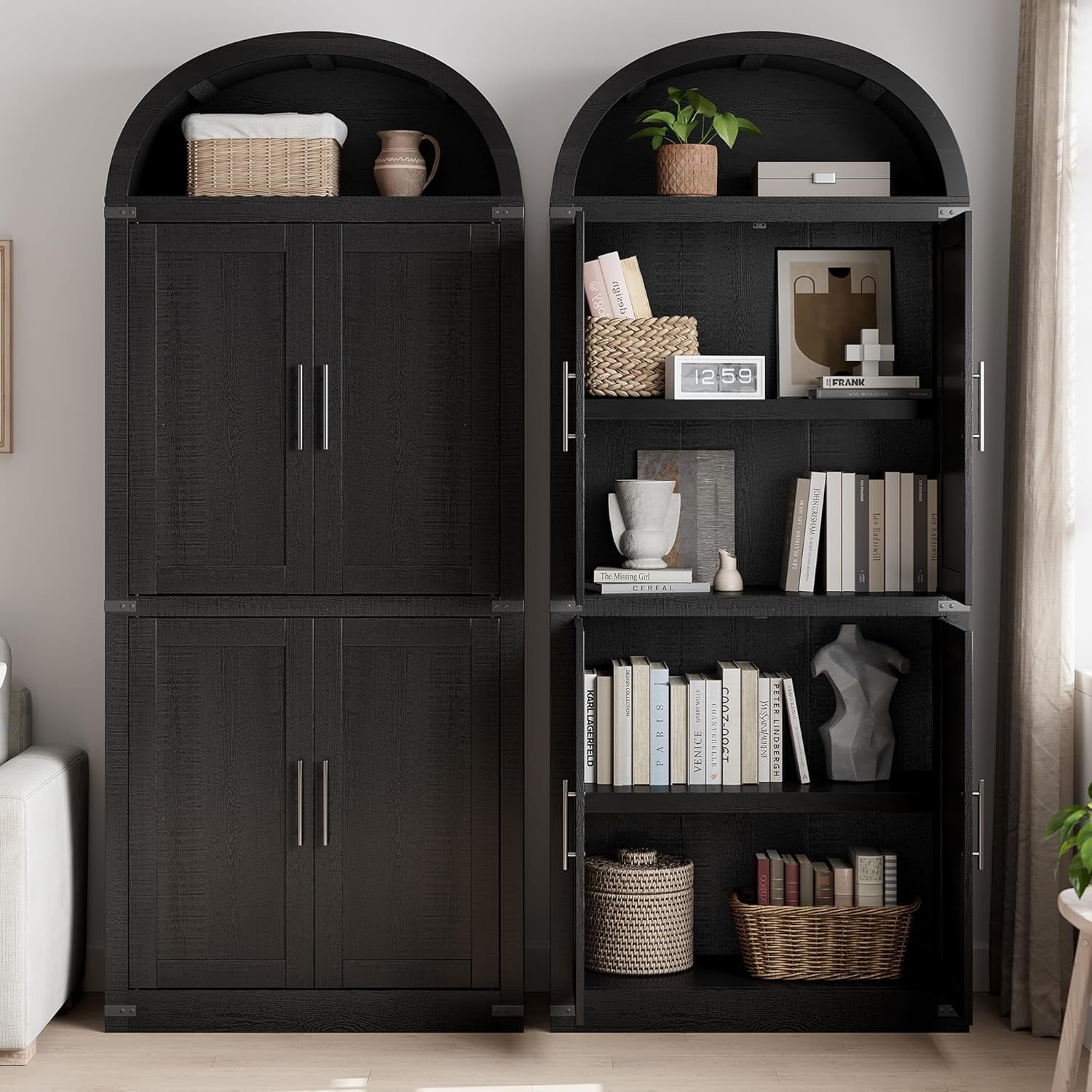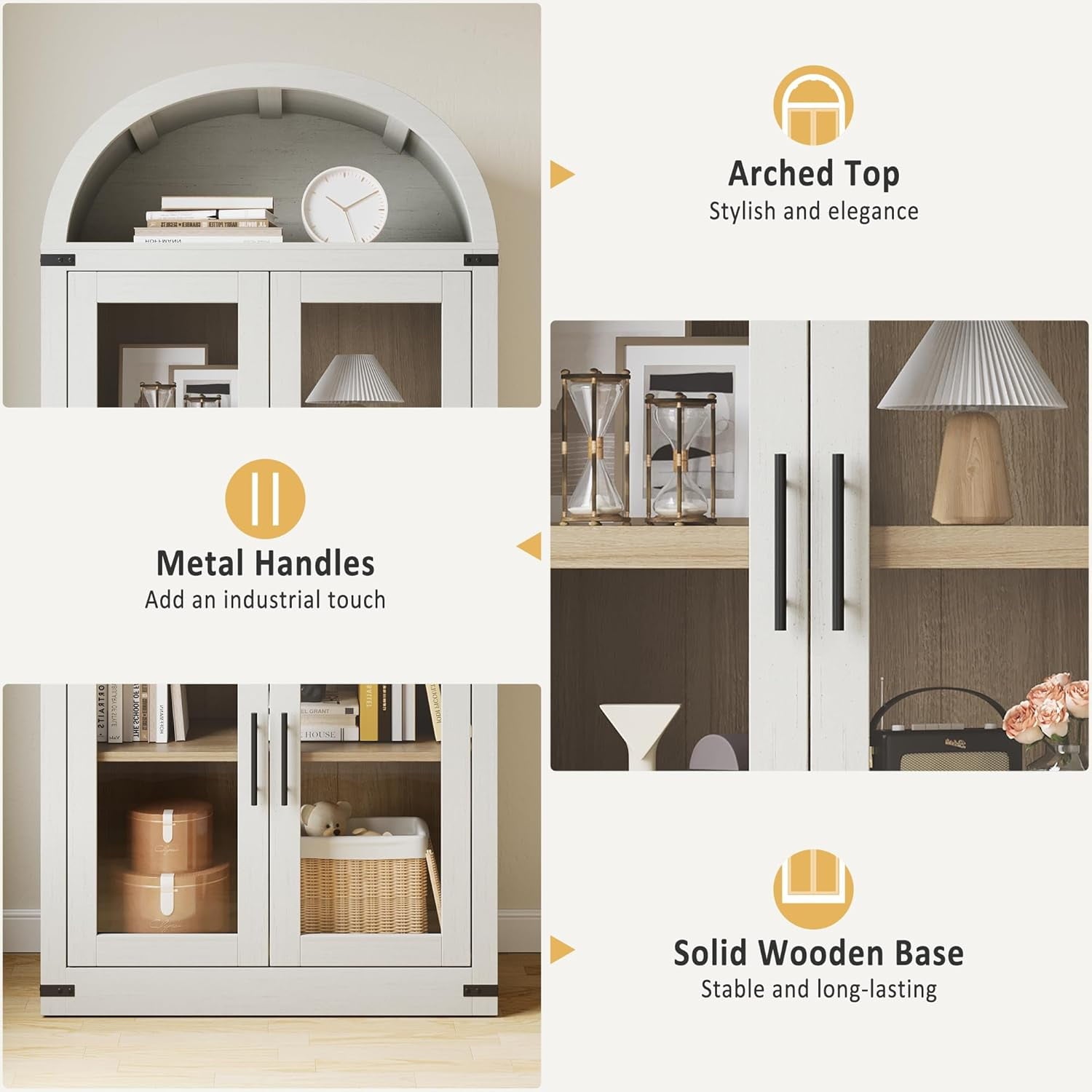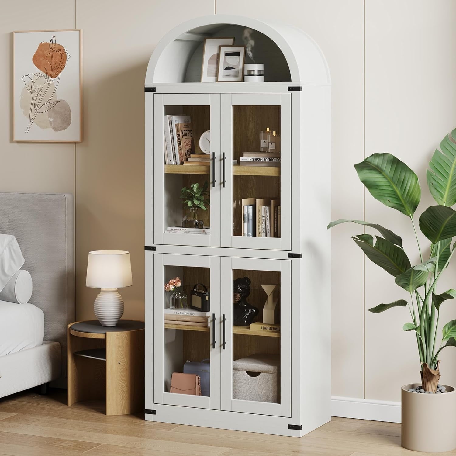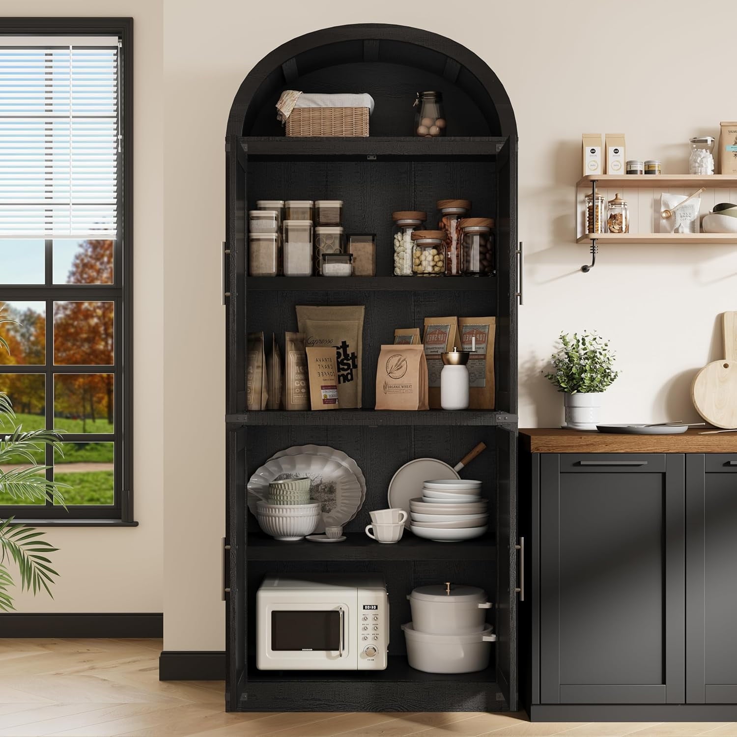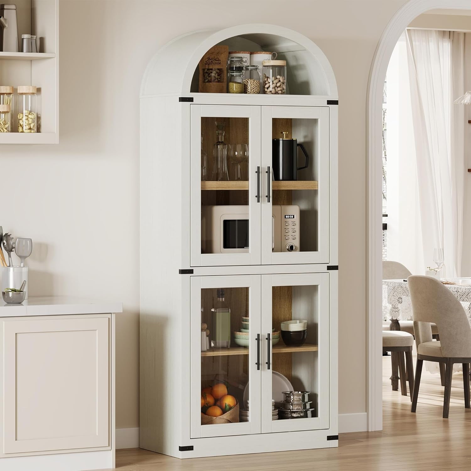 - [Arched Farmhouse Style] This arched pantry cabinet blends farmhouse charm with modern sophistication. Its graceful arched design enhances any kitchen, dining, or living space, adding timeless appeal while offering spacious storage to keep your essentials organized. Versatile and stylish, it’s the perfect blend of beauty and functionality.