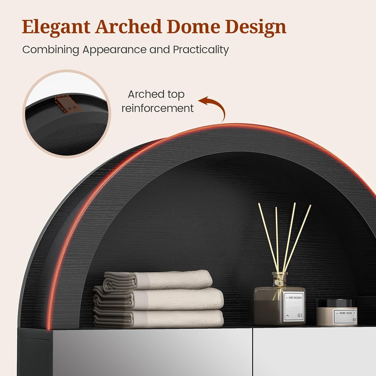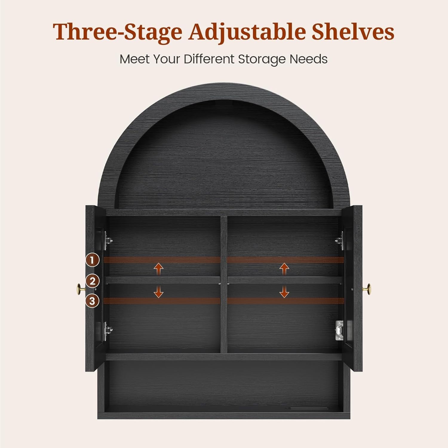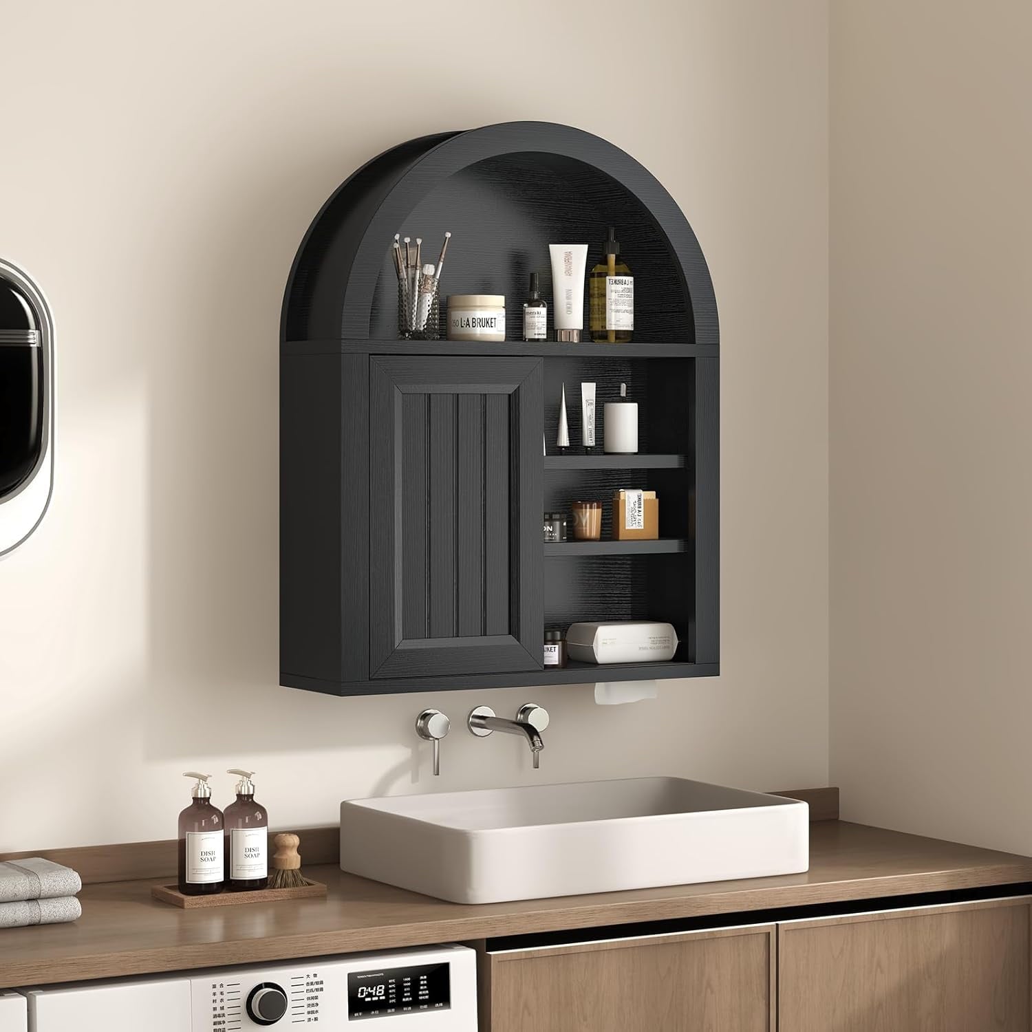 - 【Modern Farmhouse Style】This floating wall mounted bathroom cabinet features a unique arched design with adjustable shelves to save valuable floor space in a cozy bathroom, freeing up space for storing small toiletries and bathroom clutter.
