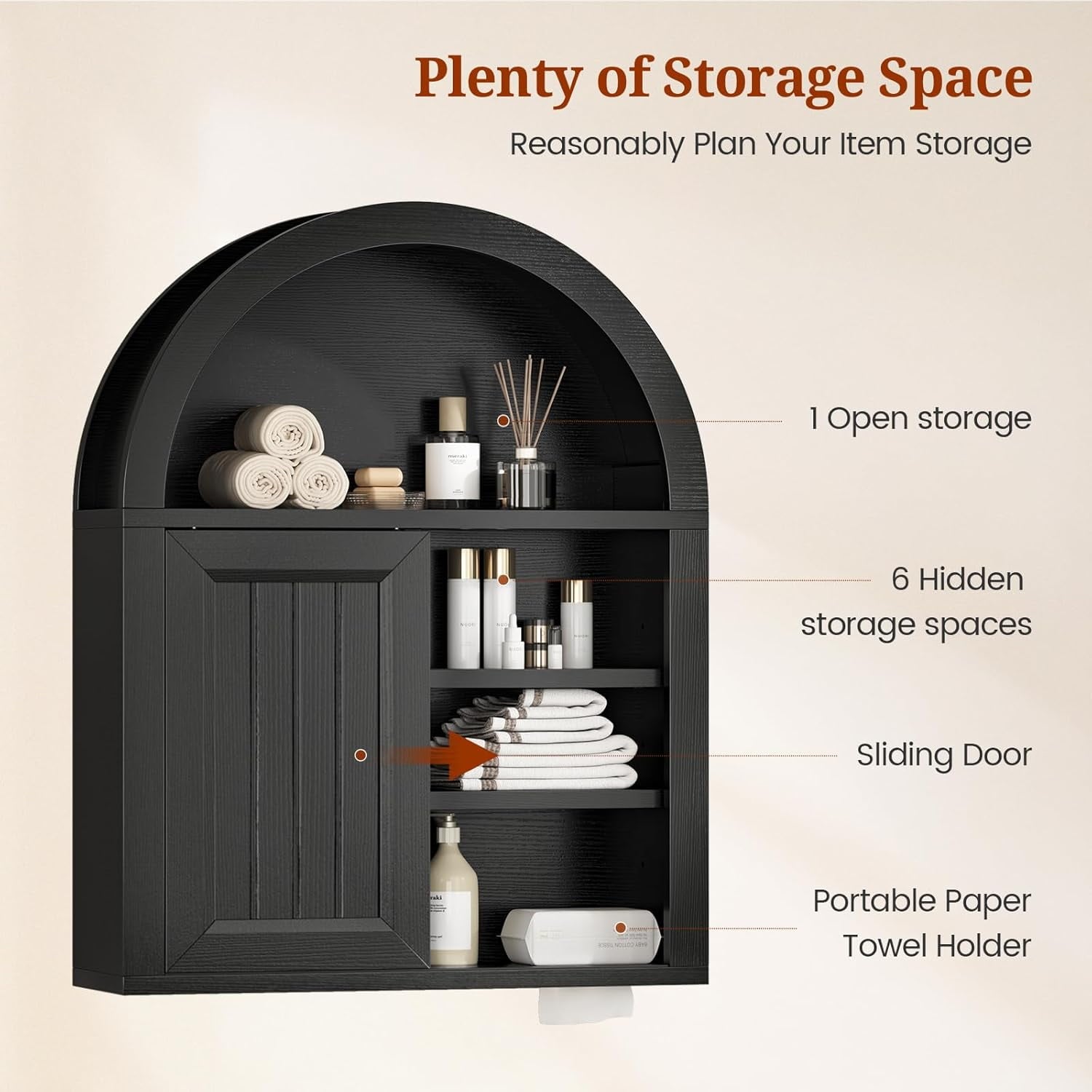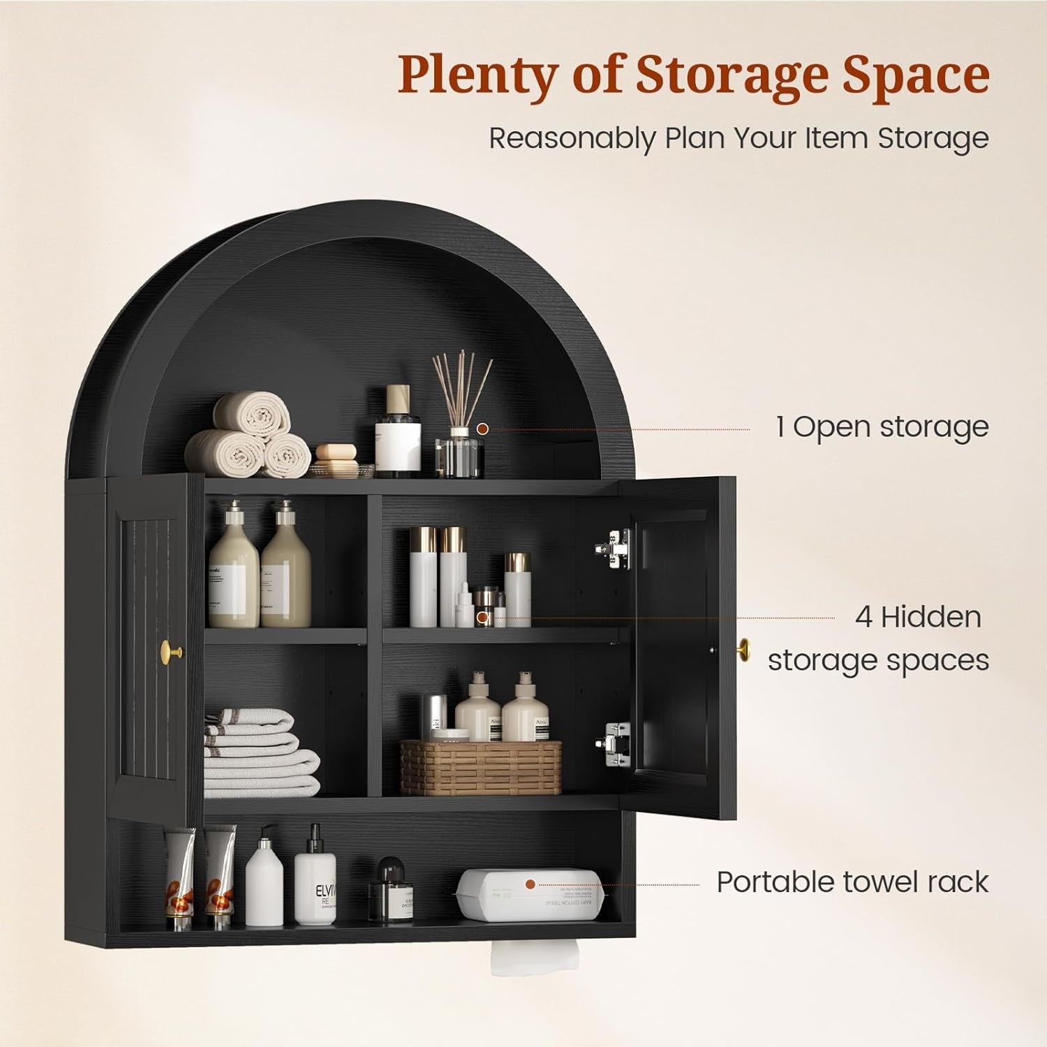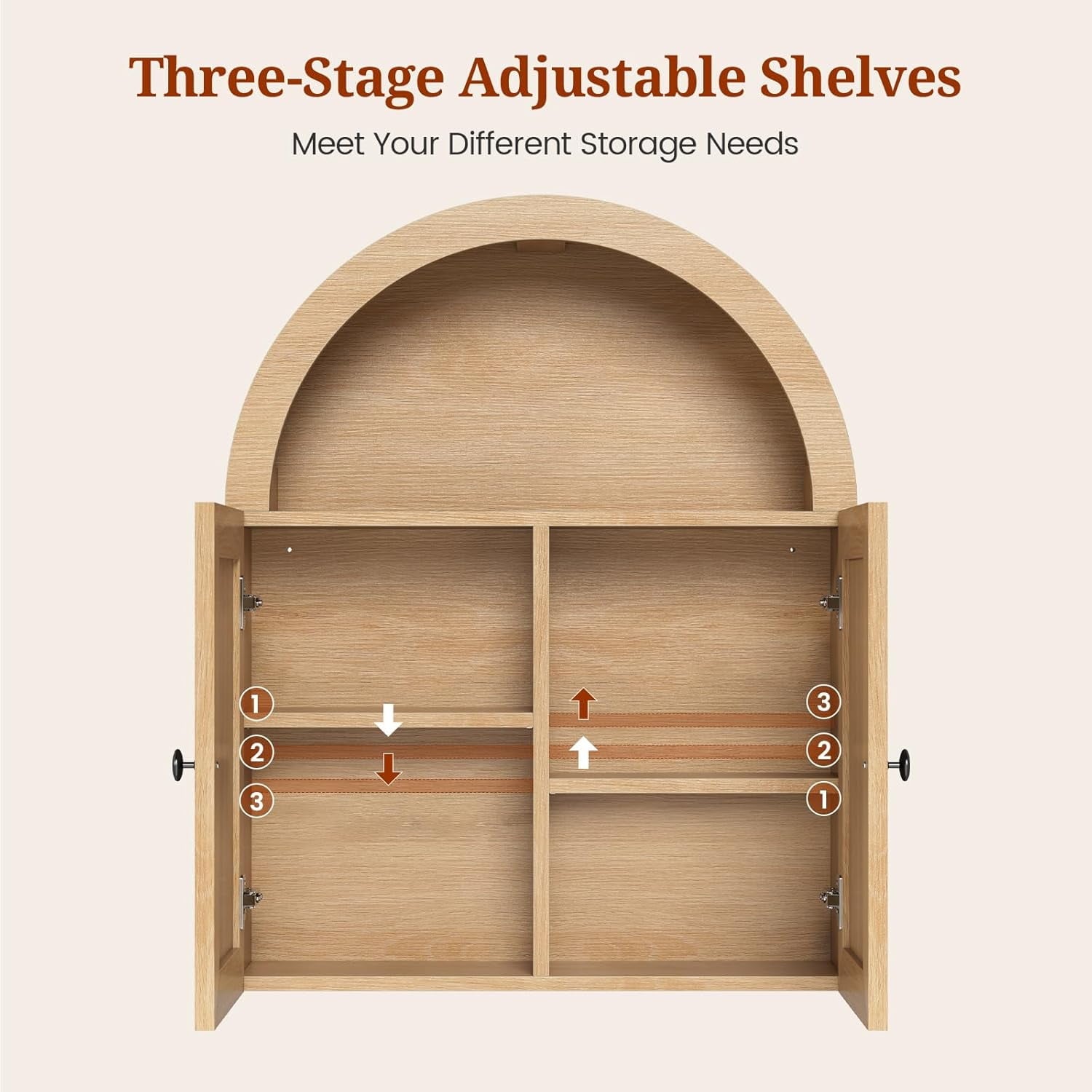 - 【Modern Farmhouse Style】This floating wall mounted bathroom cabinet features a unique arched design with adjustable shelves to save valuable floor space in a cozy bathroom, freeing up space for storing small toiletries and bathroom clutter.