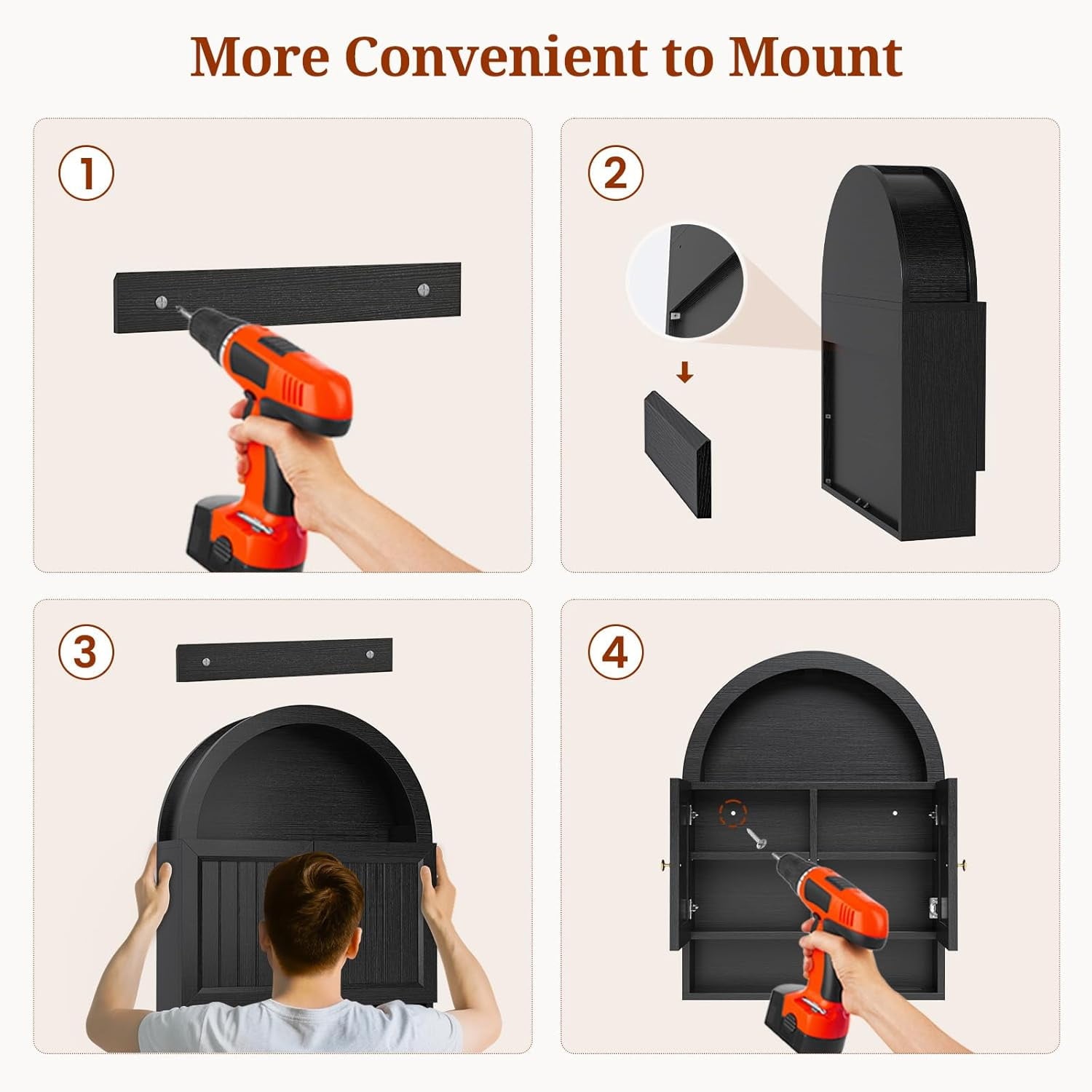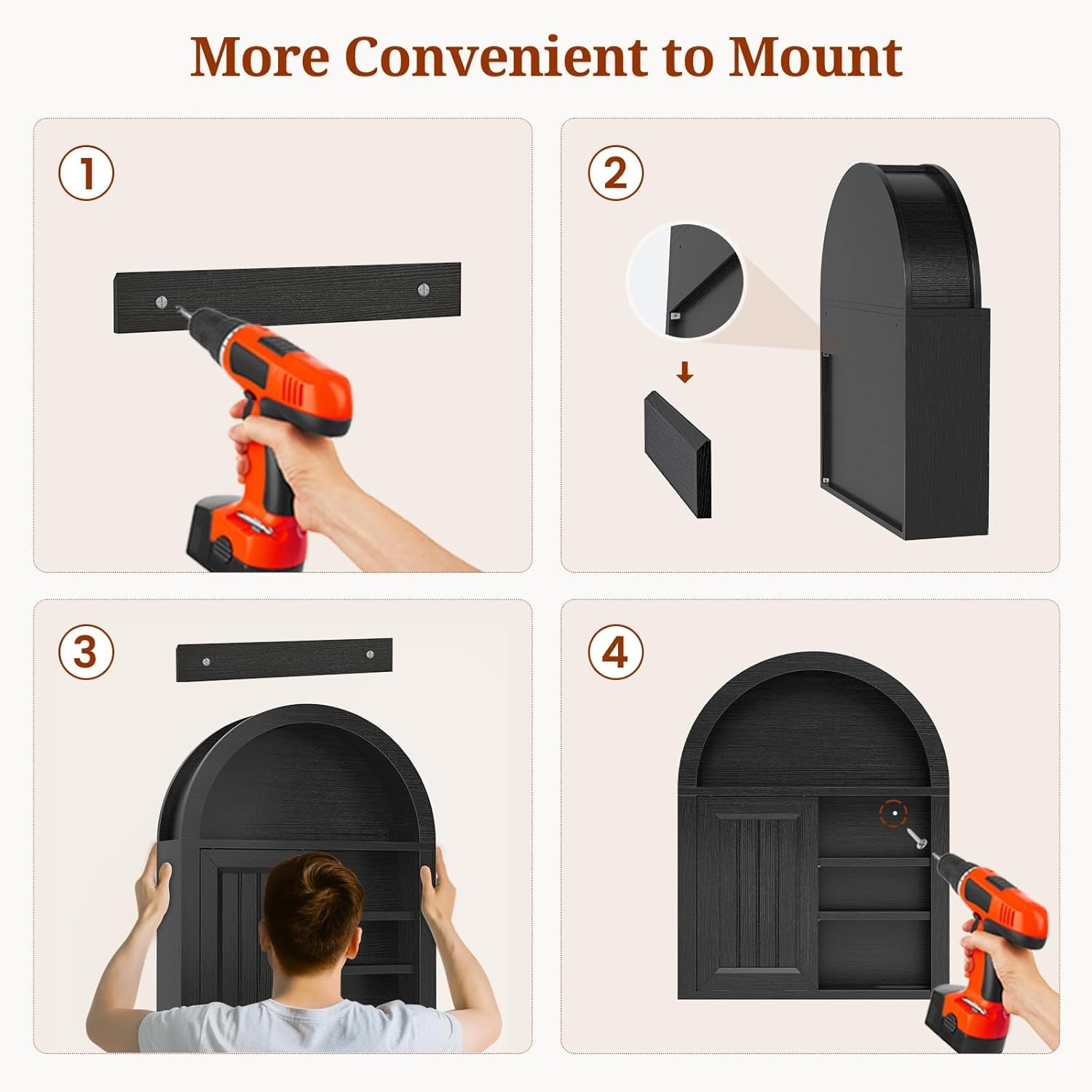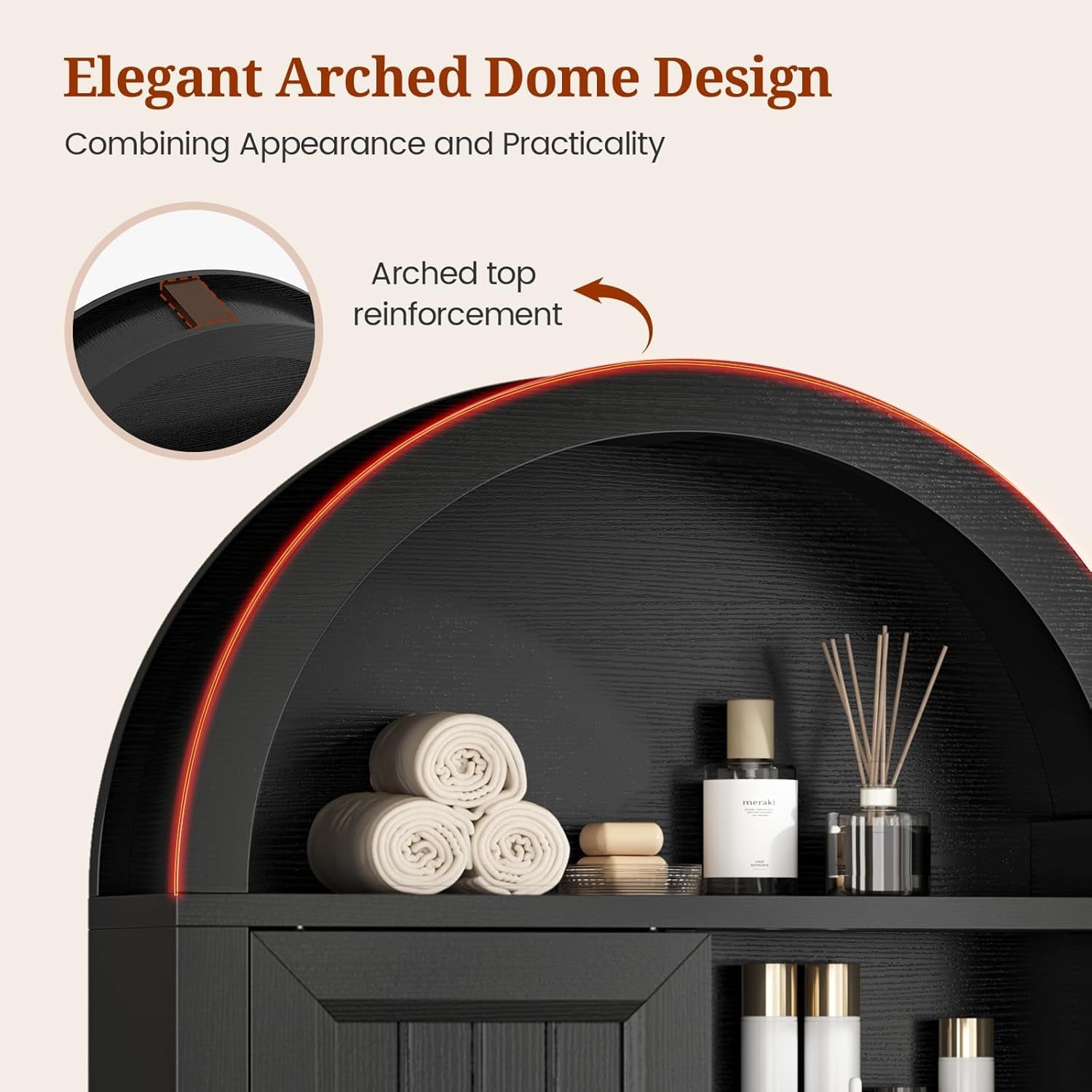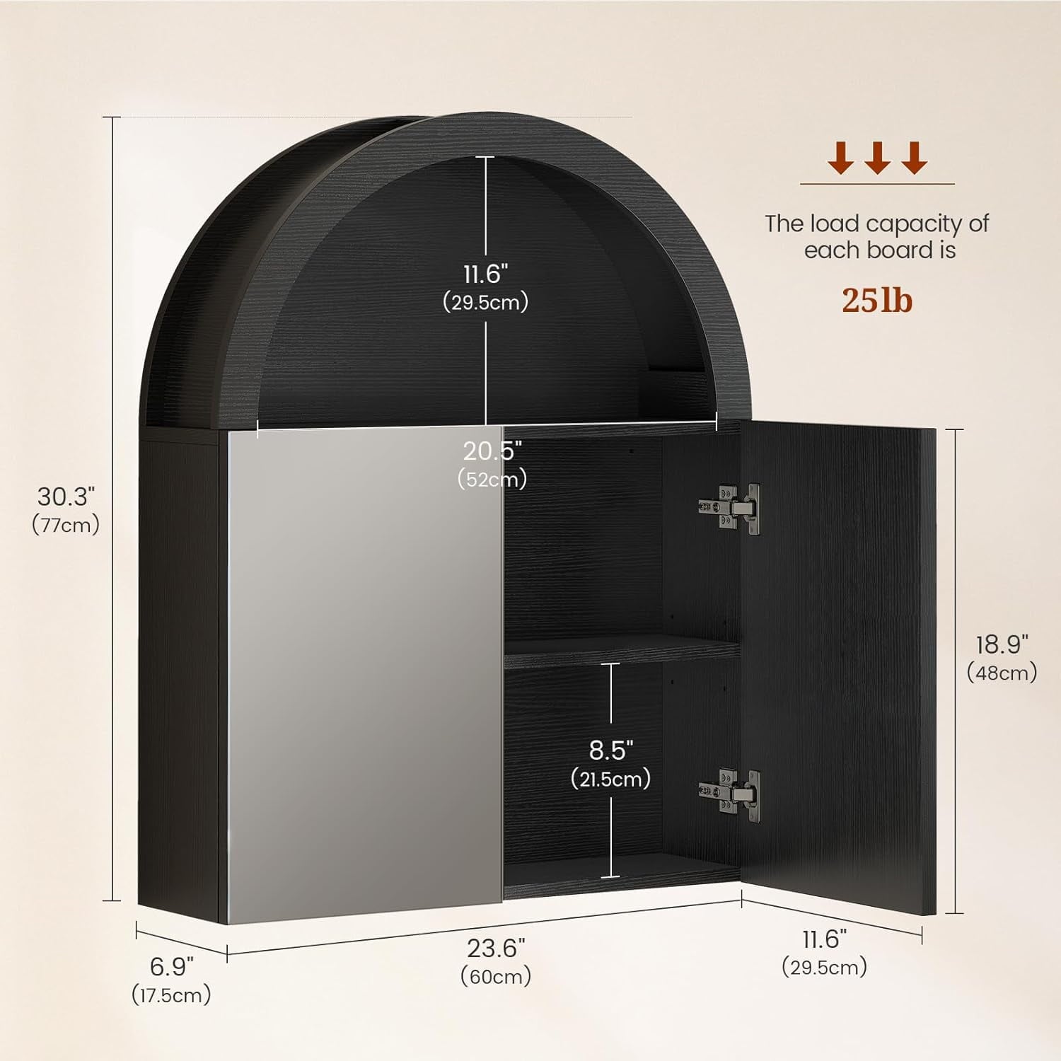 - 【Sturdy and Durable】This black arched wall cabinet is made of high-quality materials, which is sturdy and durable. A combination of multiple materials, high strength, each shelf can bear up to 50 pounds.