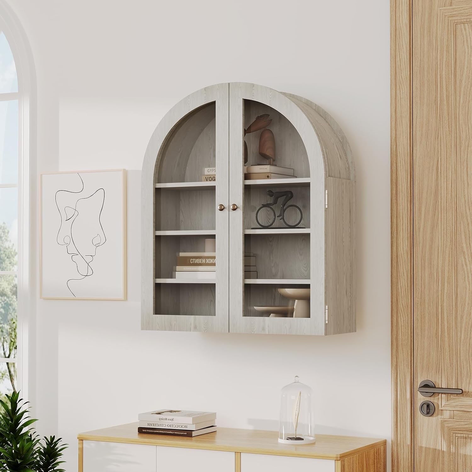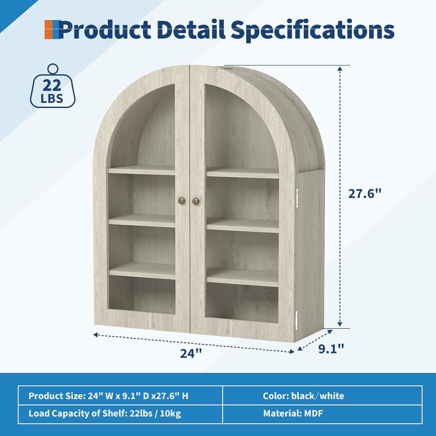 Arched Wall Mounted Bathroom Cabinet with Glass Doors & Adjustable Shelf, Modern 4-Tier Wall Hanging Storage Organizer Medicine Cabinet Hanging Cabinet for Bathroom Livingroom 24″w x 28”h x 9”d