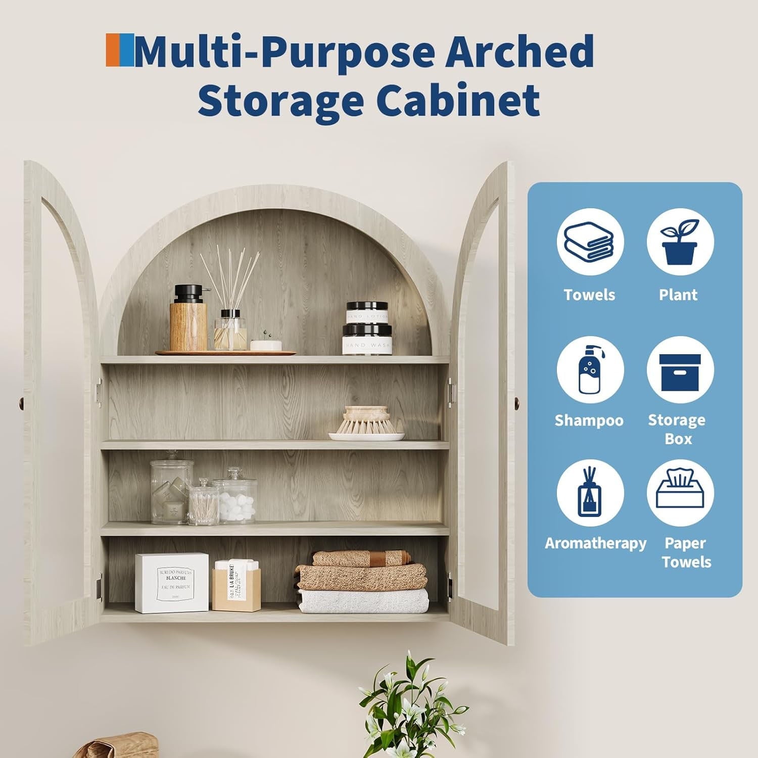Arched Medicine Cabinet, Bathroom Wall Mounted Cabinet Over Toilet Storage Organizer with Acrylic Doors Removable Shelf for Laundry Room Kitchen Living Room, Natural