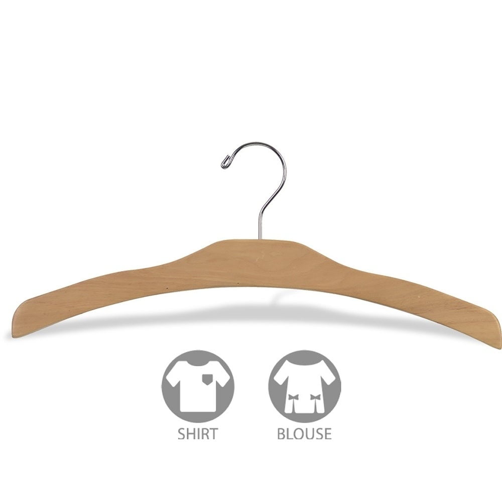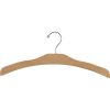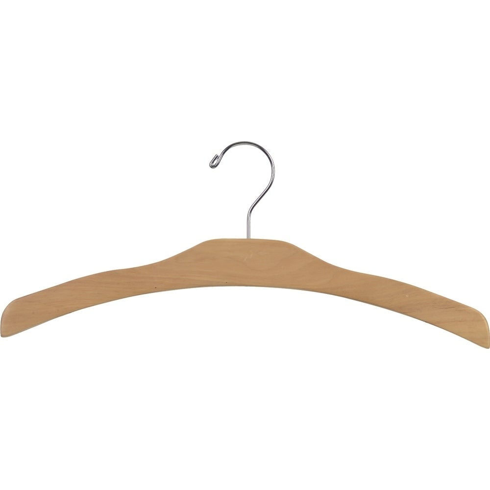 These richly designed hardwood hangers feature a strong space-saving flat body and a polished chrome swivel hook. Manufactured as one solid piece of wood, they are finished with a double coating of lacquer to prevent splintering. These elegant hangers are ideal for tops of all kinds including wide necked blouses and large shirts. These high quality, low cost hangers are manufactured to last you for a lifetime.Fine Hardwood – Flat Body – Length: 17″ – 3/8″ – Natural Lacquer Finish – Polished Chrome Hardware