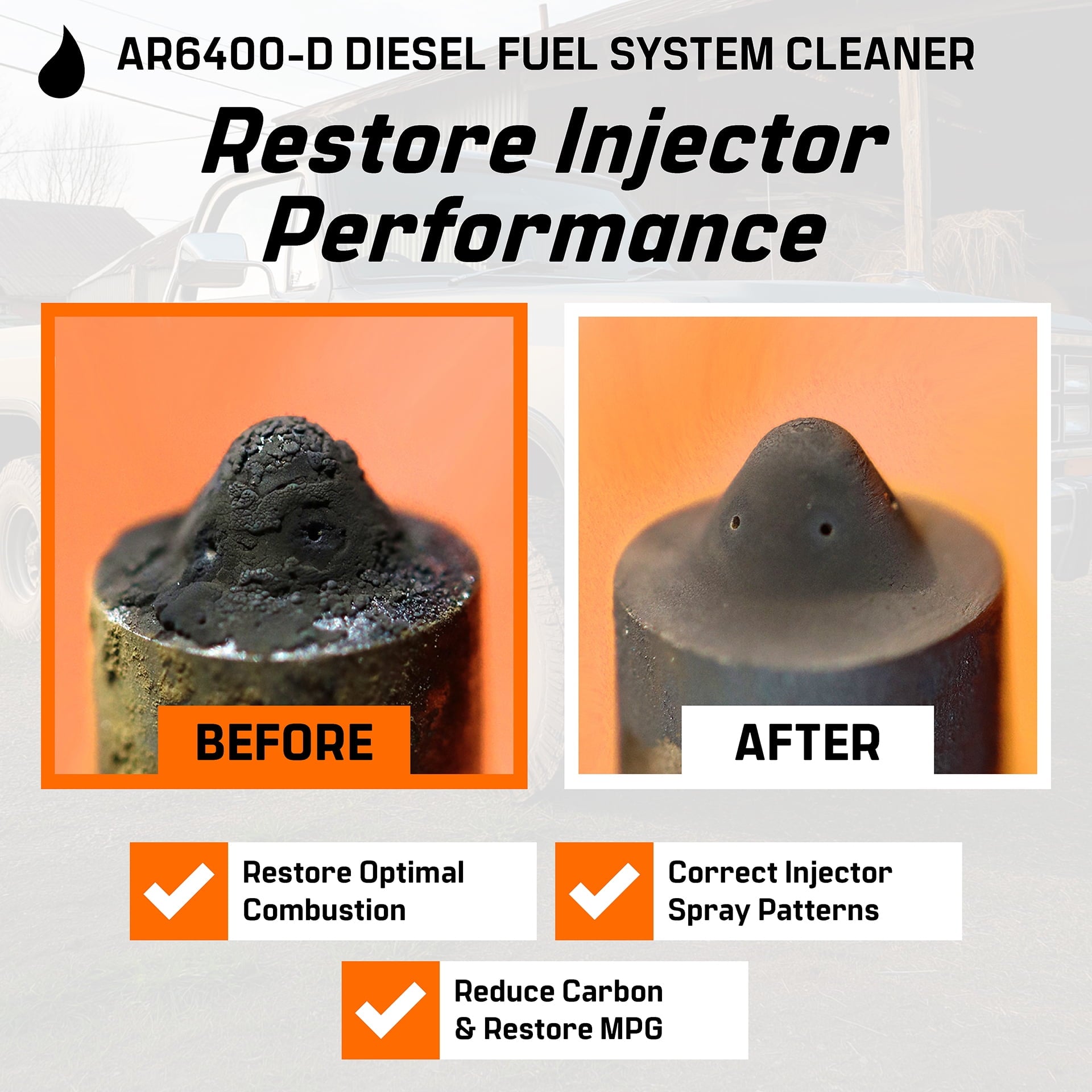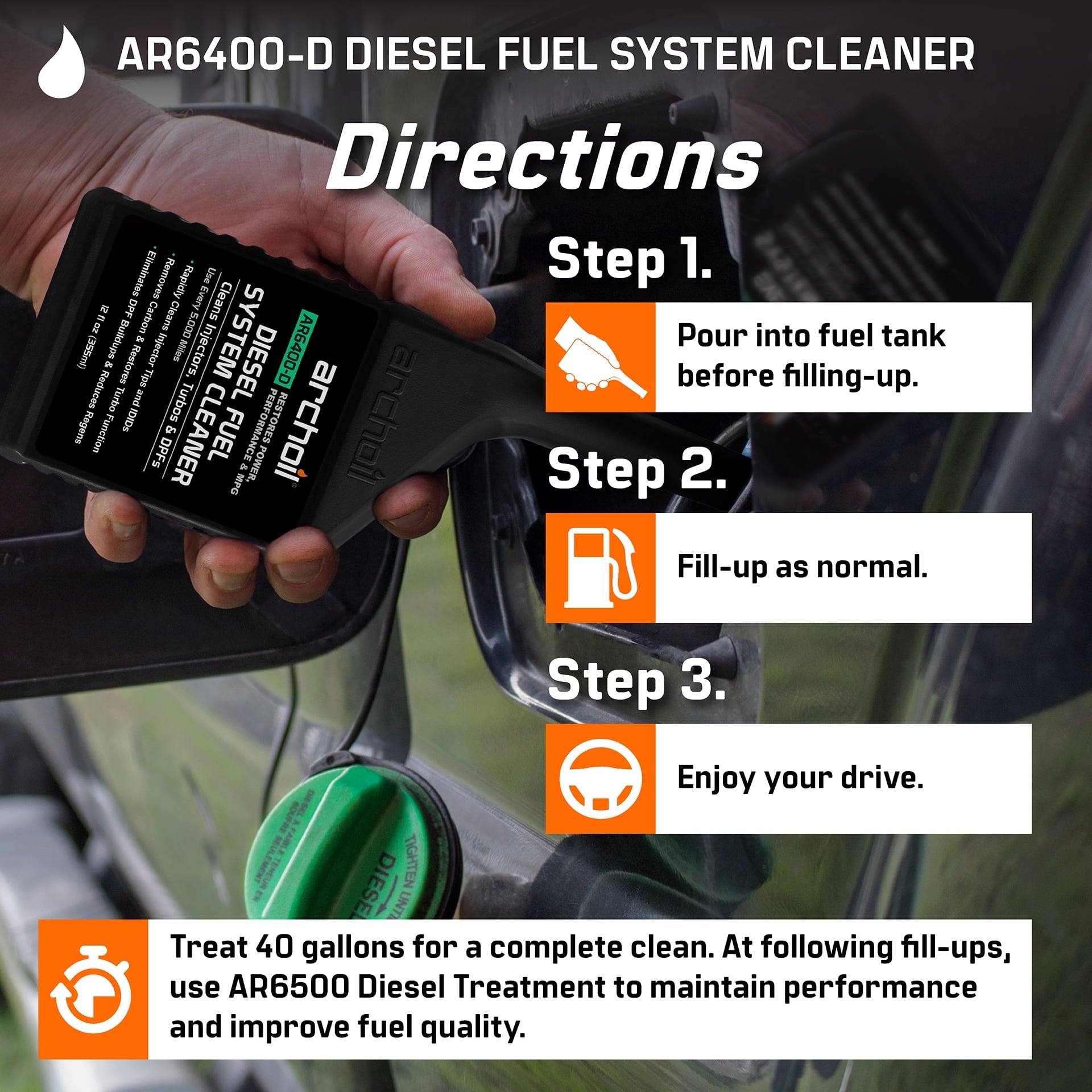 Archoil AR6400-D Diesel Fuel System Cleaner rapidly cleans injectors, the turbo & DPF to restore power, performance and MPG. Experience restored performance, improved fuel economy and smoother idling as a result of cleaning the fuel system with AR6400-D. Follow up with AR6500 Diesel treatment at every fill-up to continue cleaning and increase cetane for more power.