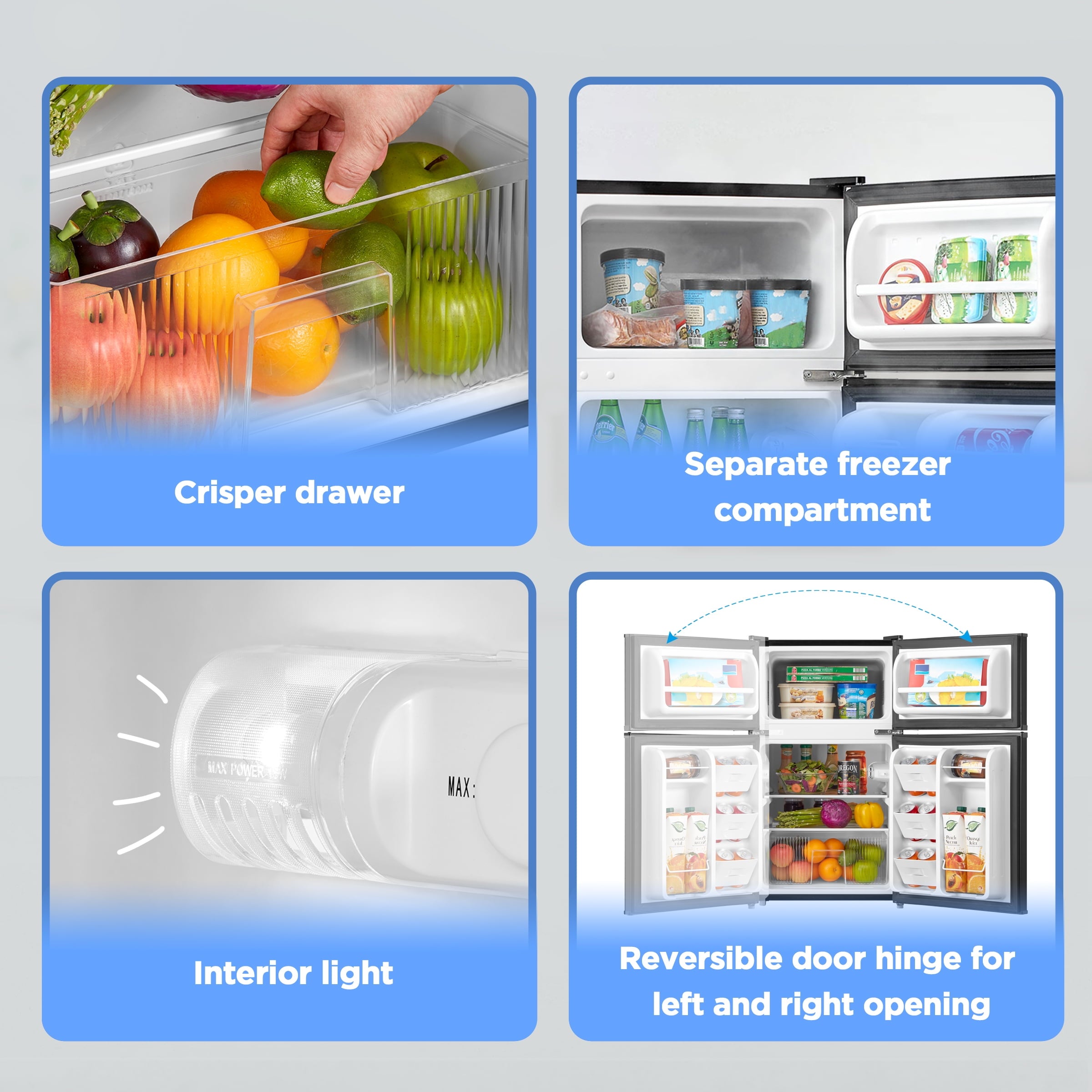 • The standard mini fridge’s separate freezer compartment allows you to store frozen goods, such as ice cream, frozen meals, and ice cubes, keeping them easily accessible alongside your refrigerated items.
