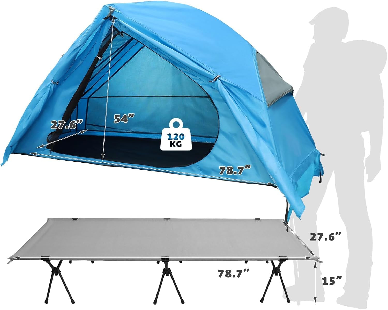 • Combination of Tent & Sleeping Cot: This camping setup includes both a tent and an elevated sleeping cot, which can be used together or separately. The tent features a durable bottom fabric to keep you insulated from the ground when used alone.    Designed specifically for one person, the cot measures 78.7″ x 27.6″.